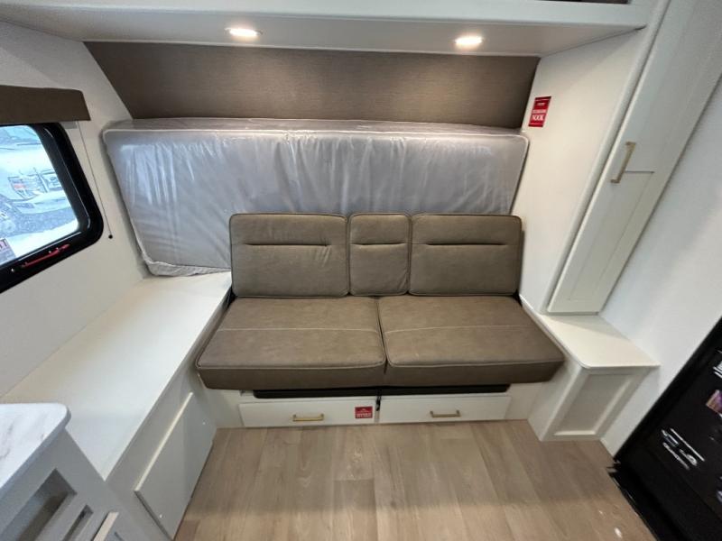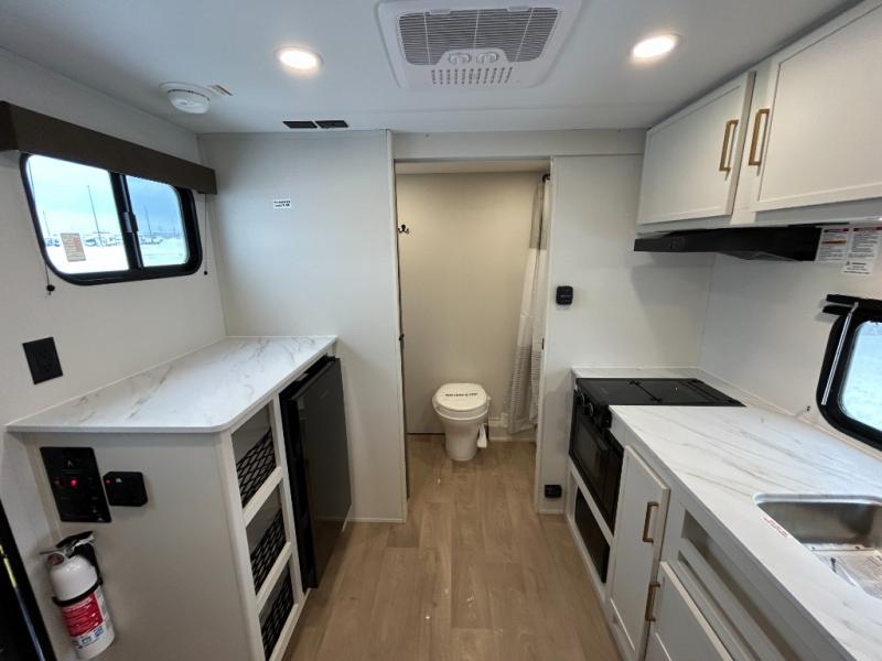 Travel in this 131DL model and step inside through the sturdy aluminum entry steps and you'll be greeted by a versatile 60" x 80" Murphy bed that doubles as a comfortable seating area during the day—perfect for relaxing with your furry companion, thanks to the included pet dish. In the center, the kitchen offers all the essentials for preparing a delicious meal, featuring a microwave, 2-burner range, 3.3 cu. ft. refrigerator, and overhead cabinets for added storage. At the rear, enjoy the convenience of a full bathroom complete with a walk-in shower and foot-flush toilet, making life on the road both comfortable and functional.