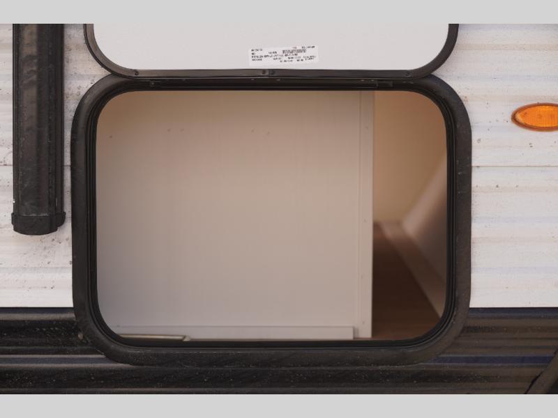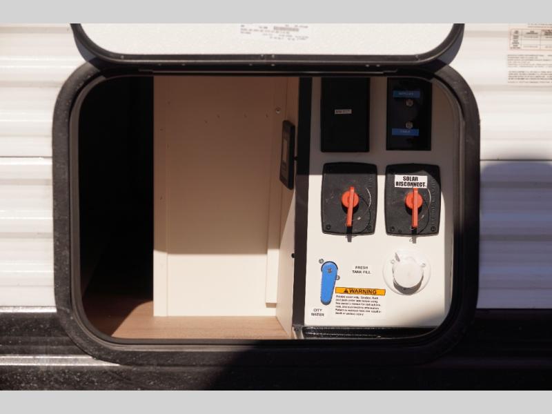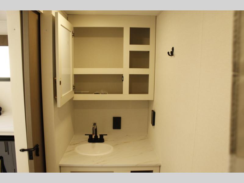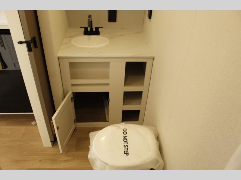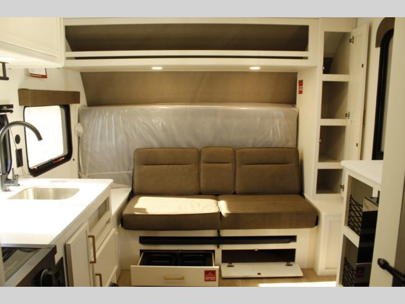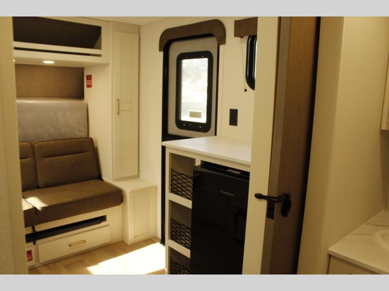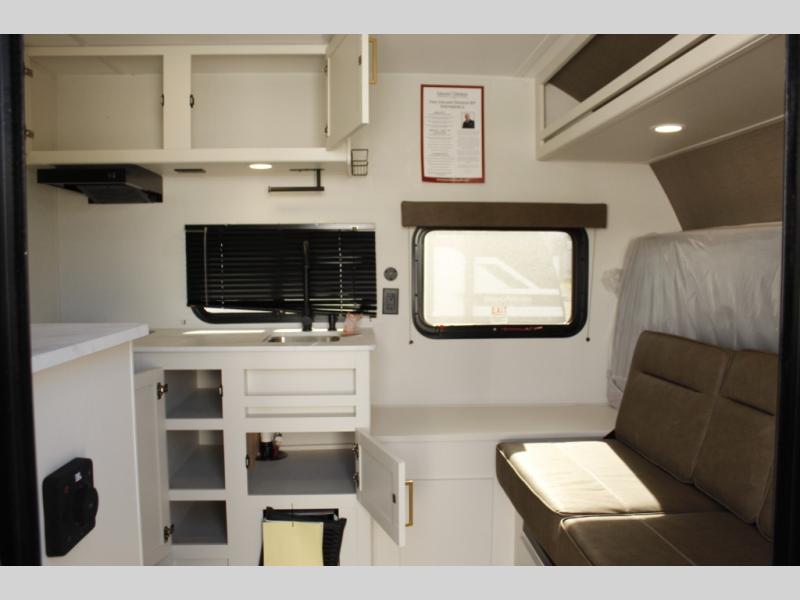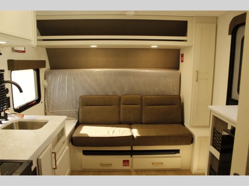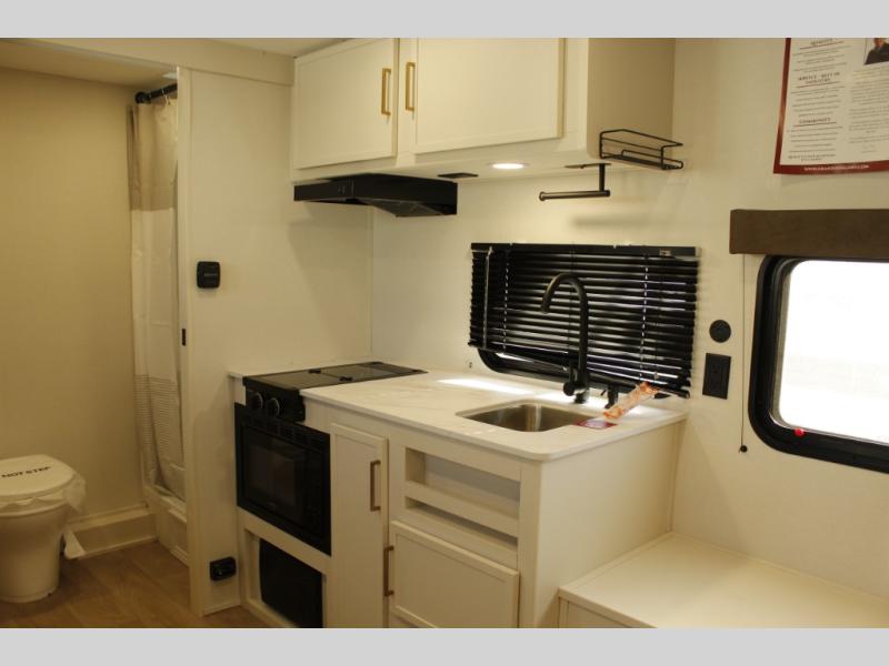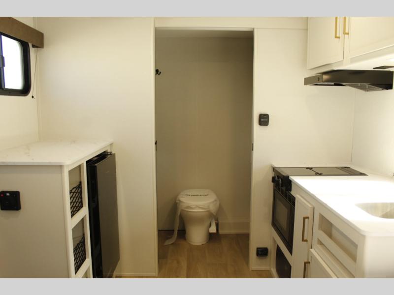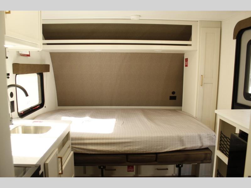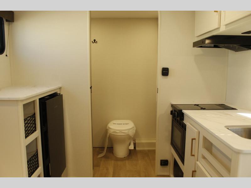 Travel in this 131DL model and step inside through the sturdy aluminum entry steps and you'll be greeted by a versatile 60" x 80" Murphy bed that doubles as a comfortable seating area during the day—perfect for relaxing with your furry companion, thanks to the included pet dish. In the center, the kitchen offers all the essentials for preparing a delicious meal, featuring a microwave, 2-burner range, 3.3 cu. ft. refrigerator, and overhead cabinets for added storage. At the rear, enjoy the convenience of a full bathroom complete with a walk-in shower and foot-flush toilet, making life on the road both comfortable and functional.