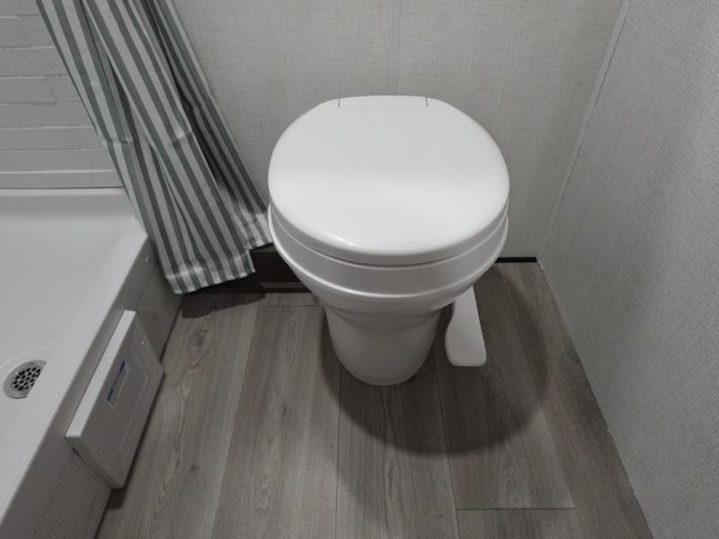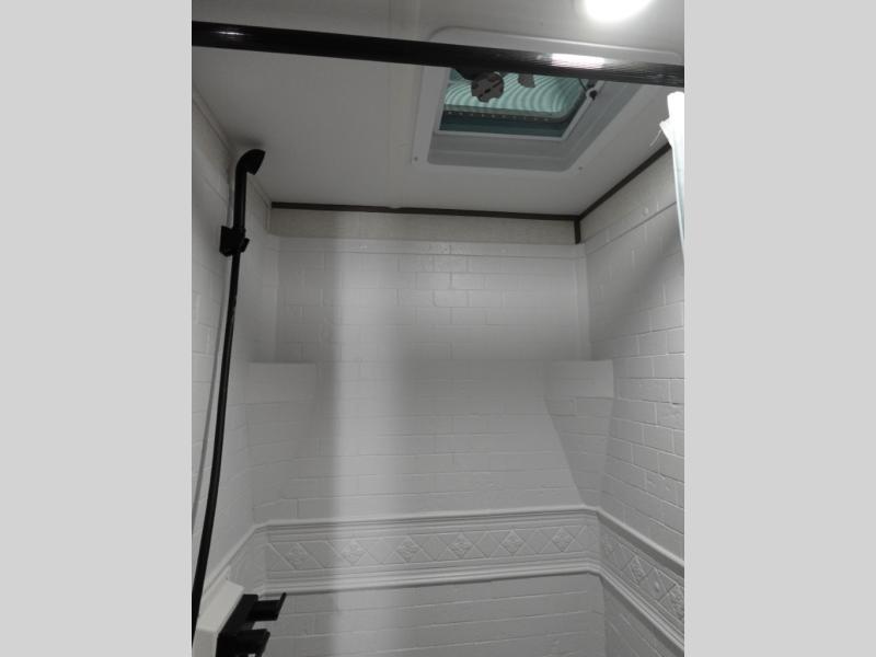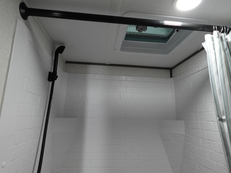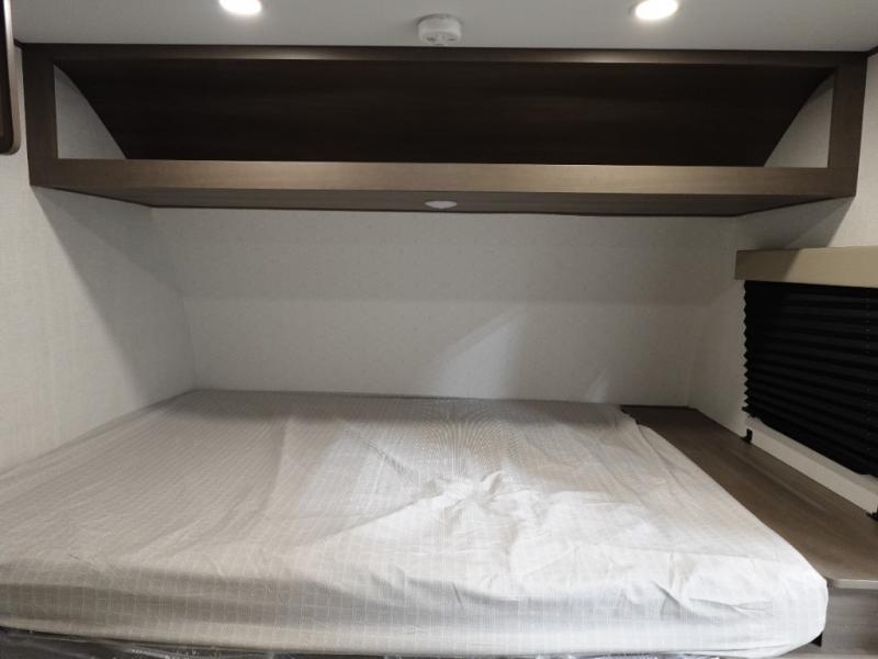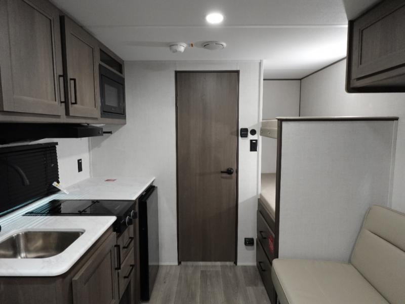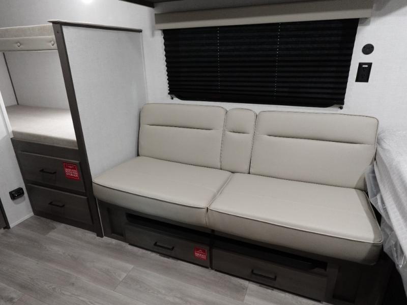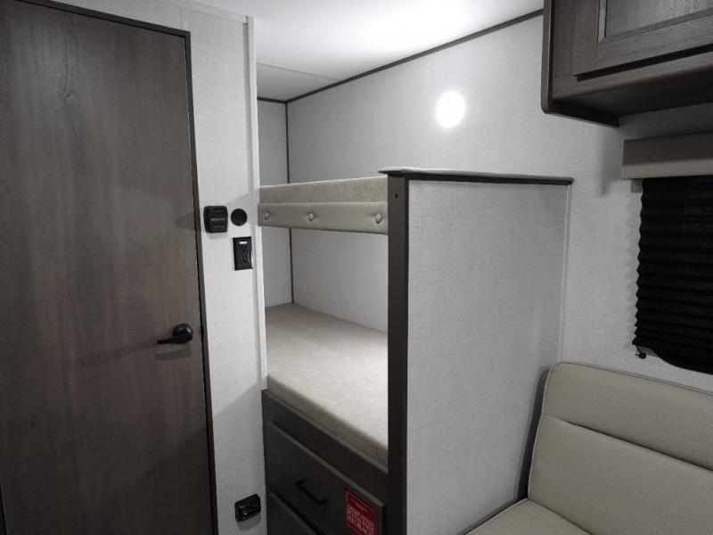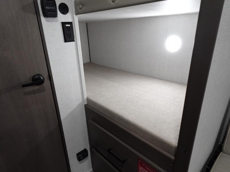 Camping trips to the lake have never been easier than with this travel trailer! The 28" x 67" bunks are right next to the private bath for easy nighttime use, and the front queen bed includes hidden storage for your things. There is also a 66" Jack knife sofa that provides a little more sleeping space for guests. A full kitchen lets you cook meals each day and there is an exterior LP quick connect if you want to fire up your own propane grill.