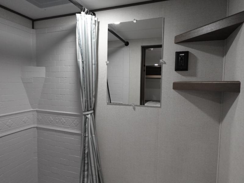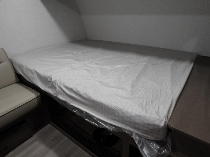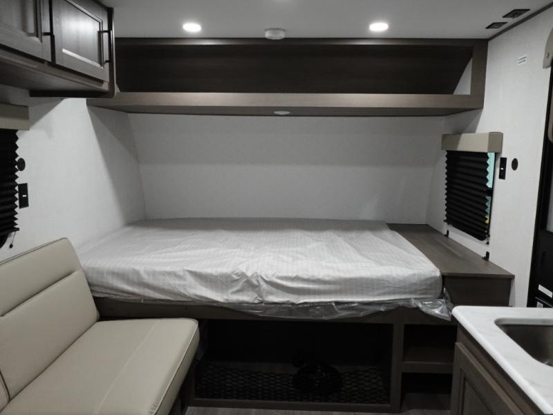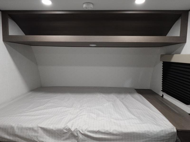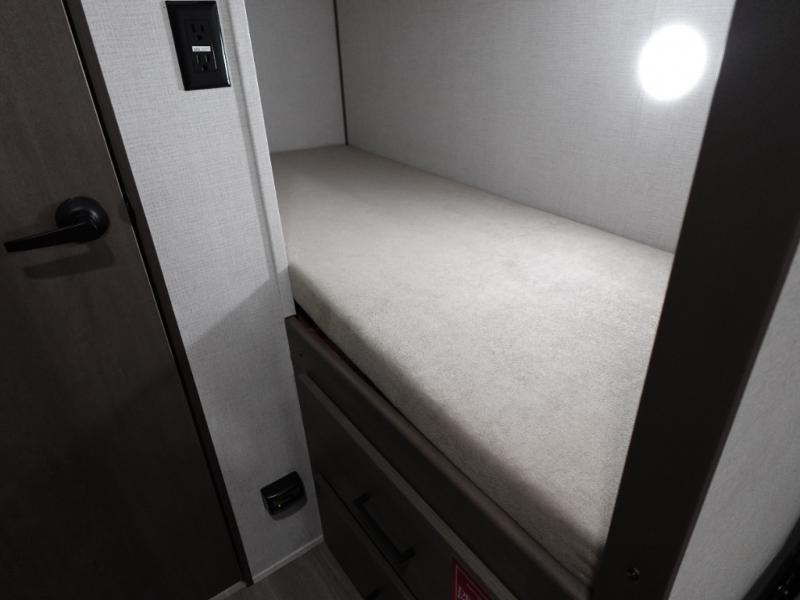 Camping trips to the lake have never been easier than with this travel trailer! The 28" x 67" bunks are right next to the private bath for easy nighttime use, and the front queen bed includes hidden storage for your things. There is also a 66" Jack knife sofa that provides a little more sleeping space for guests. A full kitchen lets you cook meals each day and there is an exterior LP quick connect if you want to fire up your own propane grill.