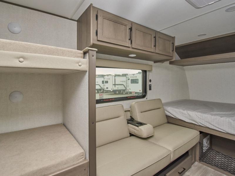 Experience effortless lake getaways with the 2026 Transcend One 151BH, featuring spacious bunk beds and a 10' power awning with Fusion lighting for ultimate comfort and convenience.