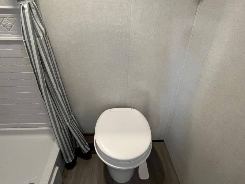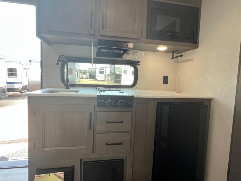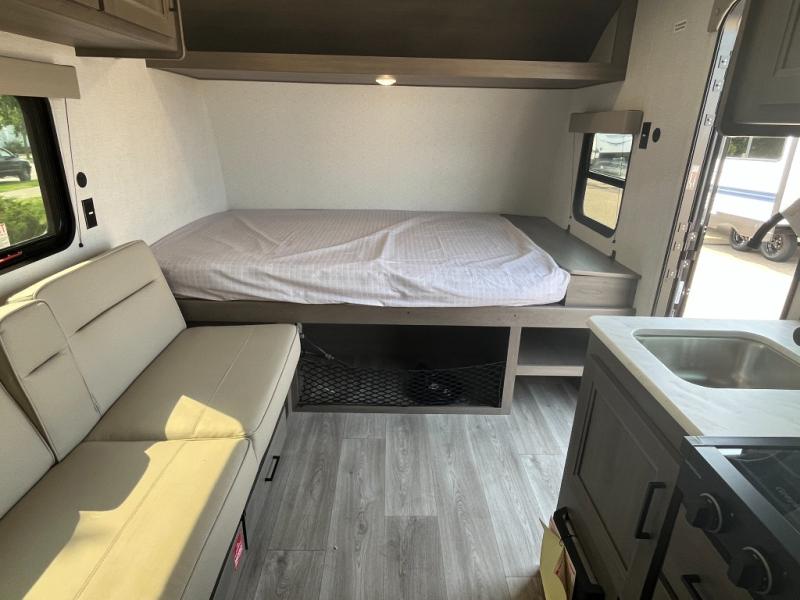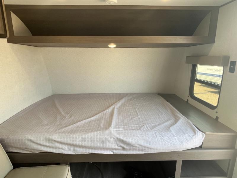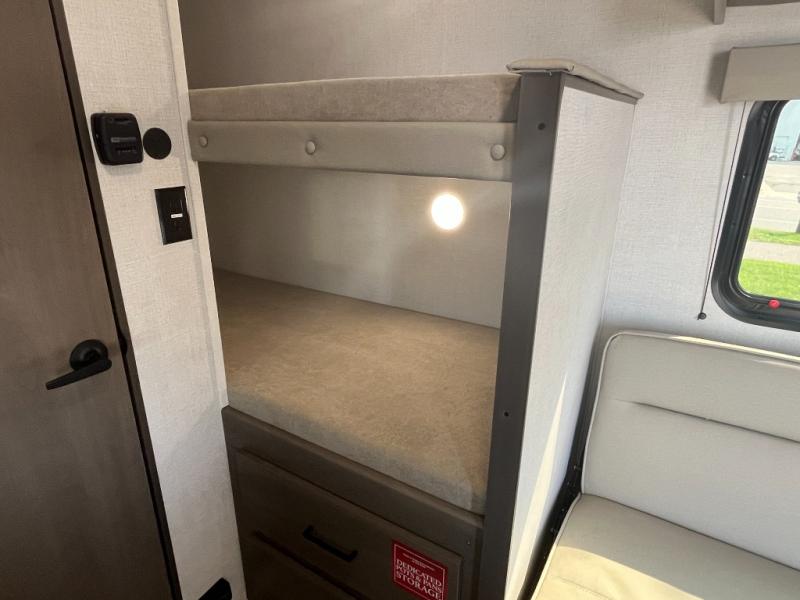 Camping trips to the lake have never been easier than with this travel trailer! The 28" x 67" bunks are right next to the private bath for easy nighttime use, and the front queen bed includes hidden storage for your things. There is also a 66" Jack knife sofa that provides a little more sleeping space for guests. A full kitchen lets you cook meals each day and there is an exterior LP quick connect if you want to fire up your own propane grill.