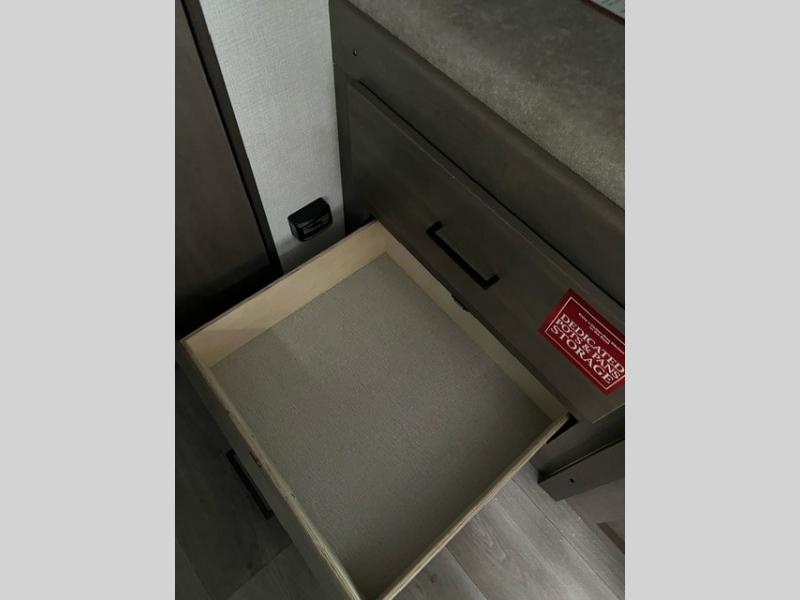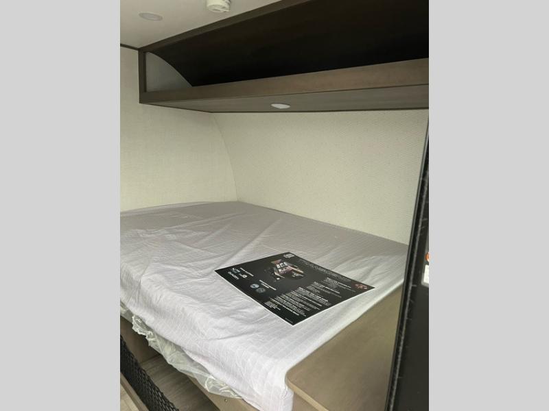 Camping trips to the lake have never been easier than with this travel trailer! The 28" x 67" bunks are right next to the private bath for easy nighttime use, and the front queen bed includes hidden storage for your things. There is also a 66" Jack knife sofa that provides a little more sleeping space for guests. A full kitchen lets you cook meals each day and there is an exterior LP quick connect if you want to fire up your own propane grill.
