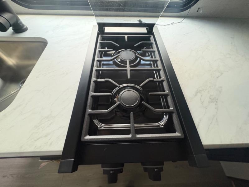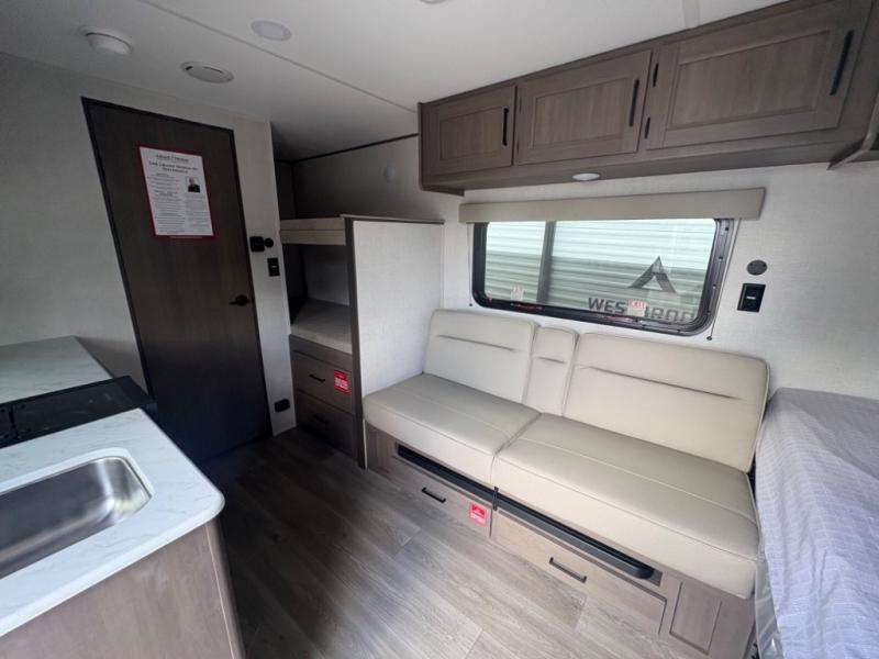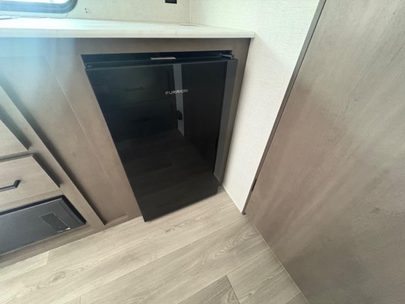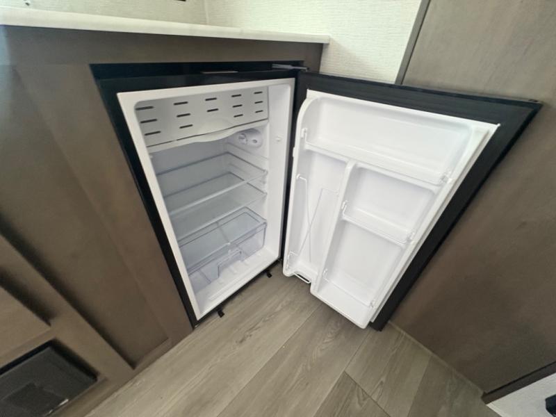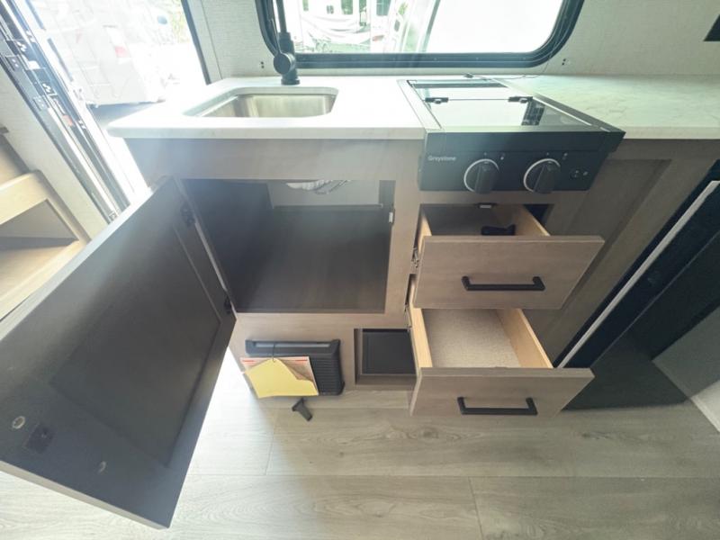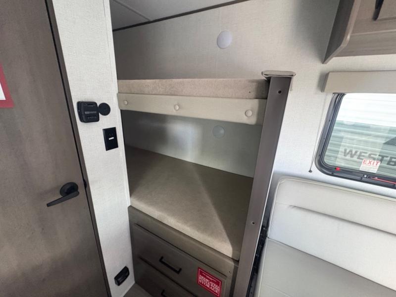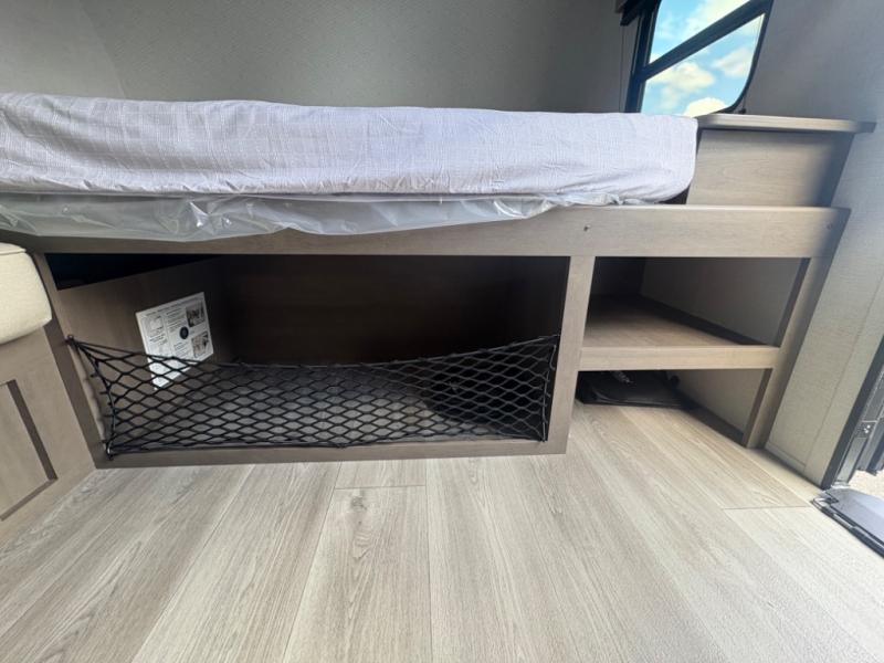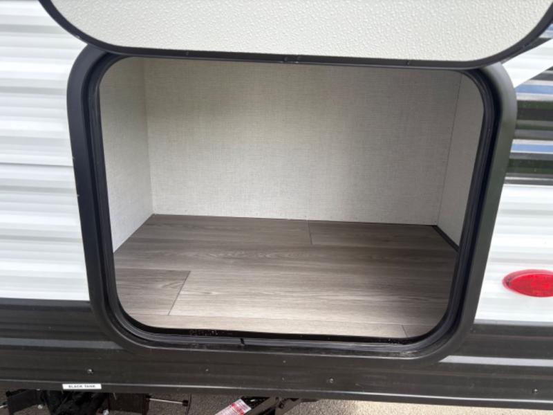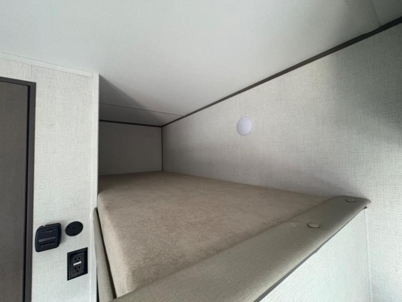 Camping trips to the lake have never been easier than with this travel trailer! The 28" x 67" bunks are right next to the private bath for easy nighttime use, and the front queen bed includes hidden storage for your things. There is also a 66" Jack knife sofa that provides a little more sleeping space for guests. A full kitchen lets you cook meals each day and there is an exterior LP quick connect if you want to fire up your own propane grill.