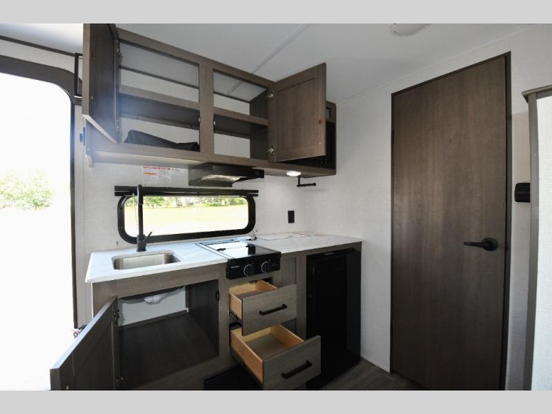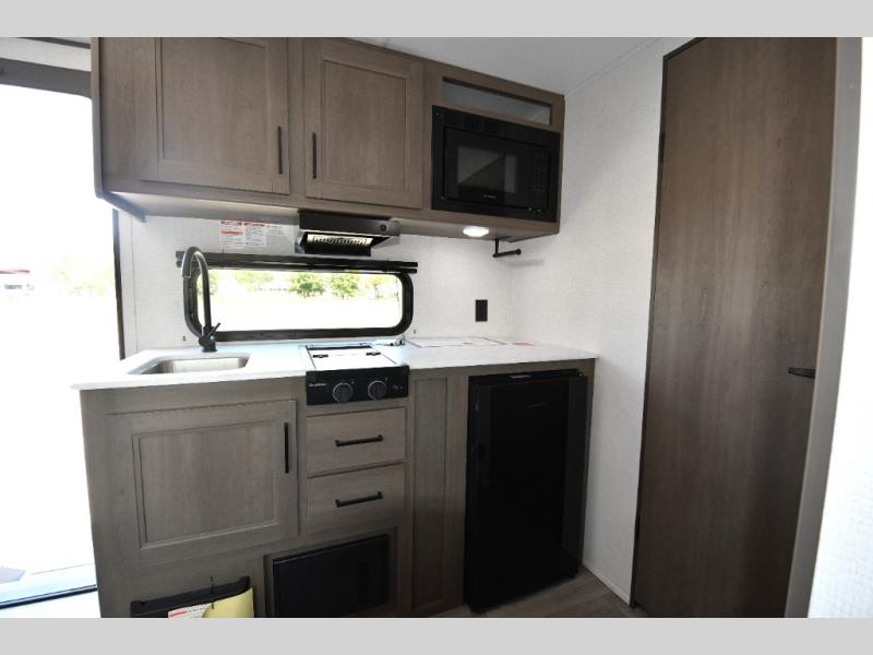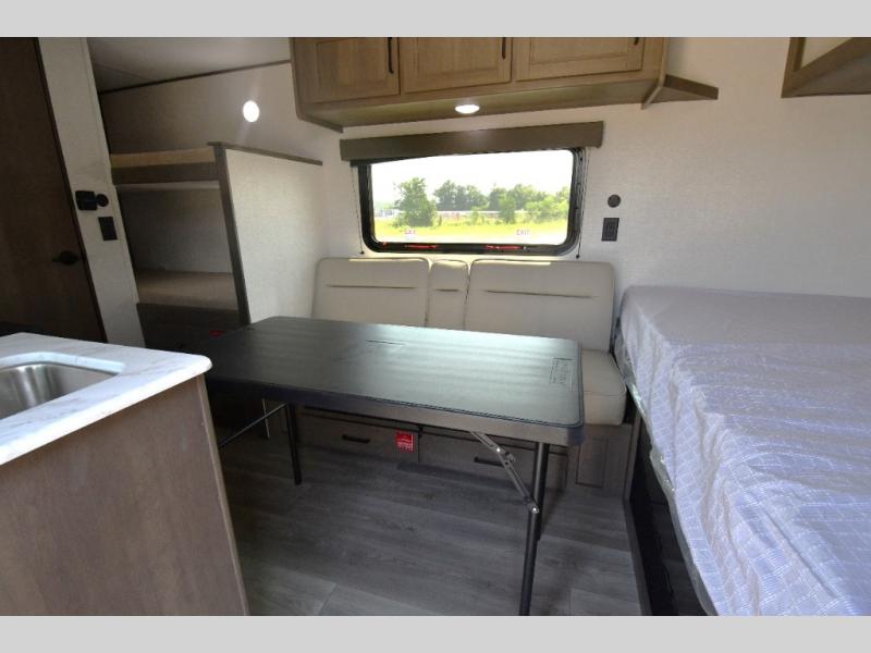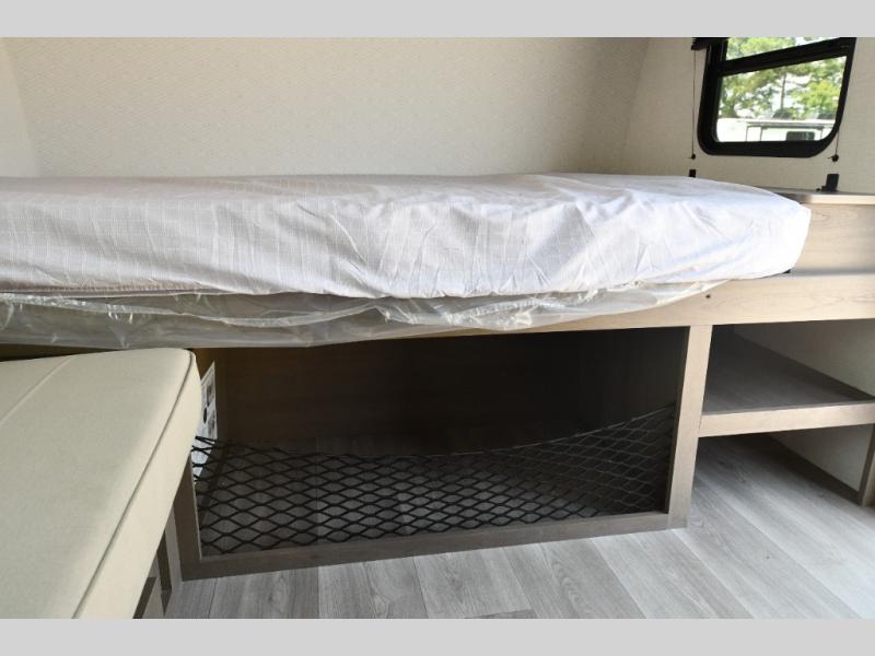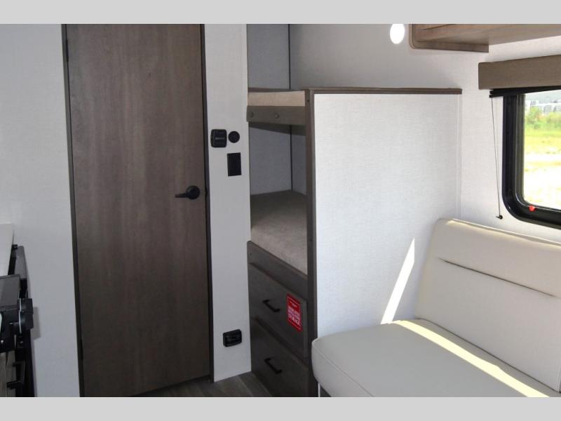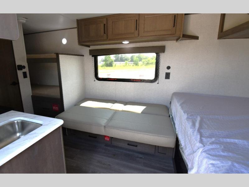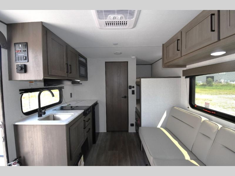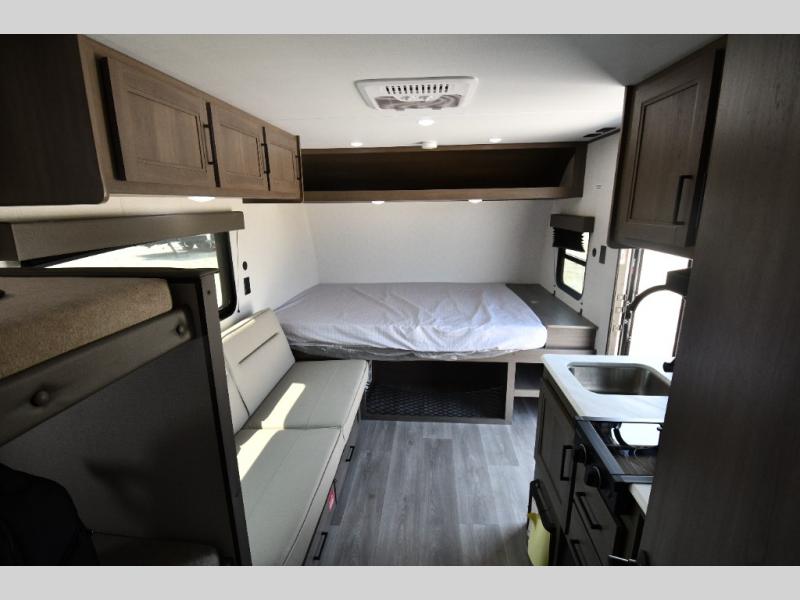 The Transcend One 151BH travel trailer makes camping effortless and fun for families and weekend adventurers. The rear 28" x 67" bunk beds sit next to the private bath for convenience, while the front queen bed offers hidden storage for your belongings. A 66" jackknife sofa provides extra sleeping space for guests, and the kitchen is equipped for easy meal prep, with an exterior LP quick-connect perfect for firing up a grill. Step outside and enjoy the 10' power awning, ideal for shade, outdoor dining, or relaxing in the fresh air.