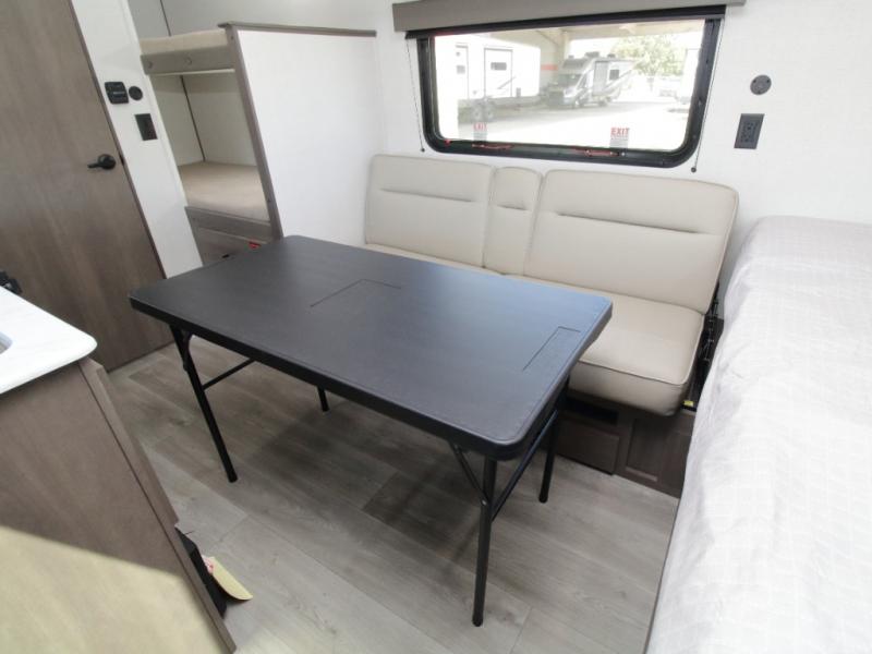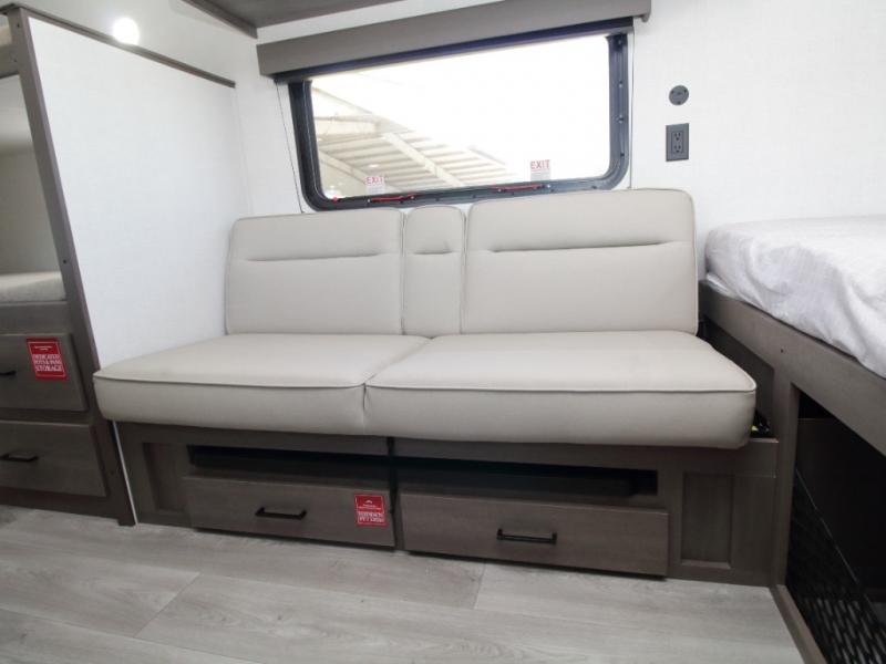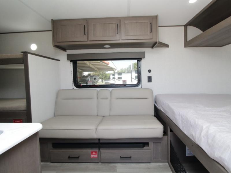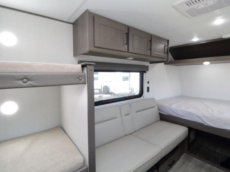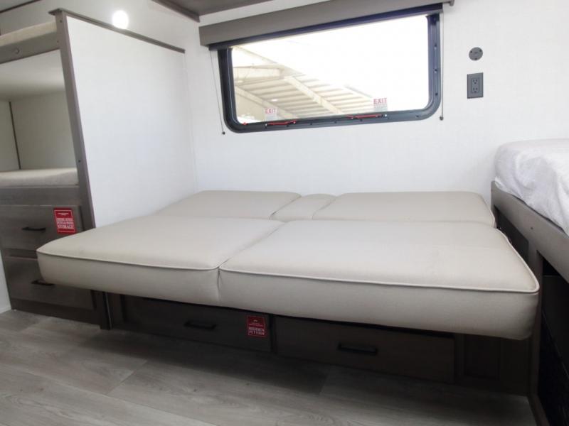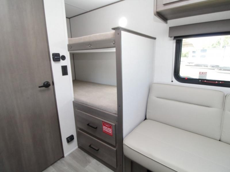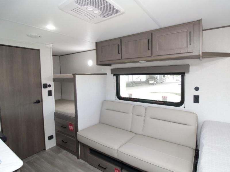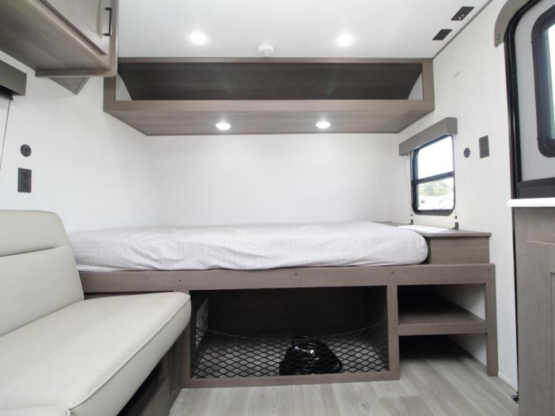 Enjoy family-friendly camping with the 2026 Grand Design Transcend One 151BH, featuring convenient bunk beds next to the private bath and a versatile 66" Jack knife sofa for extra sleeping space.