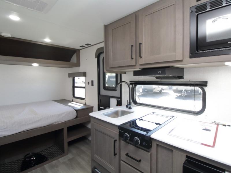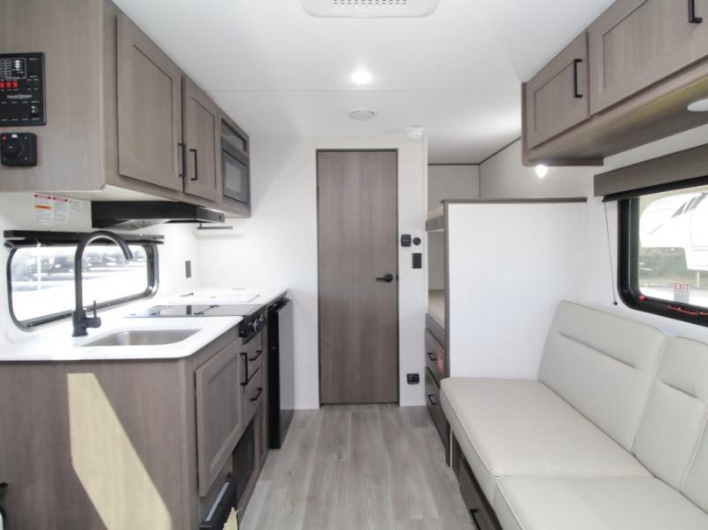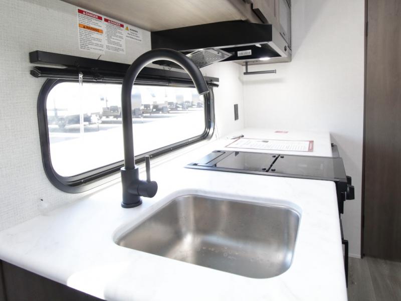 The Grand Design Transcend One 151BH makes weekend getaways and family camping trips simple, fun, and stress-free. This lightweight single-axle travel trailer sleeps up to five with rear bunk beds, a queen bed with hidden storage, and a jackknife sofa that doubles as extra sleeping space. The rear corner bath is conveniently located by the bunks, and the full kitchen includes everything you need—two-burner cooktop, refrigerator, microwave, and ample counter space. For outdoor cooking, the LP quick connect makes grilling easy.