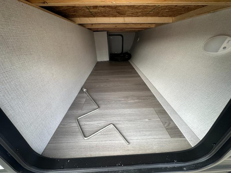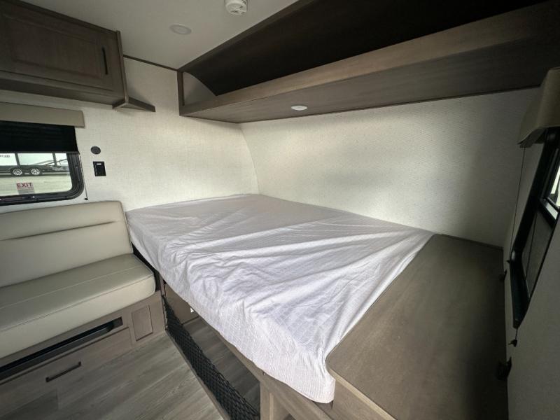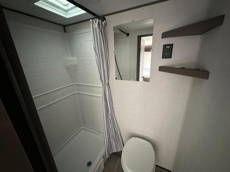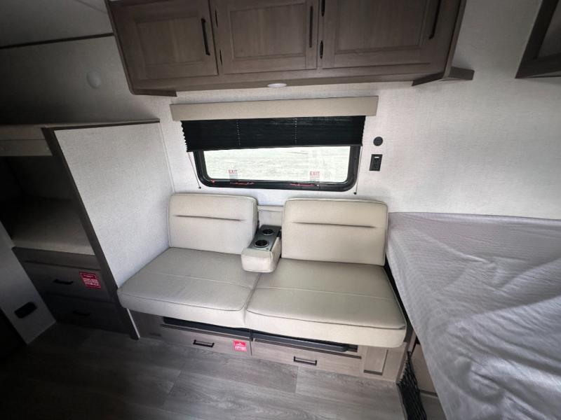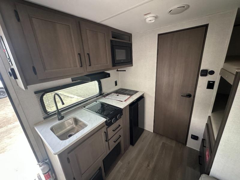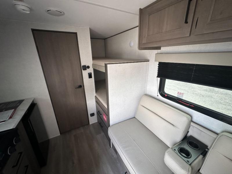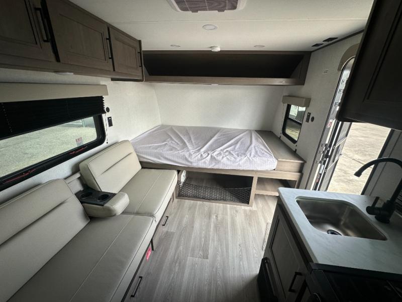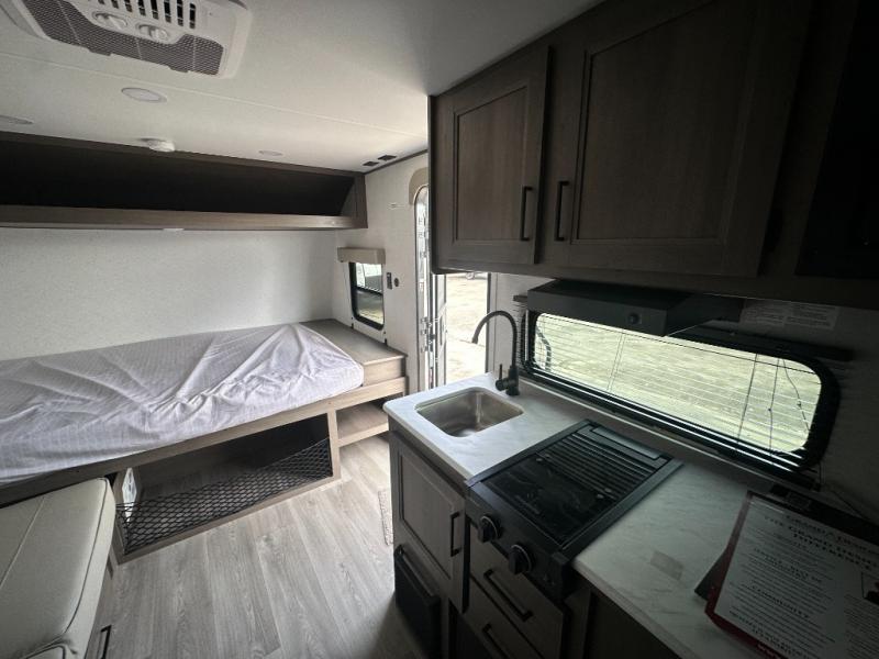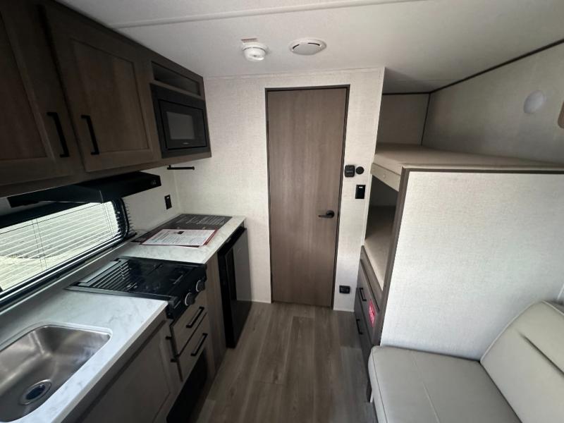 Camping trips to the lake have never been easier than with this travel trailer! The 28" x 67" bunks are right next to the private bath for easy nighttime use, and the front queen bed includes hidden storage for your things. There is also a 66" Jack knife sofa that provides a little more sleeping space for guests. A full kitchen lets you cook meals each day and there is an exterior LP quick connect if you want to fire up your own propane grill.