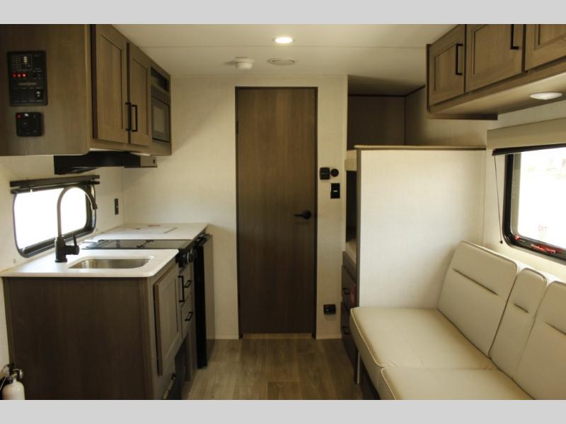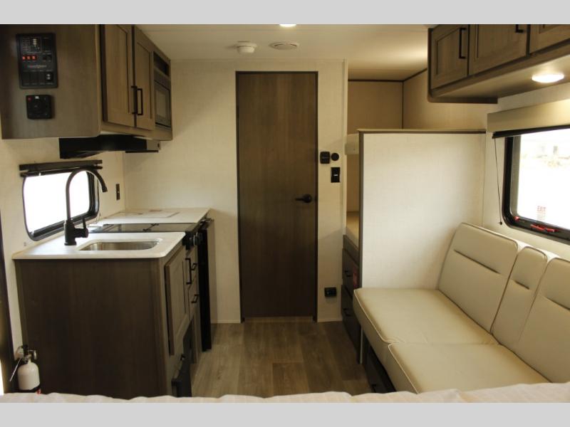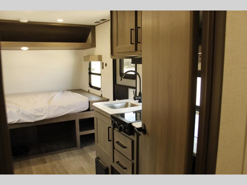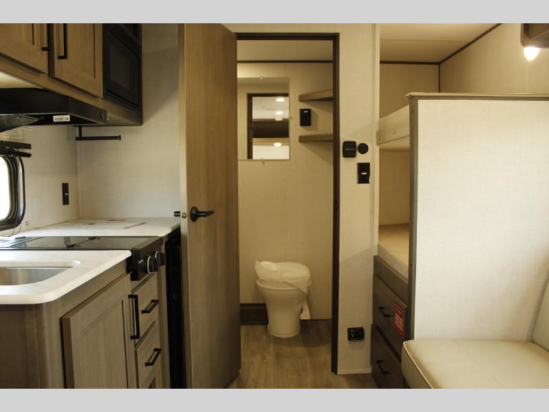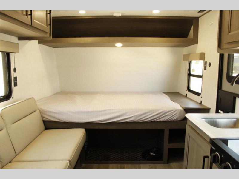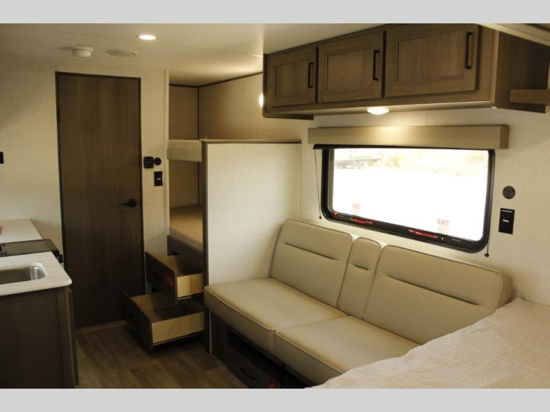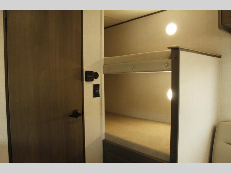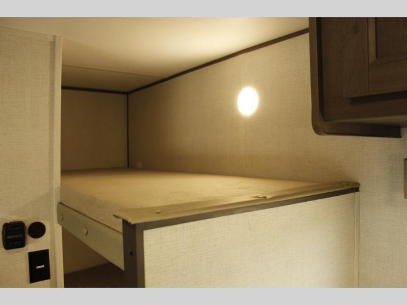 Camping trips to the lake have never been easier than with this travel trailer! The 28" x 67" bunks are right next to the private bath for easy nighttime use, and the front queen bed includes hidden storage for your things. There is also a 66" Jack knife sofa that provides a little more sleeping space for guests. A full kitchen lets you cook meals each day and there is an exterior LP quick connect if you want to fire up your own propane grill.
