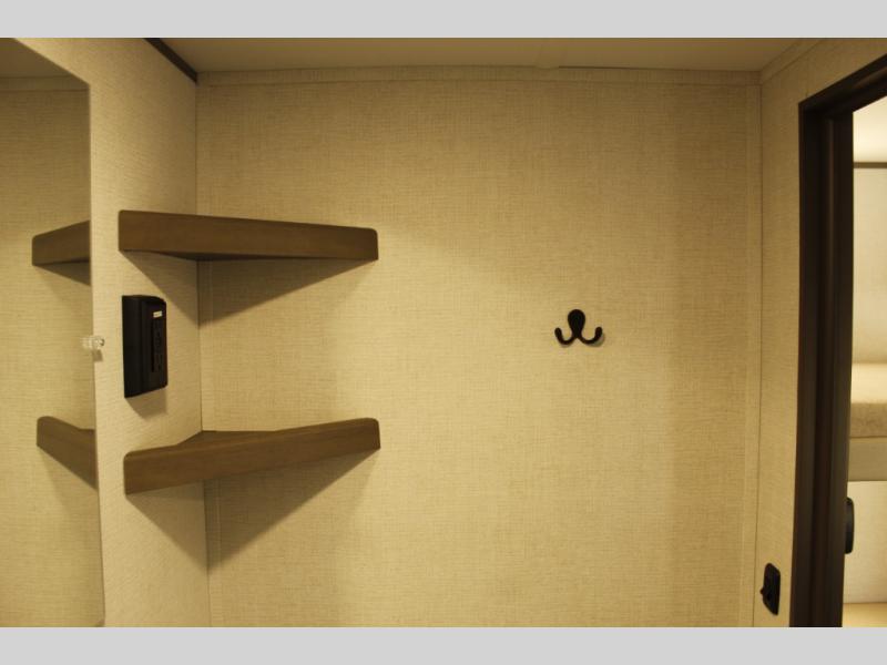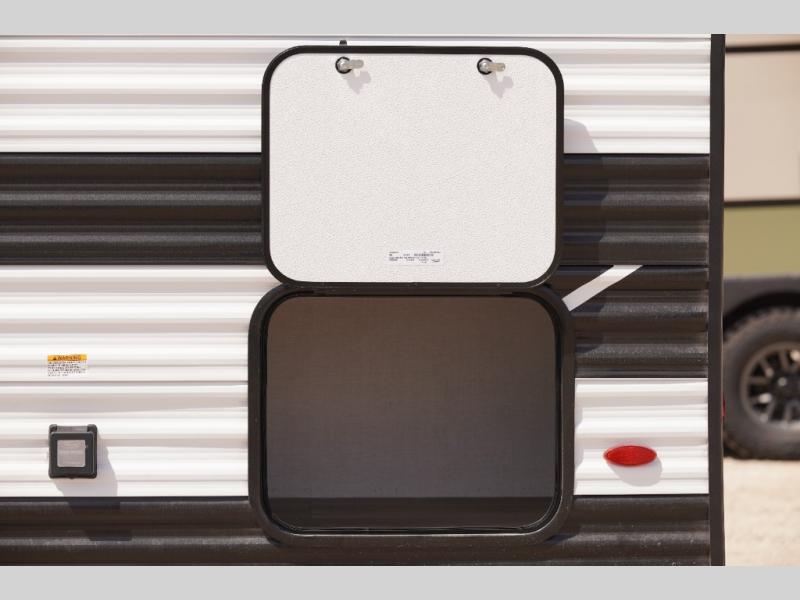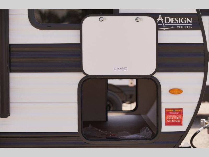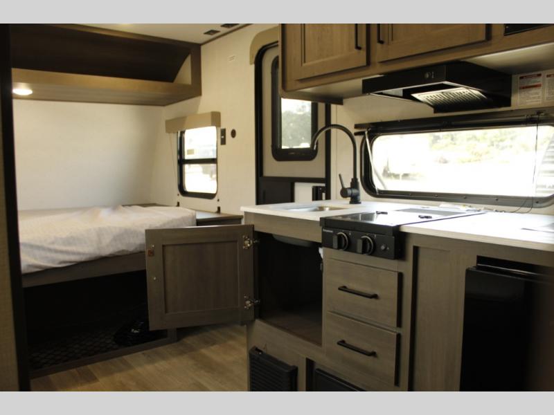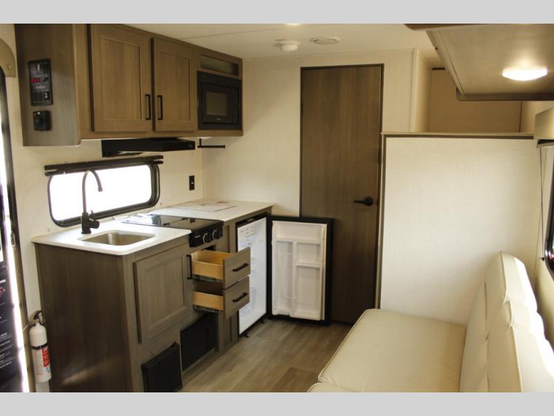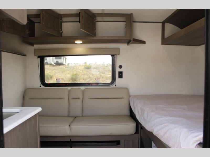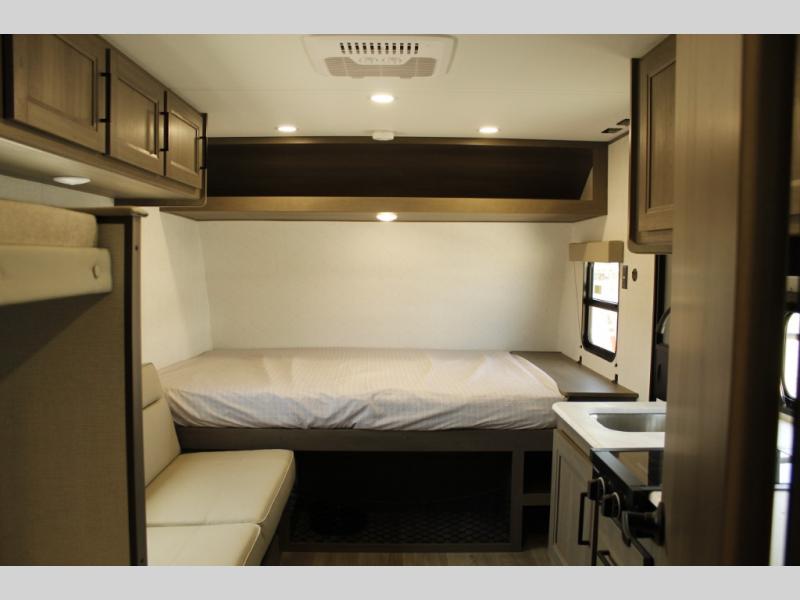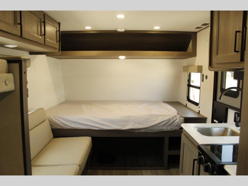 Camping trips to the lake have never been easier than with this travel trailer! The 28" x 67" bunks are right next to the private bath for easy nighttime use, and the front queen bed includes hidden storage for your things. There is also a 66" Jack knife sofa that provides a little more sleeping space for guests. A full kitchen lets you cook meals each day and there is an exterior LP quick connect if you want to fire up your own propane grill.
