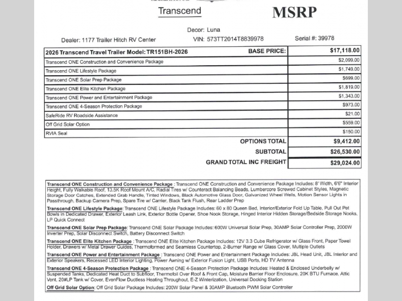 Grand Design Transcend One travel trailer 151BH highlights: