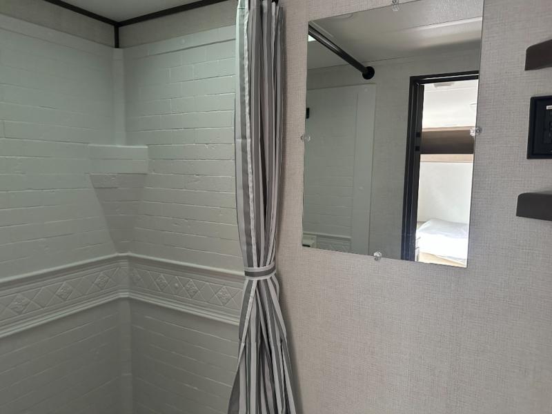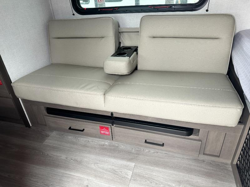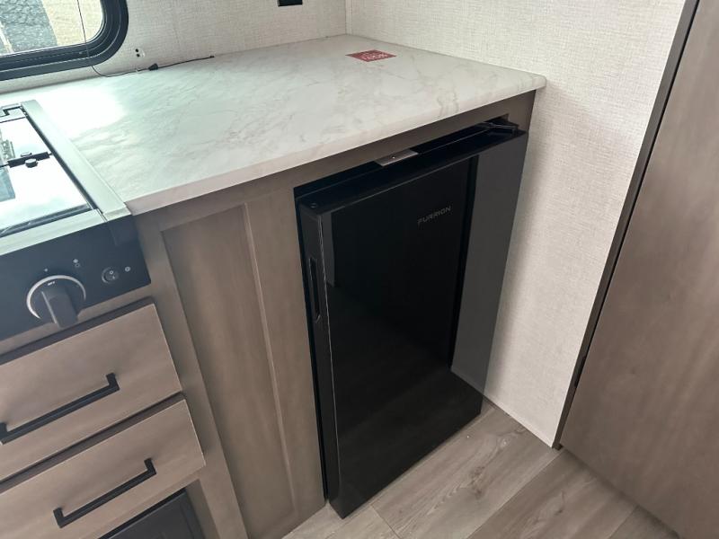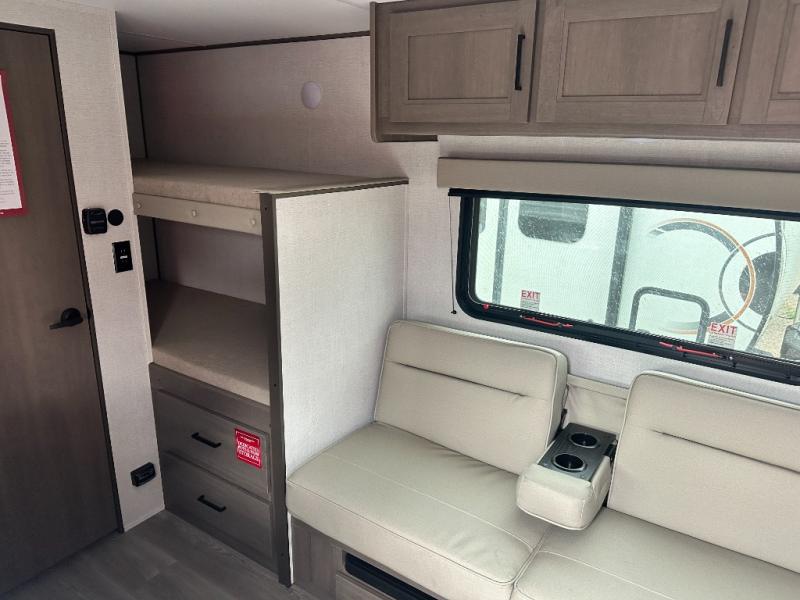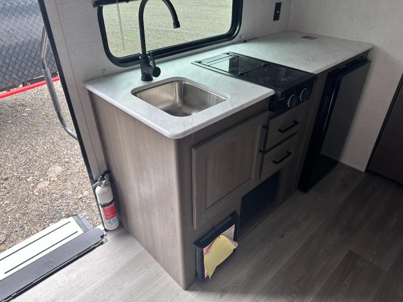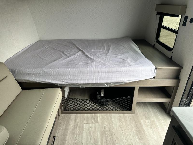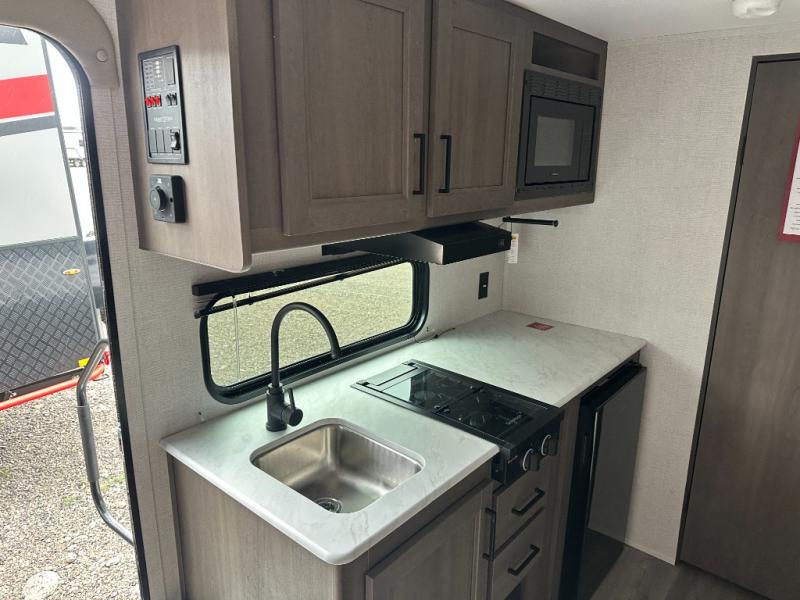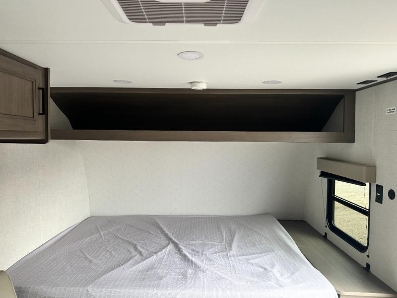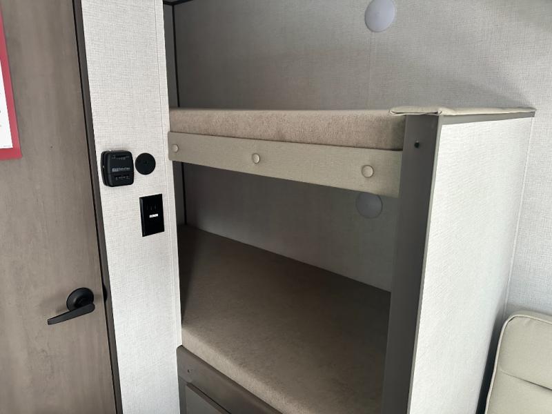 Camping trips to the lake have never been easier than with this travel trailer! The 28" x 67" bunks are right next to the private bath for easy nighttime use, and the front queen bed includes hidden storage for your things. There is also a 66" Jack knife sofa that provides a little more sleeping space for guests. A full kitchen lets you cook meals each day and there is an exterior LP quick connect if you want to fire up your own propane grill.