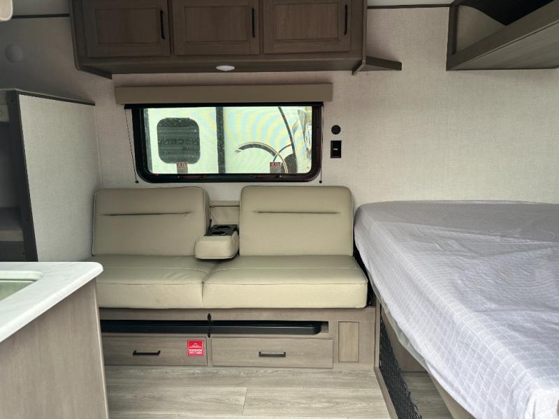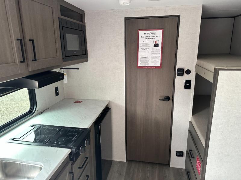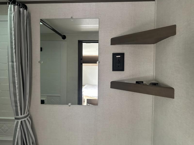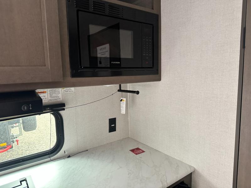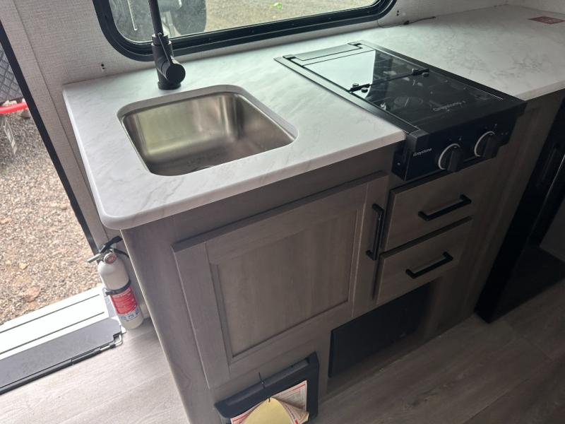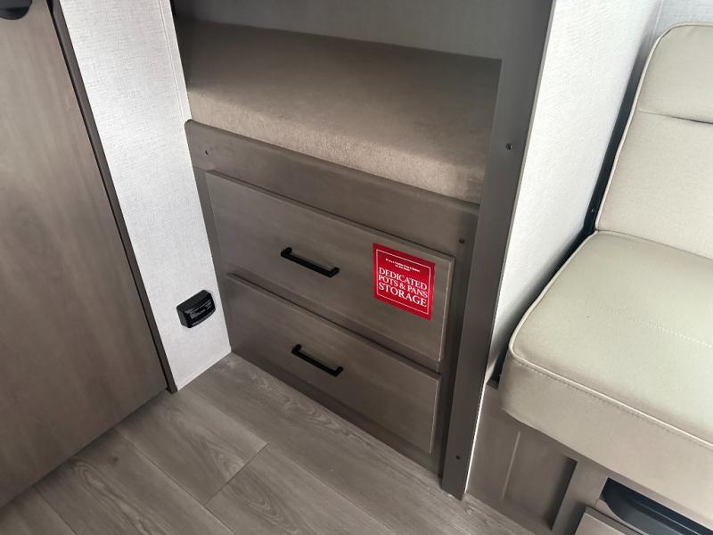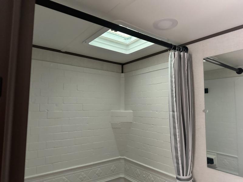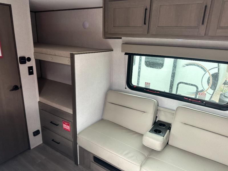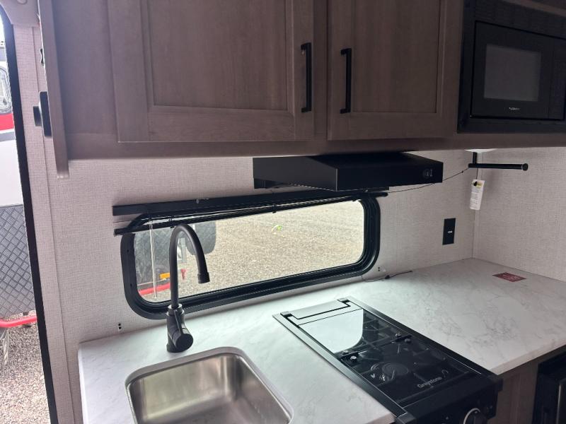 Camping trips to the lake have never been easier than with this travel trailer! The 28" x 67" bunks are right next to the private bath for easy nighttime use, and the front queen bed includes hidden storage for your things. There is also a 66" Jack knife sofa that provides a little more sleeping space for guests. A full kitchen lets you cook meals each day and there is an exterior LP quick connect if you want to fire up your own propane grill.