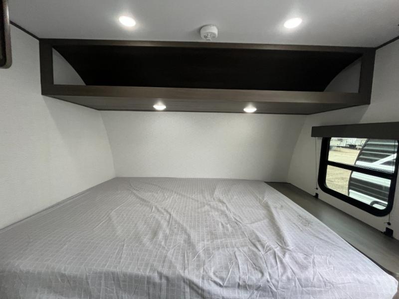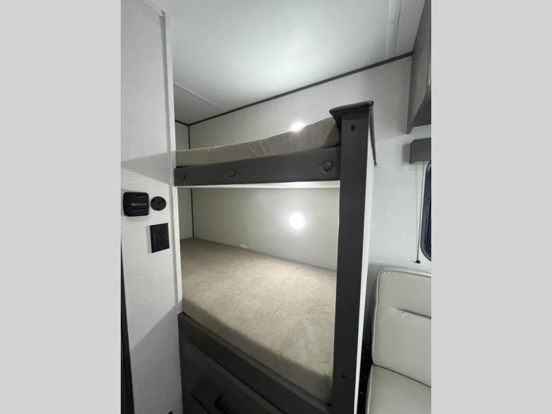 Camping trips to the lake have never been easier than with this travel trailer! The 28" x 67" bunks are right next to the private bath for easy nighttime use, and the front queen bed includes hidden storage for your things. There is also a 66" Jack knife sofa that provides a little more sleeping space for guests. A full kitchen lets you cook meals each day and there is an exterior LP quick connect if you want to fire up your own propane grill.