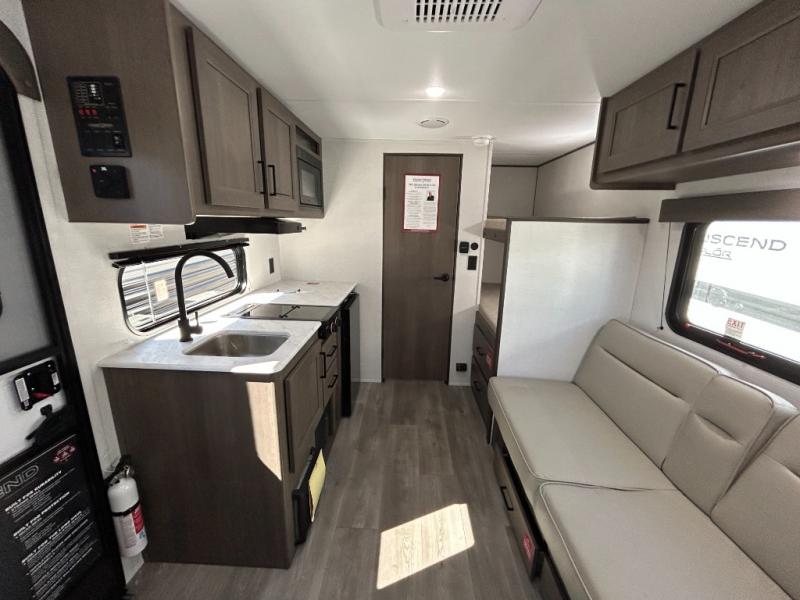 Camping trips to the lake have never been easier than with this travel trailer! The 28" x 67" bunks are right next to the private bath for easy nighttime use, and the front queen bed includes hidden storage for your things. There is also a 66" Jack knife sofa that provides a little more sleeping space for guests. A full kitchen lets you cook meals each day and there is an exterior LP quick connect if you want to fire up your own propane grill.