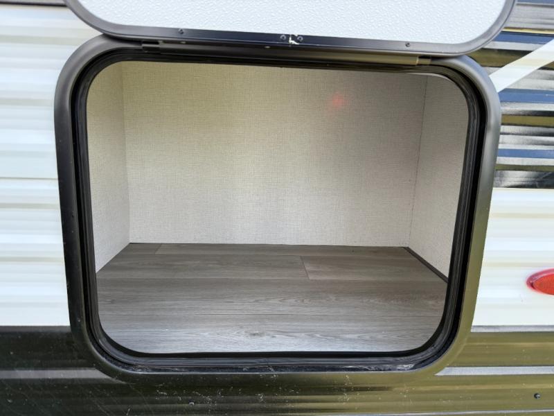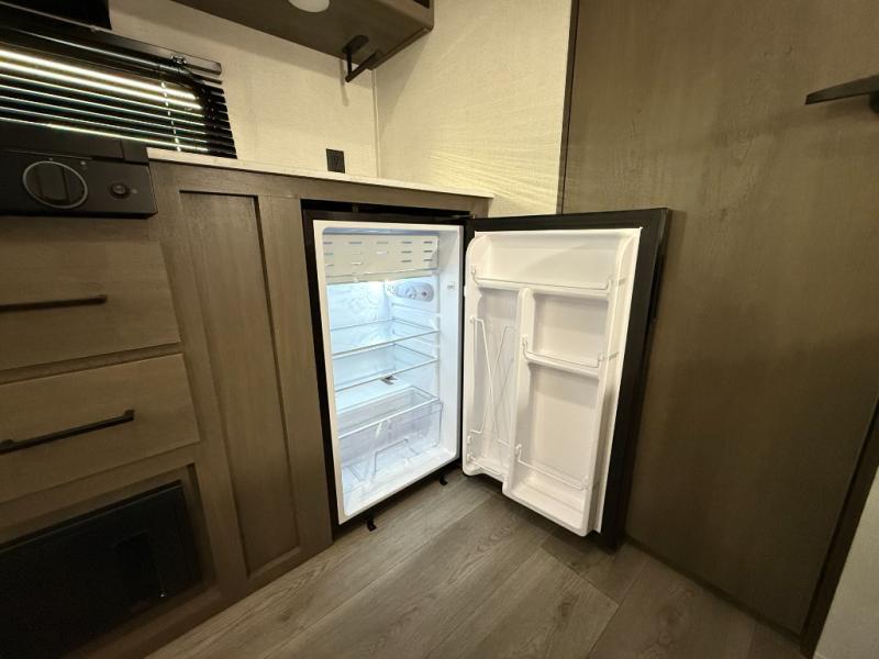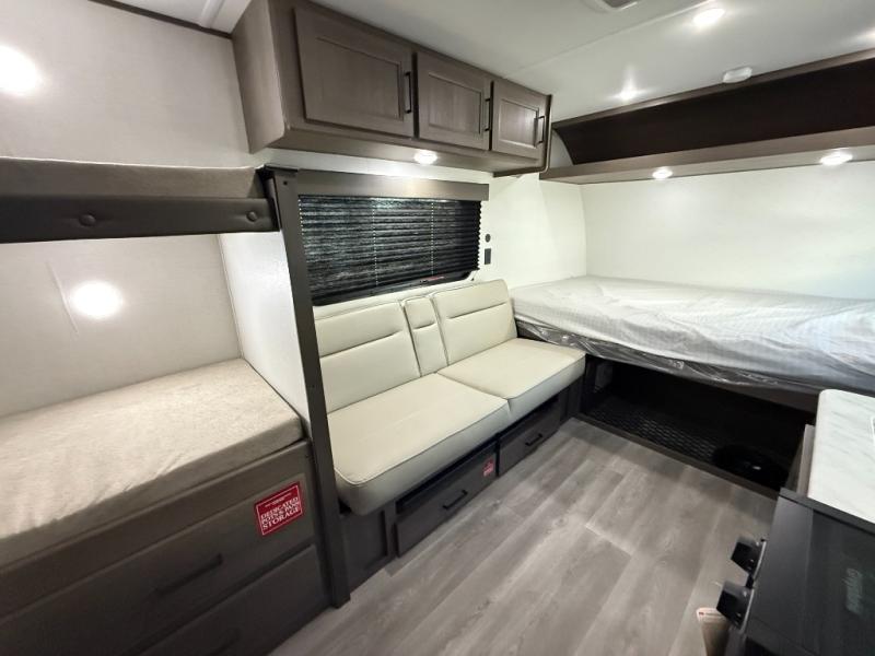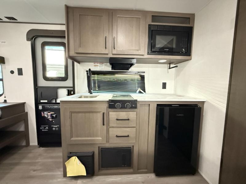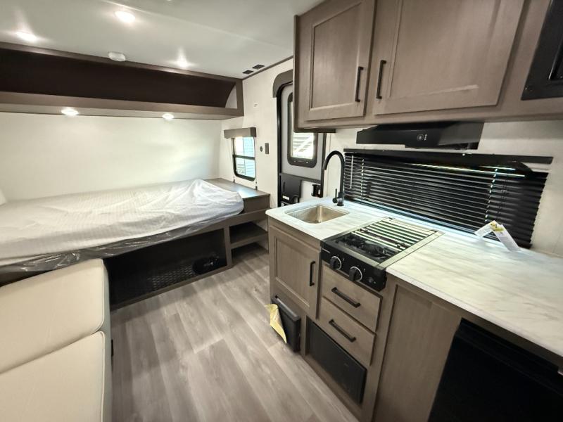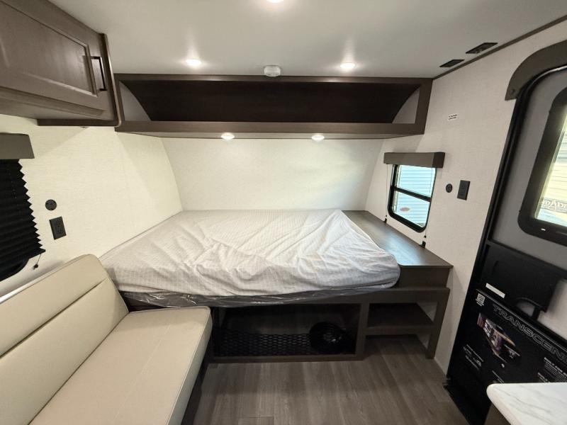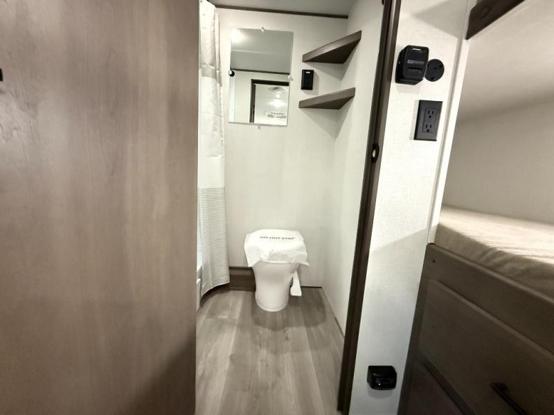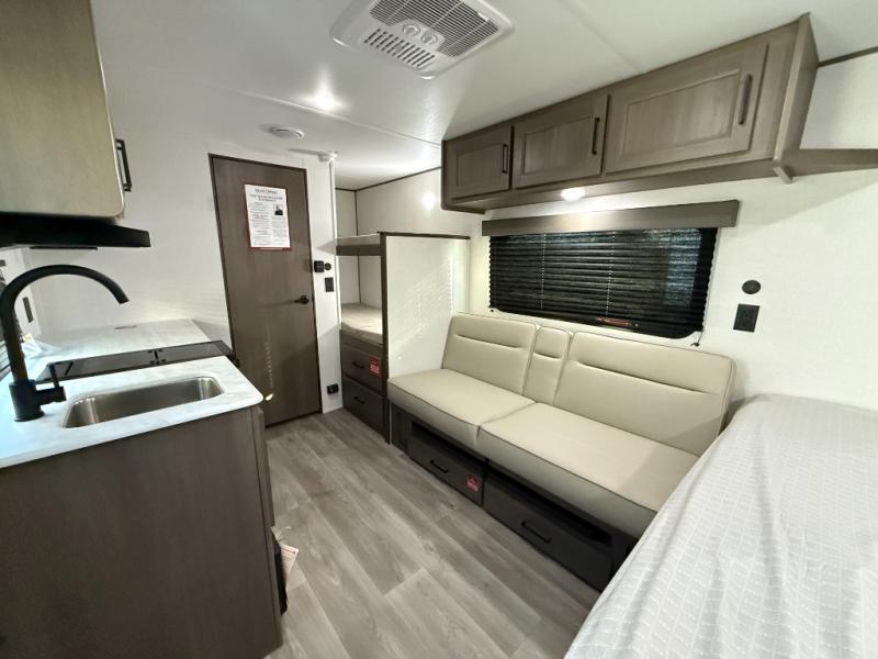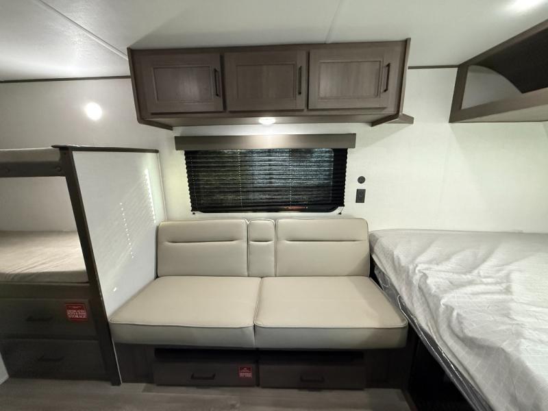 Camping trips to the lake have never been easier than with this travel trailer! The 28" x 67" bunks are right next to the private bath for easy nighttime use, and the front queen bed includes hidden storage for your things. There is also a 66" Jack knife sofa that provides a little more sleeping space for guests. A full kitchen lets you cook meals each day and there is an exterior LP quick connect if you want to fire up your own propane grill.