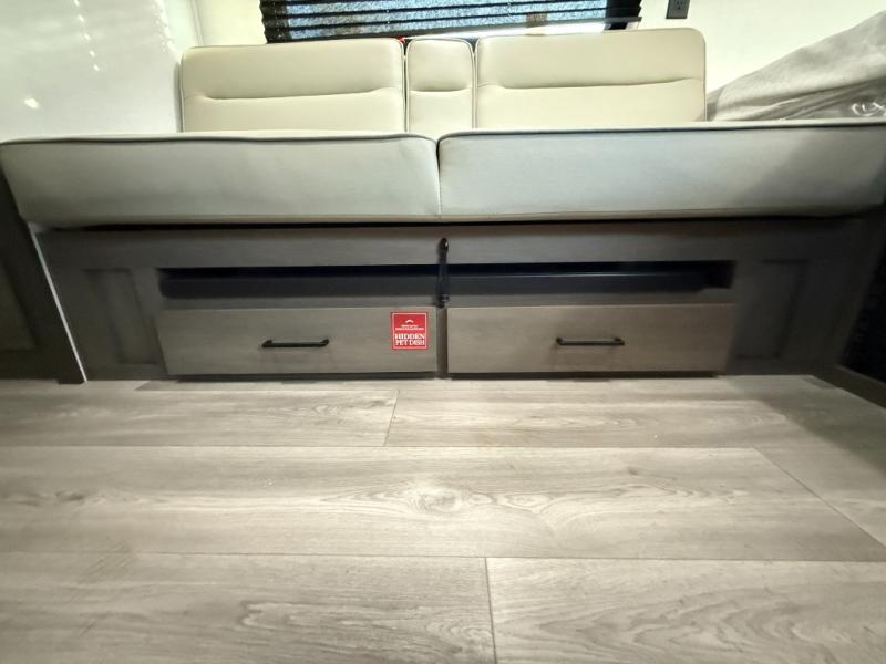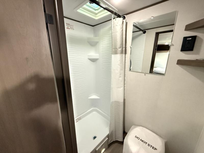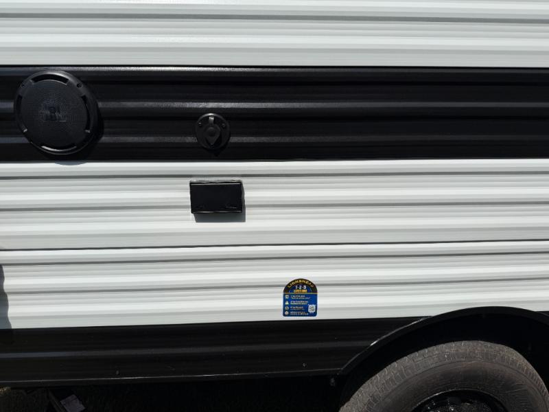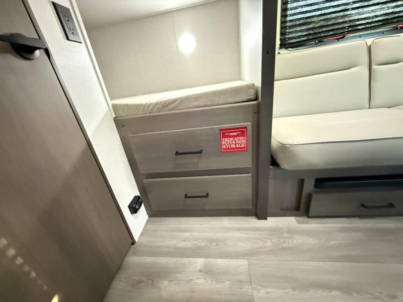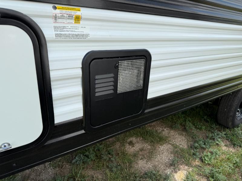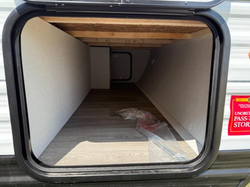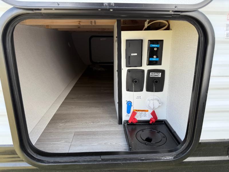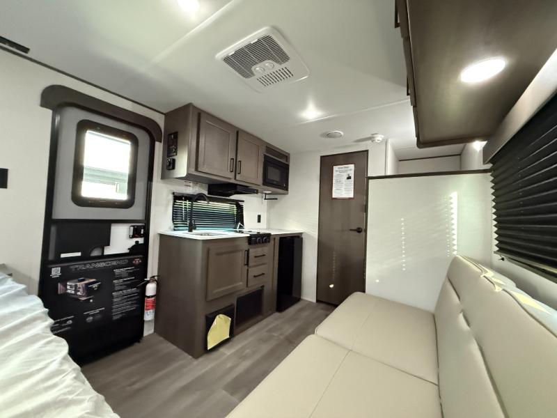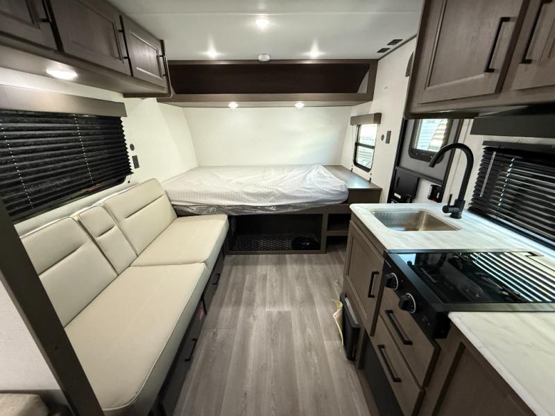 Camping trips to the lake have never been easier than with this travel trailer! The 28" x 67" bunks are right next to the private bath for easy nighttime use, and the front queen bed includes hidden storage for your things. There is also a 66" Jack knife sofa that provides a little more sleeping space for guests. A full kitchen lets you cook meals each day and there is an exterior LP quick connect if you want to fire up your own propane grill.