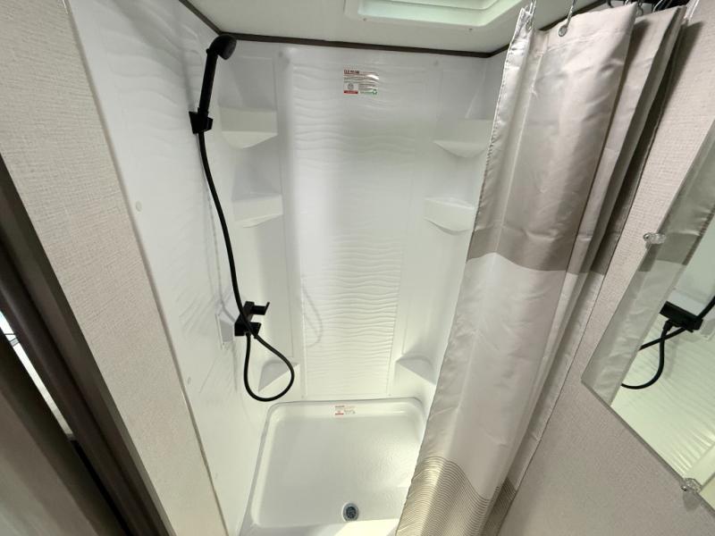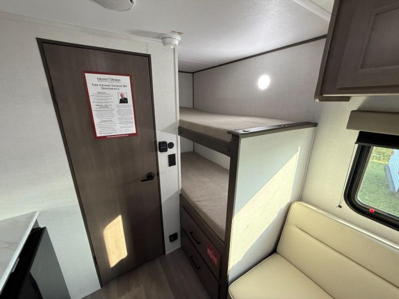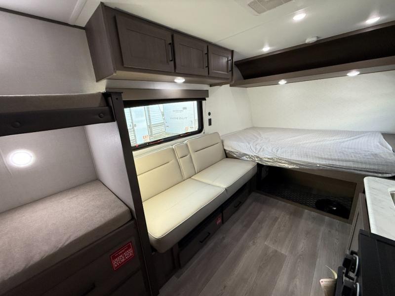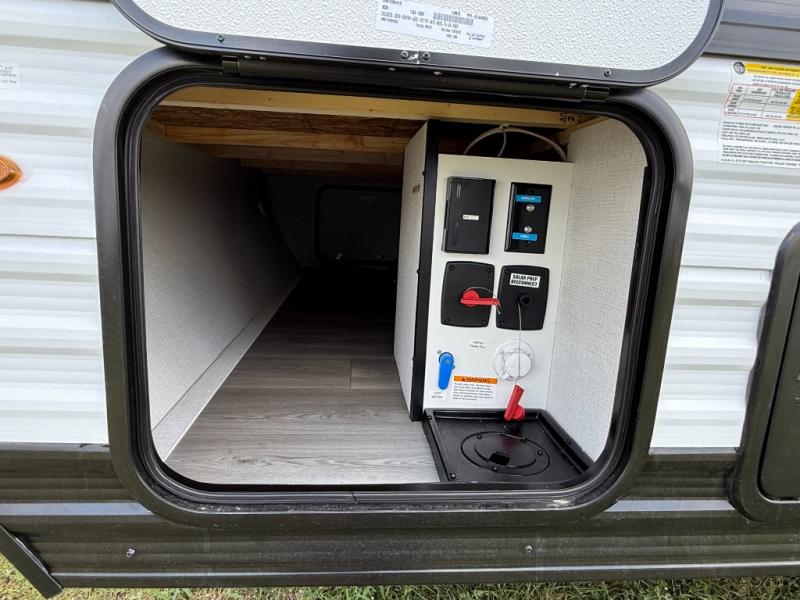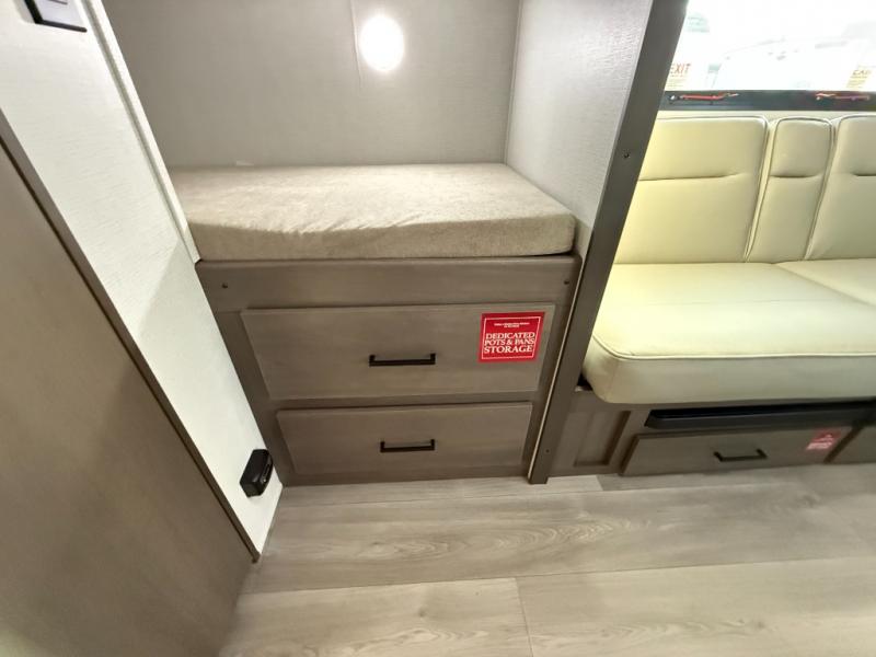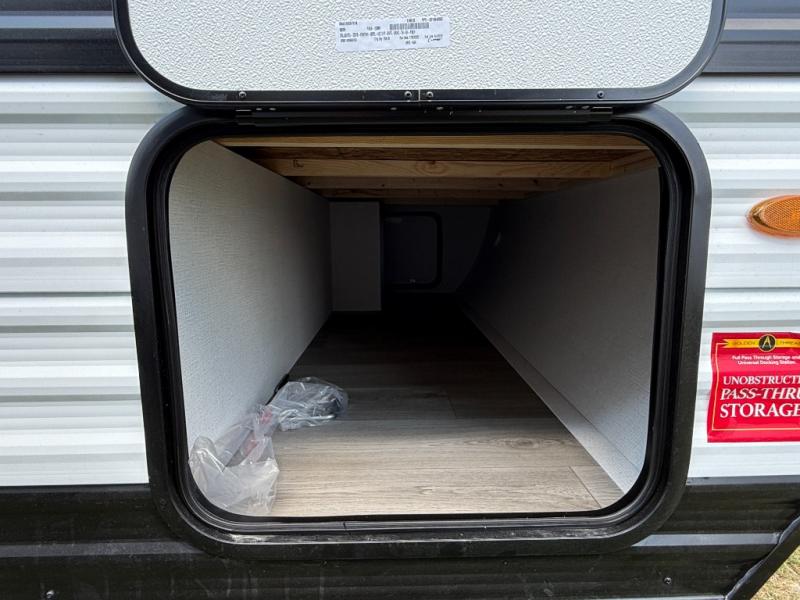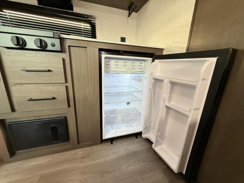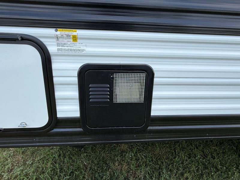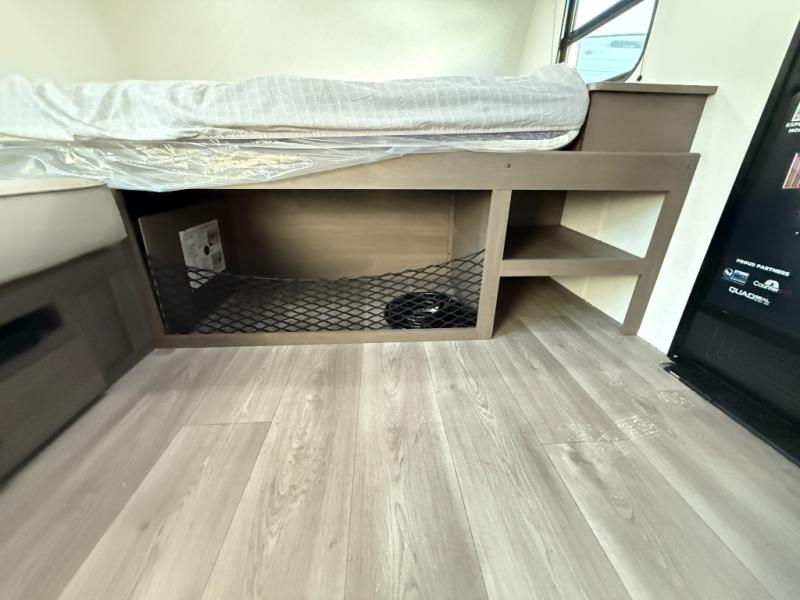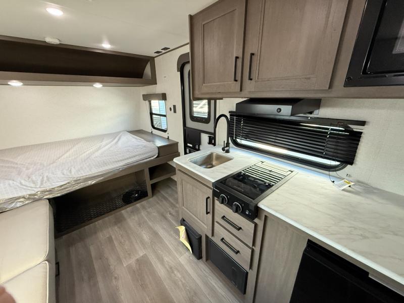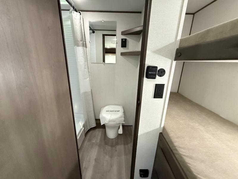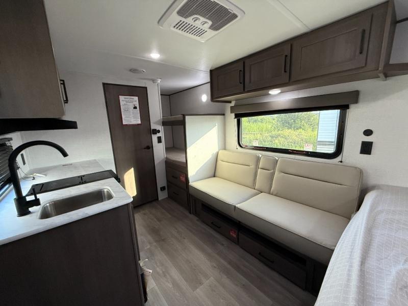 Camping trips to the lake have never been easier than with this travel trailer! The 28" x 67" bunks are right next to the private bath for easy nighttime use, and the front queen bed includes hidden storage for your things. There is also a 66" Jack knife sofa that provides a little more sleeping space for guests. A full kitchen lets you cook meals each day and there is an exterior LP quick connect if you want to fire up your own propane grill.