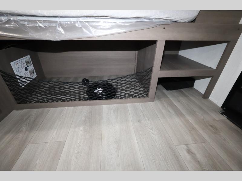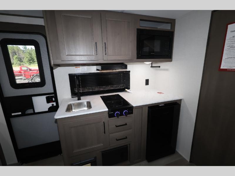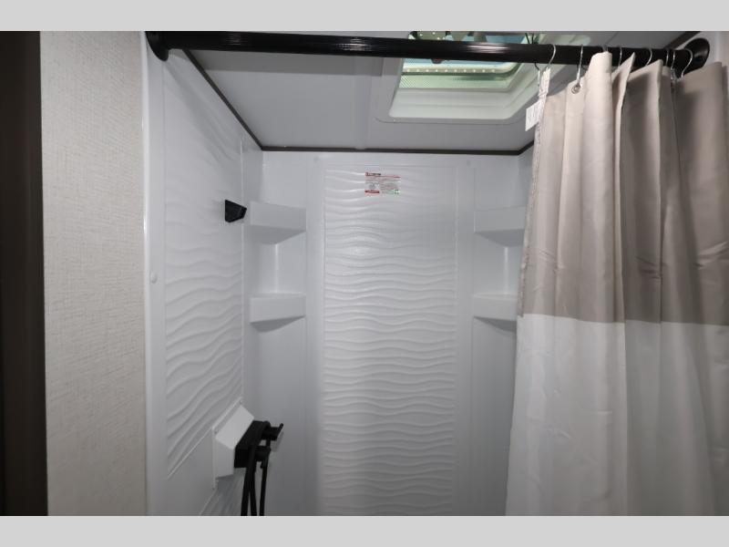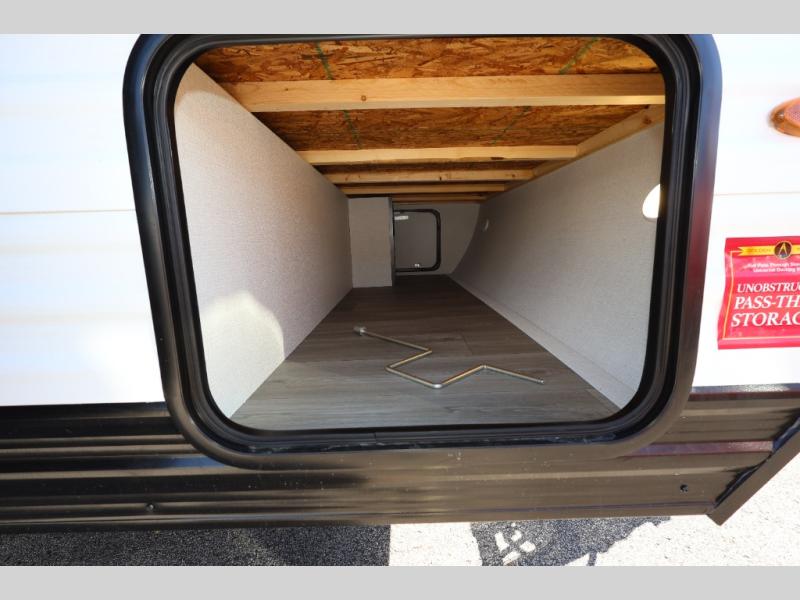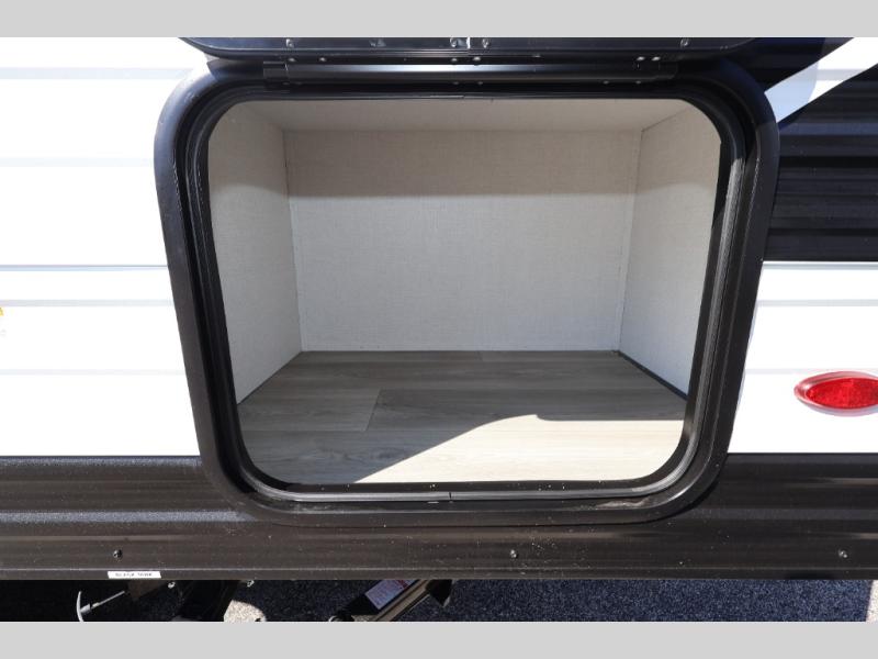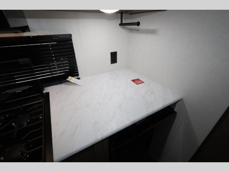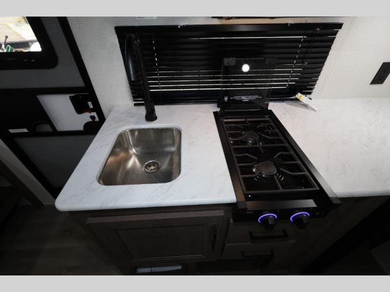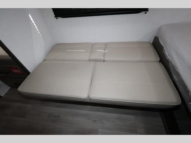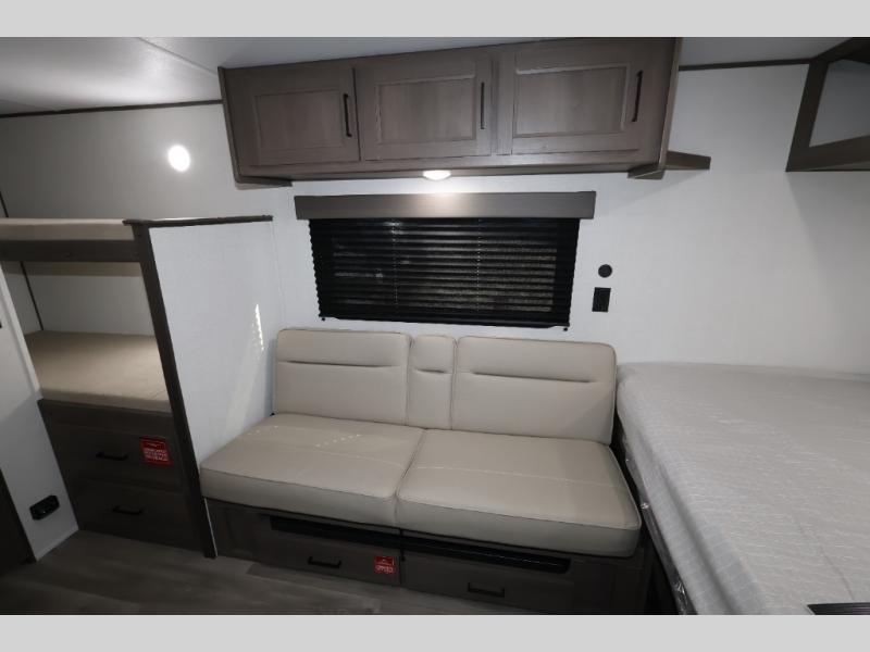 Camping trips to the lake have never been easier than with this travel trailer! The 28" x 67" bunks are right next to the private bath for easy nighttime use, and the front queen bed includes hidden storage for your things. There is also a 66" Jack knife sofa that provides a little more sleeping space for guests. A full kitchen lets you cook meals each day and there is an exterior LP quick connect if you want to fire up your own propane grill.