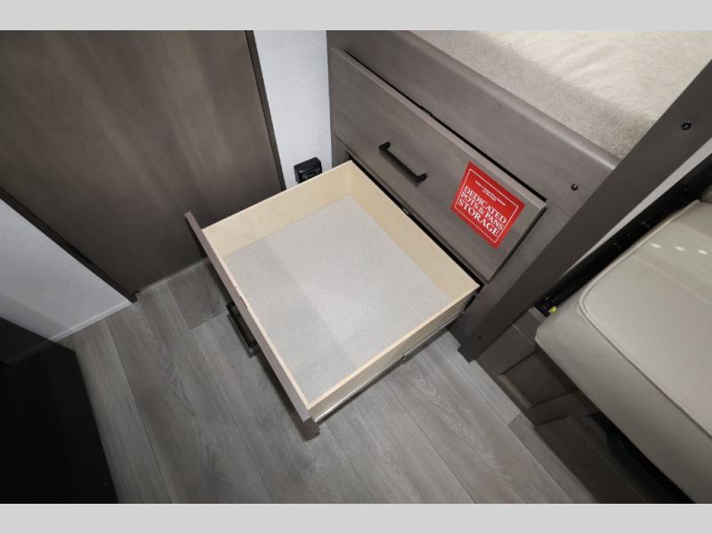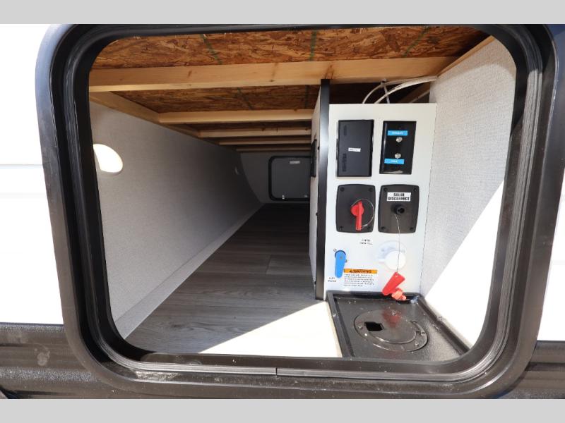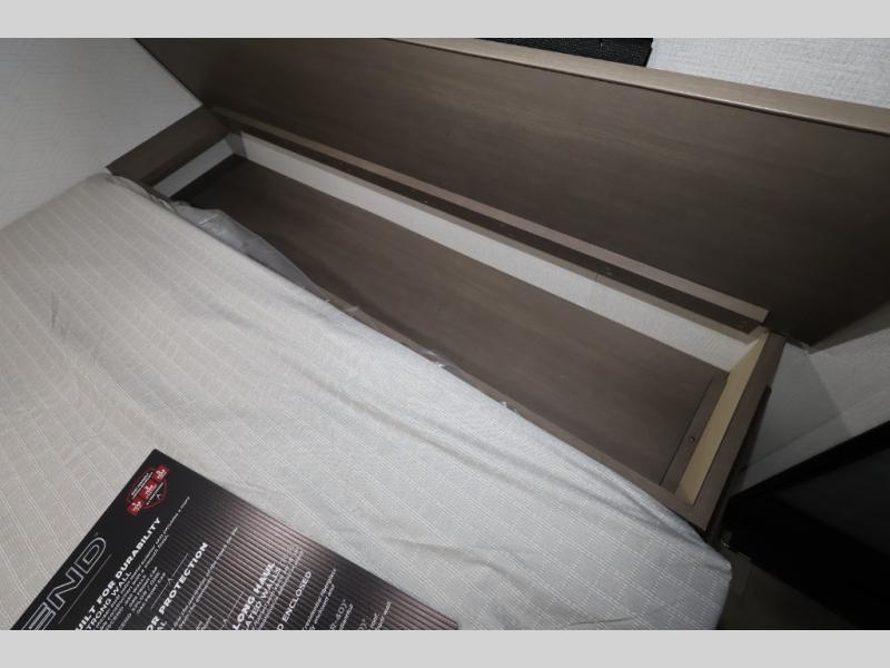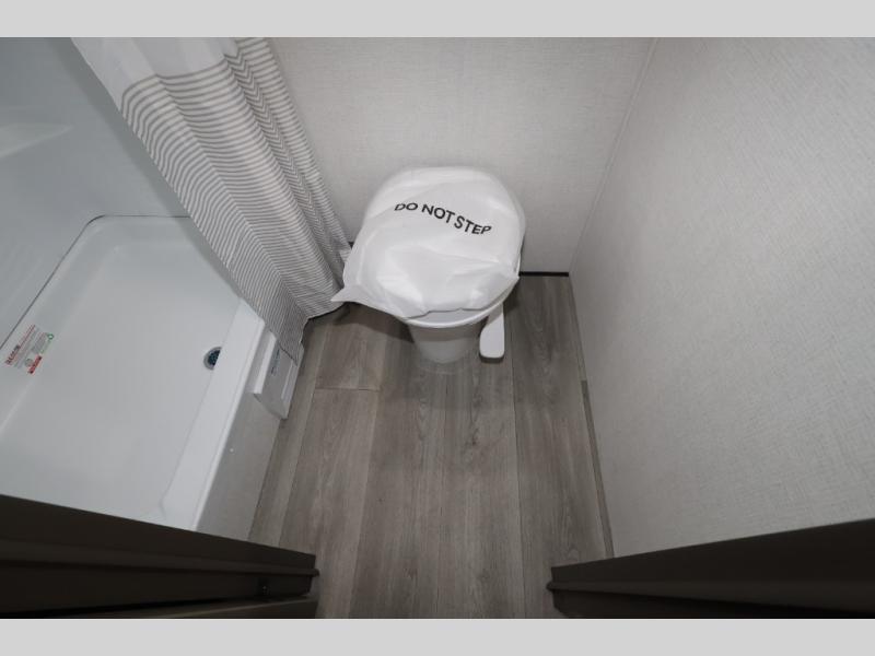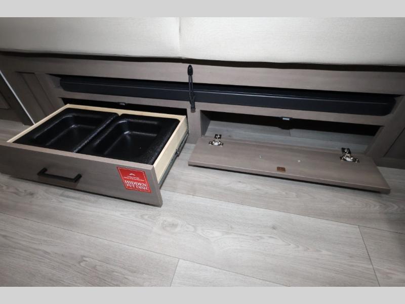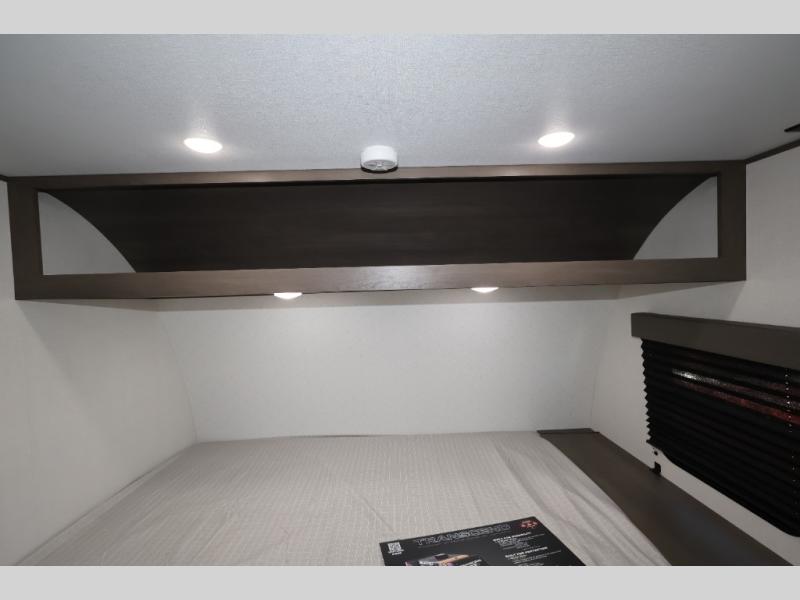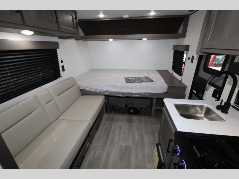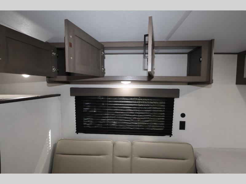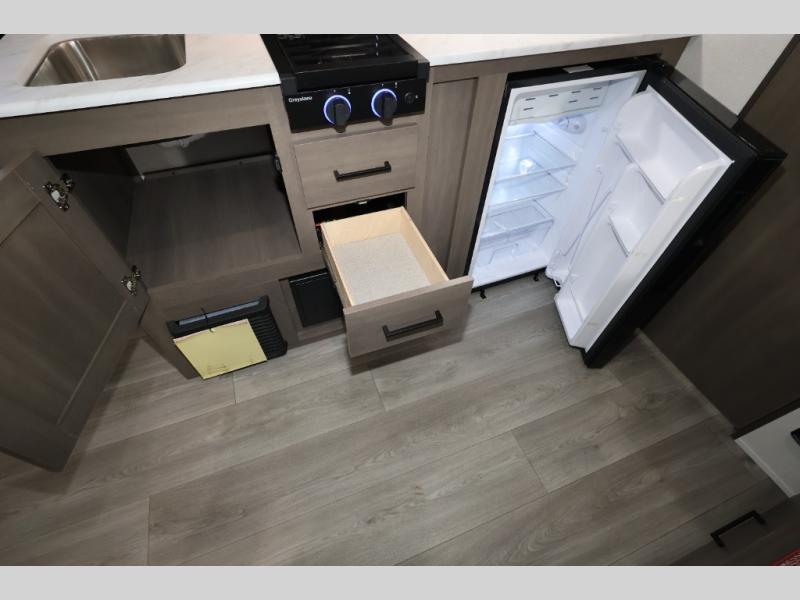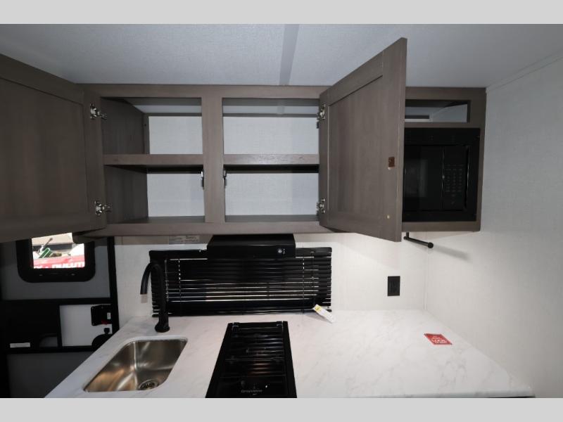 Camping trips to the lake have never been easier than with this travel trailer! The 28" x 67" bunks are right next to the private bath for easy nighttime use, and the front queen bed includes hidden storage for your things. There is also a 66" Jack knife sofa that provides a little more sleeping space for guests. A full kitchen lets you cook meals each day and there is an exterior LP quick connect if you want to fire up your own propane grill.