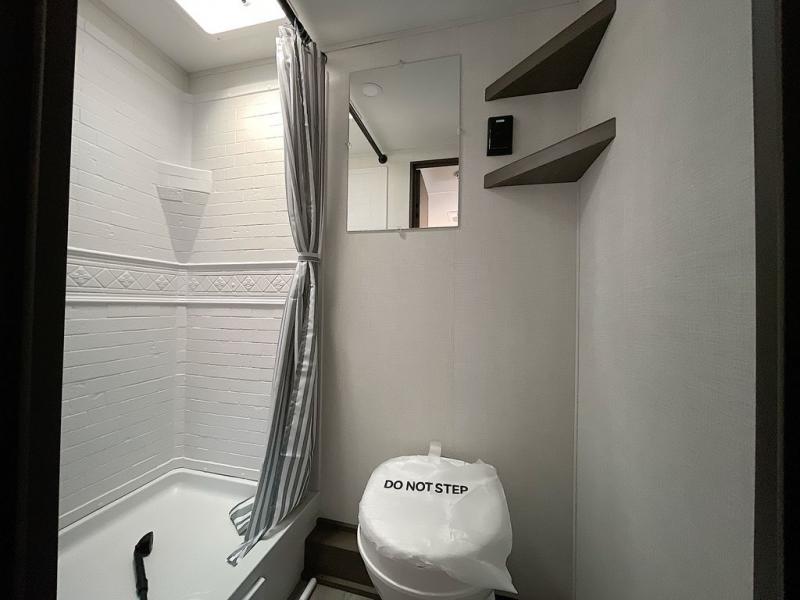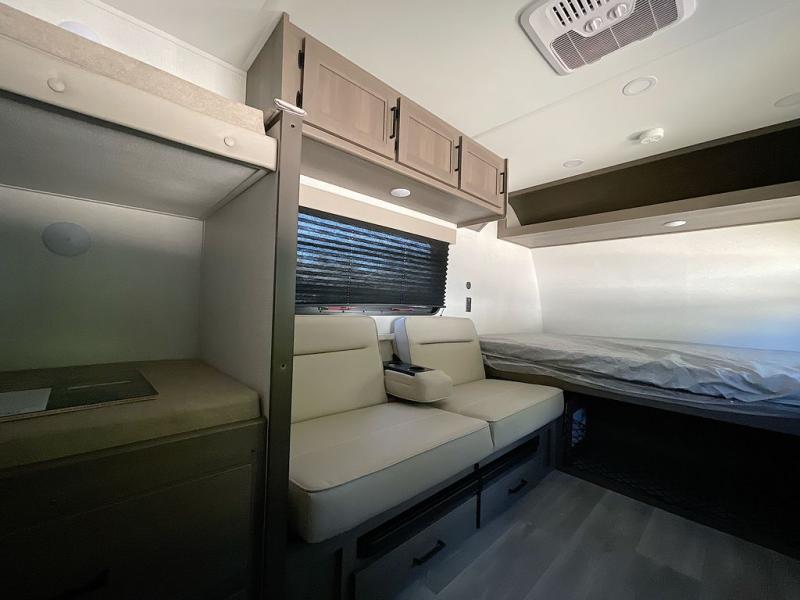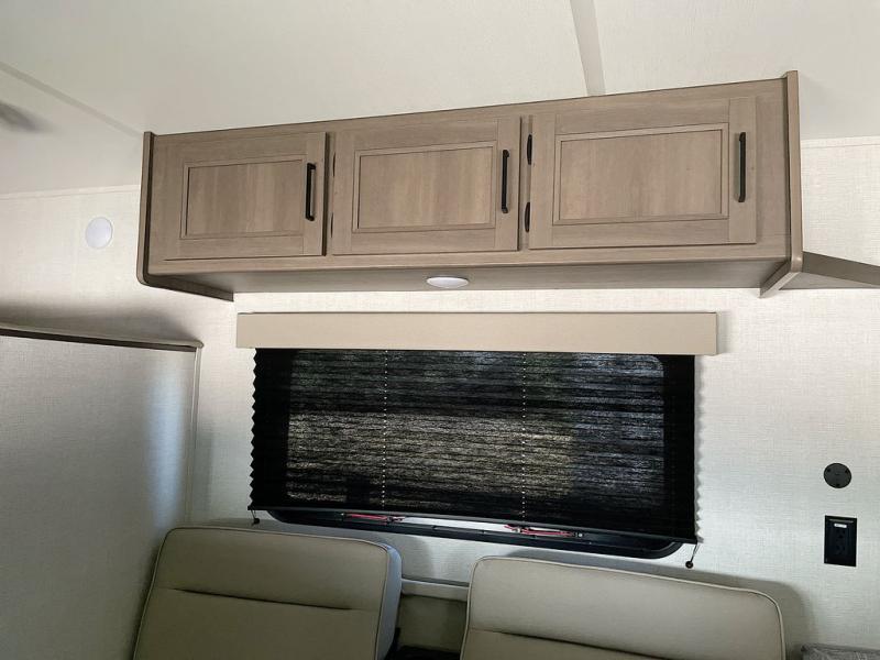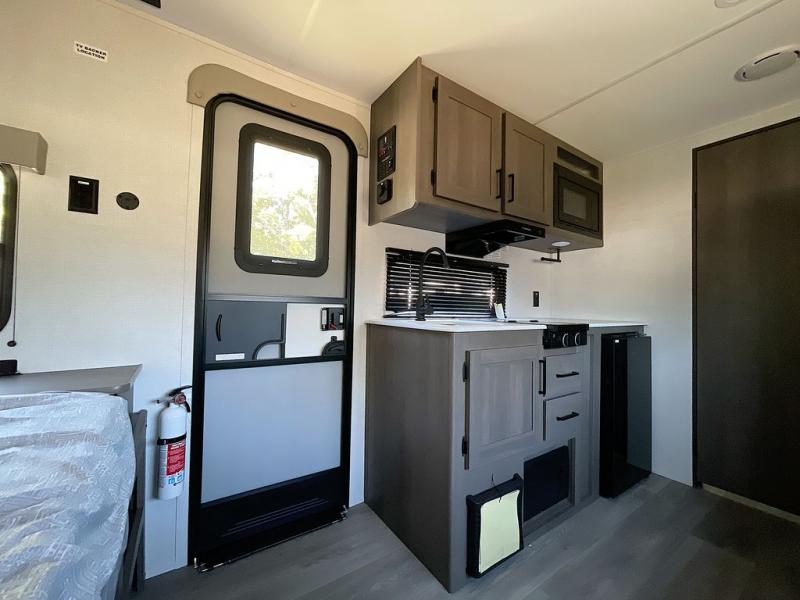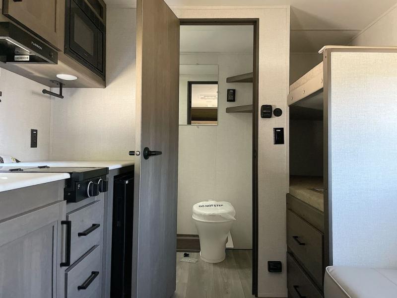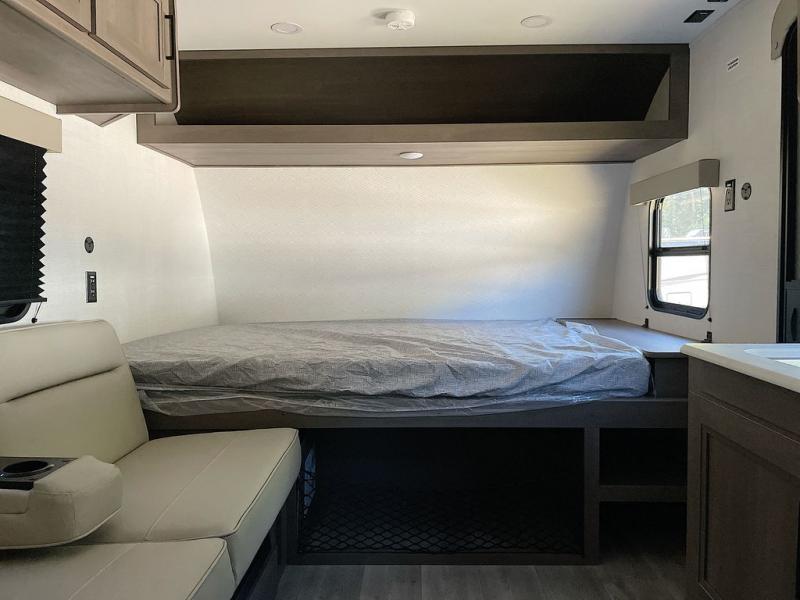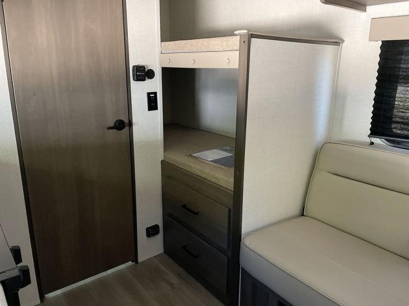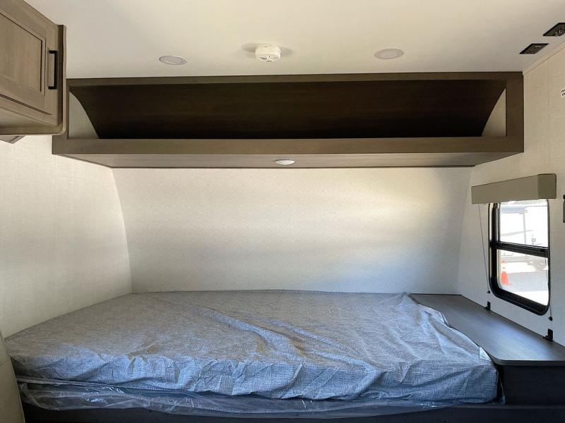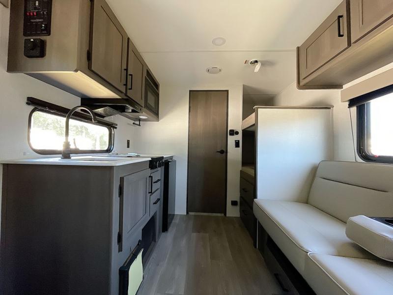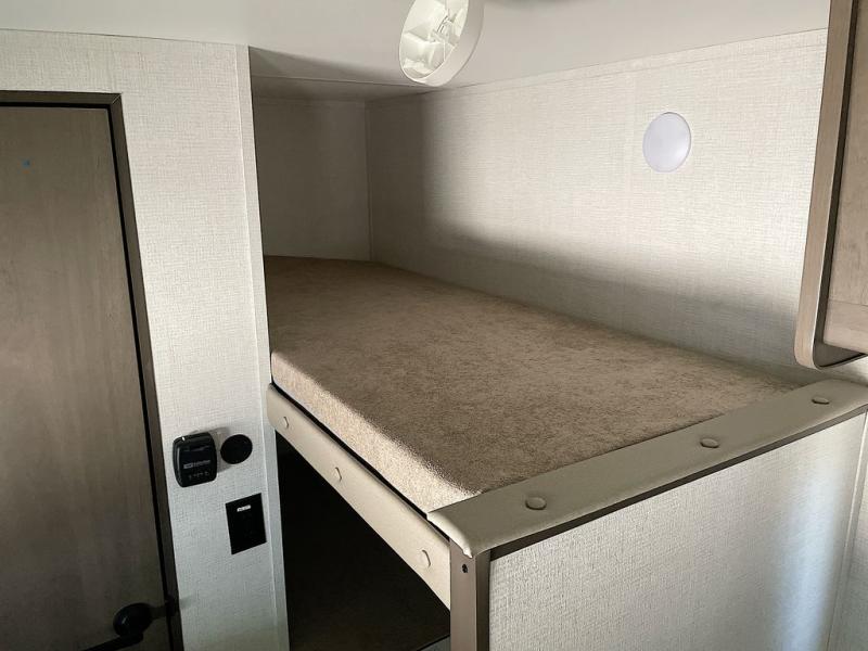 Camping trips to the lake have never been easier than with this travel trailer! The 28" x 67" bunks are right next to the private bath for easy nighttime use, and the front queen bed includes hidden storage for your things. There is also a 66" Jack knife sofa that provides a little more sleeping space for guests. A full kitchen lets you cook meals each day and there is an exterior LP quick connect if you want to fire up your own propane grill.