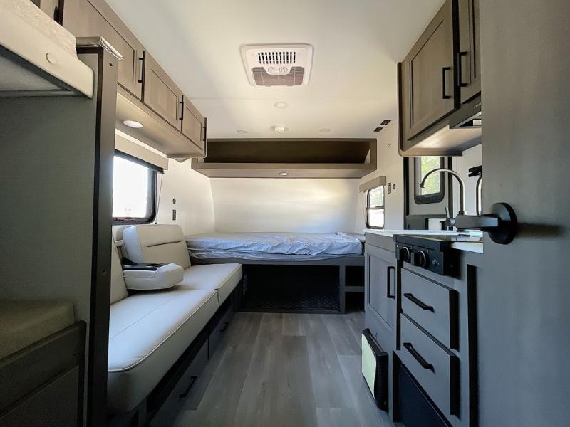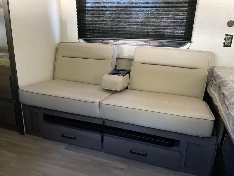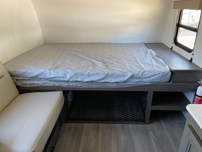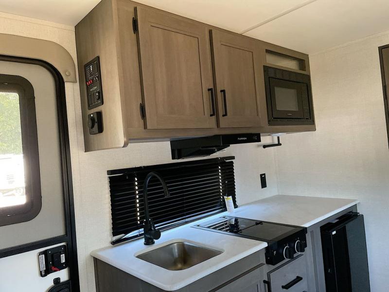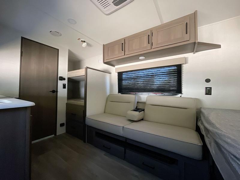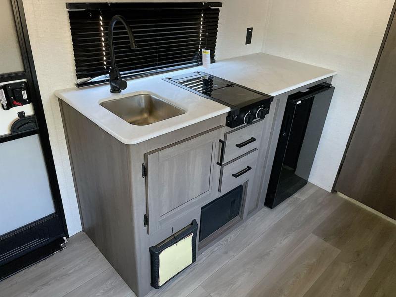 Camping trips to the lake have never been easier than with this travel trailer! The 28" x 67" bunks are right next to the private bath for easy nighttime use, and the front queen bed includes hidden storage for your things. There is also a 66" Jack knife sofa that provides a little more sleeping space for guests. A full kitchen lets you cook meals each day and there is an exterior LP quick connect if you want to fire up your own propane grill.