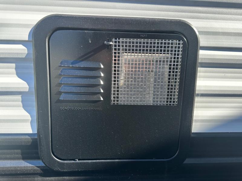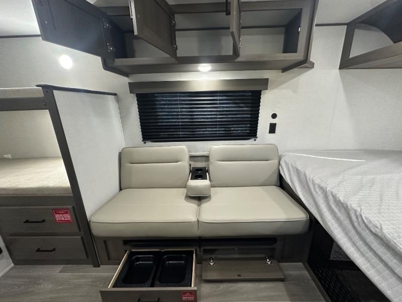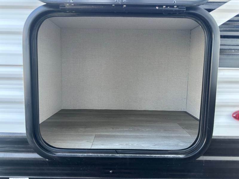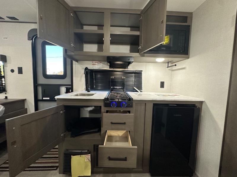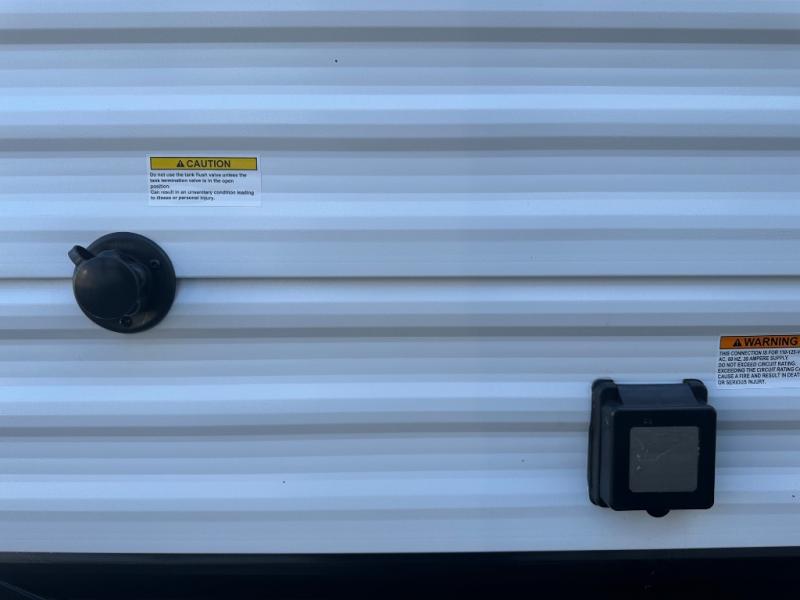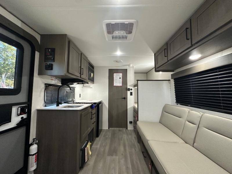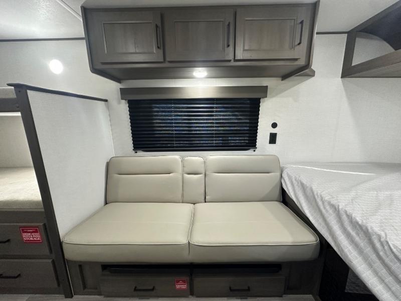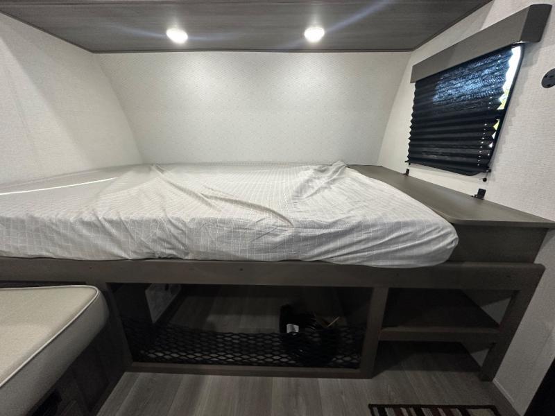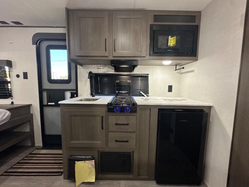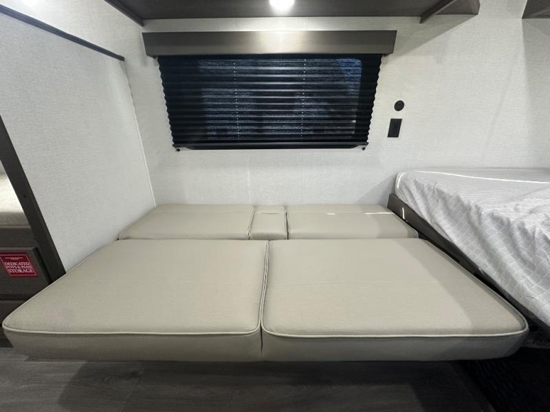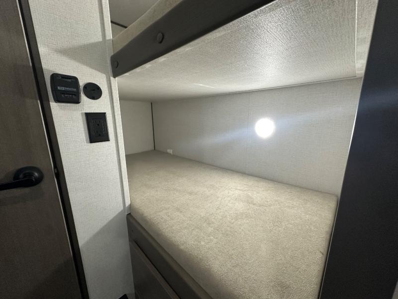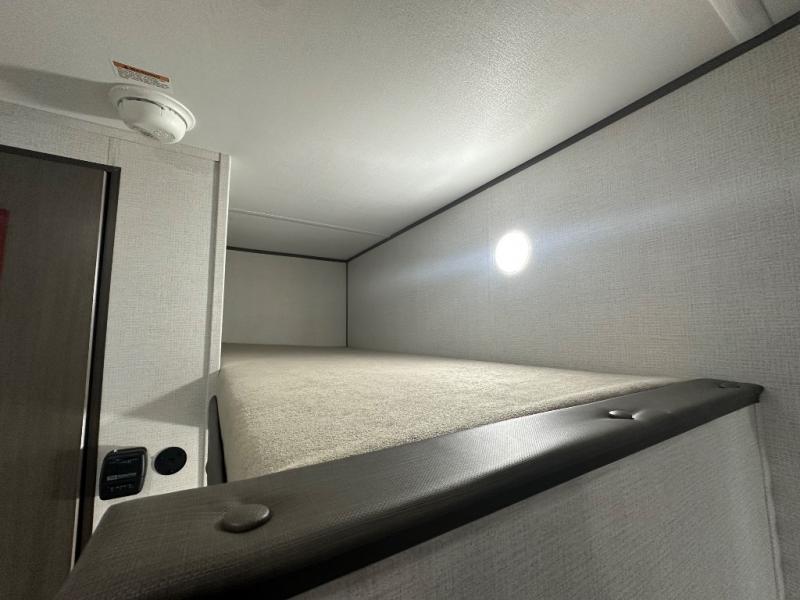 Camping trips to the lake have never been easier than with this travel trailer! The 28" x 67" bunks are right next to the private bath for easy nighttime use, and the front queen bed includes hidden storage for your things. There is also a 66" Jack knife sofa that provides a little more sleeping space for guests. A full kitchen lets you cook meals each day and there is an exterior LP quick connect if you want to fire up your own propane grill.
