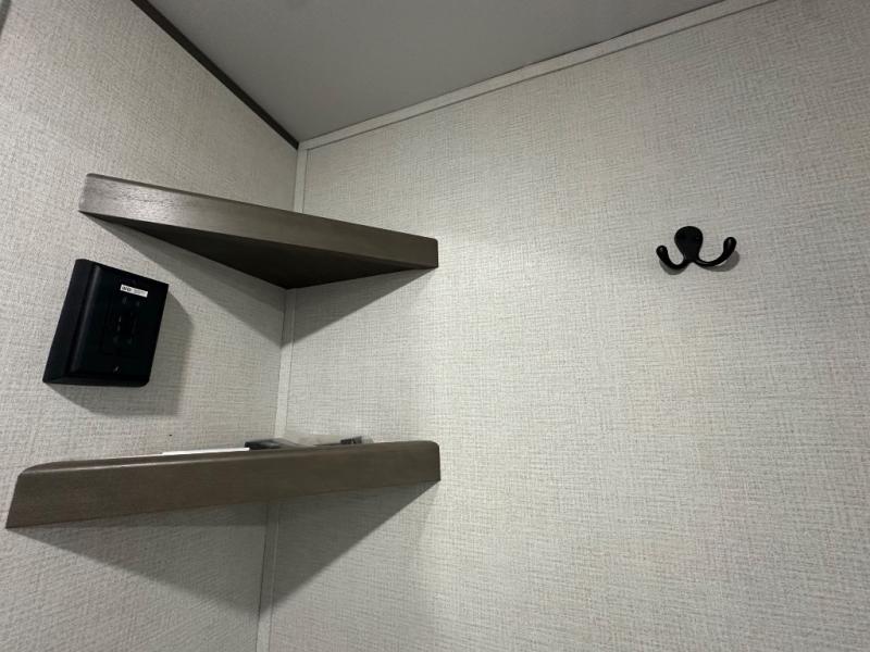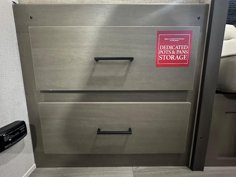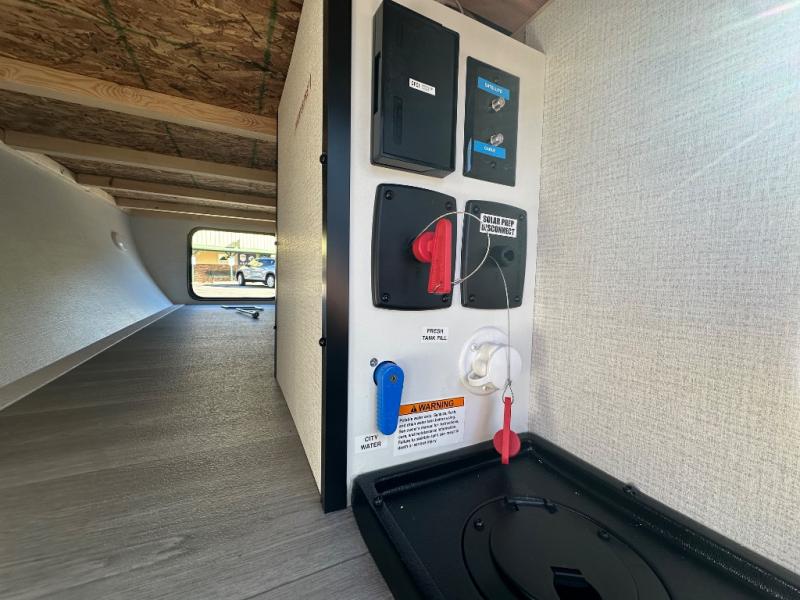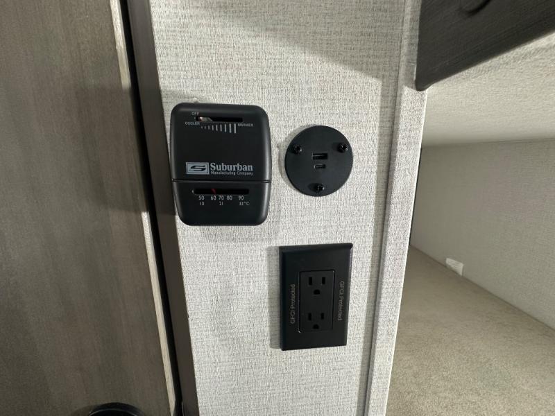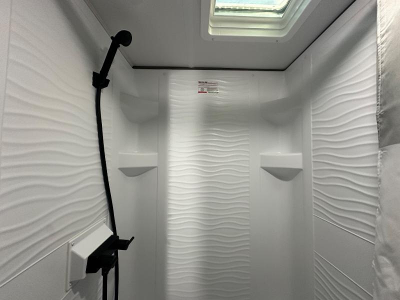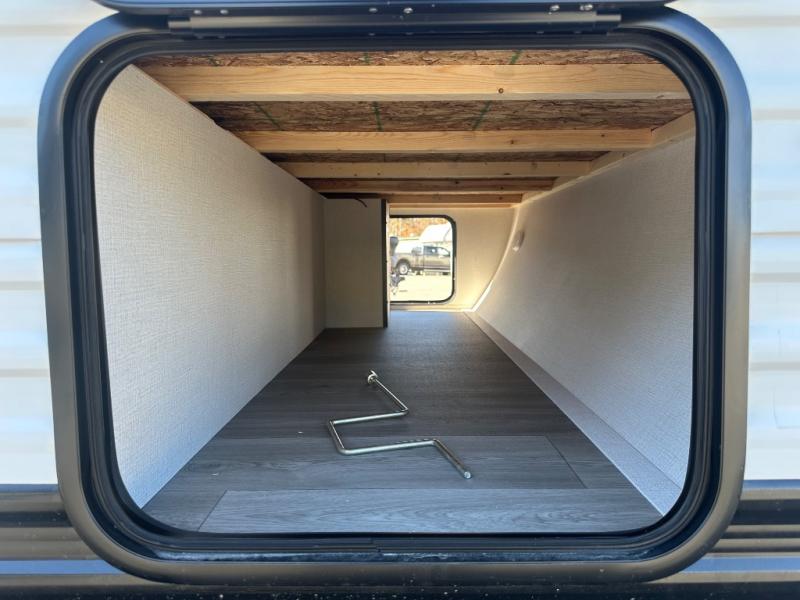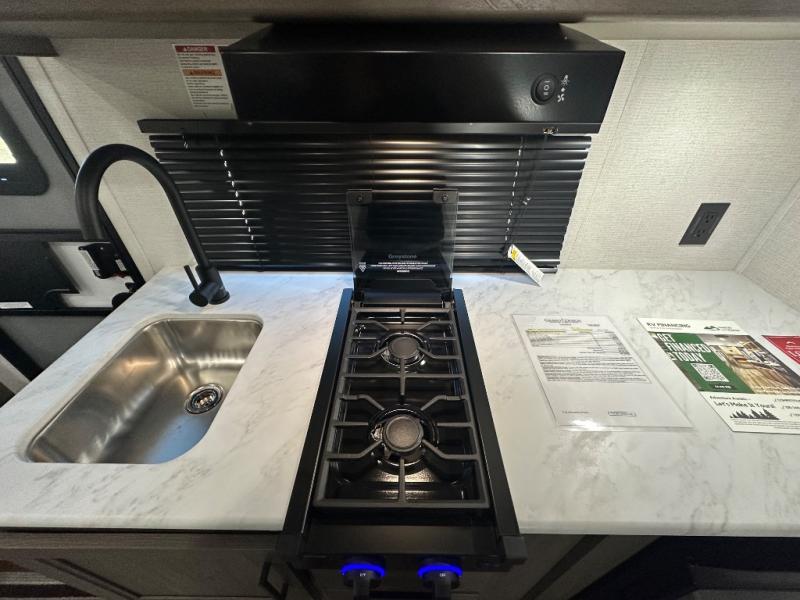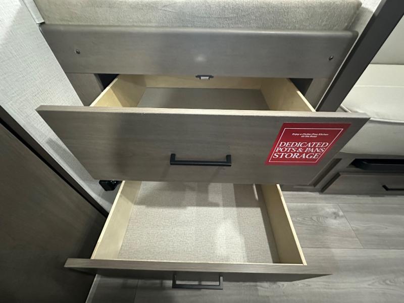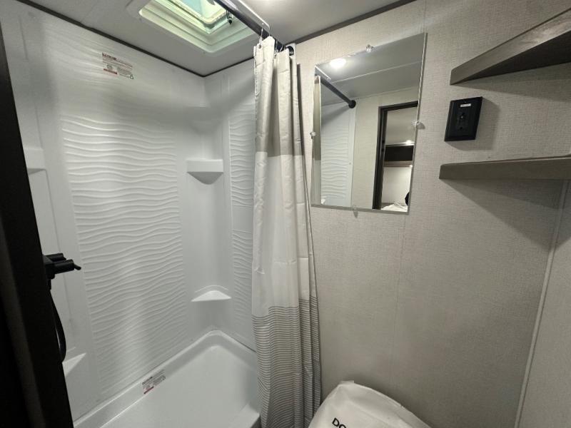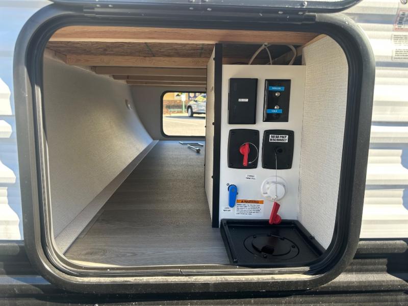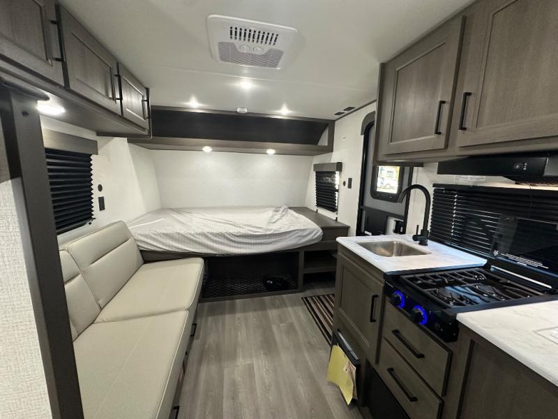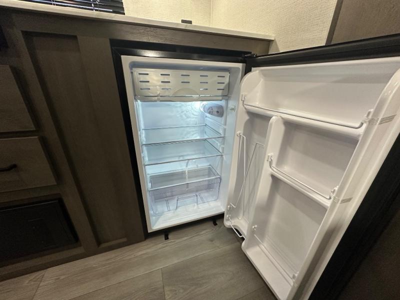 Camping trips to the lake have never been easier than with this travel trailer! The 28" x 67" bunks are right next to the private bath for easy nighttime use, and the front queen bed includes hidden storage for your things. There is also a 66" Jack knife sofa that provides a little more sleeping space for guests. A full kitchen lets you cook meals each day and there is an exterior LP quick connect if you want to fire up your own propane grill.