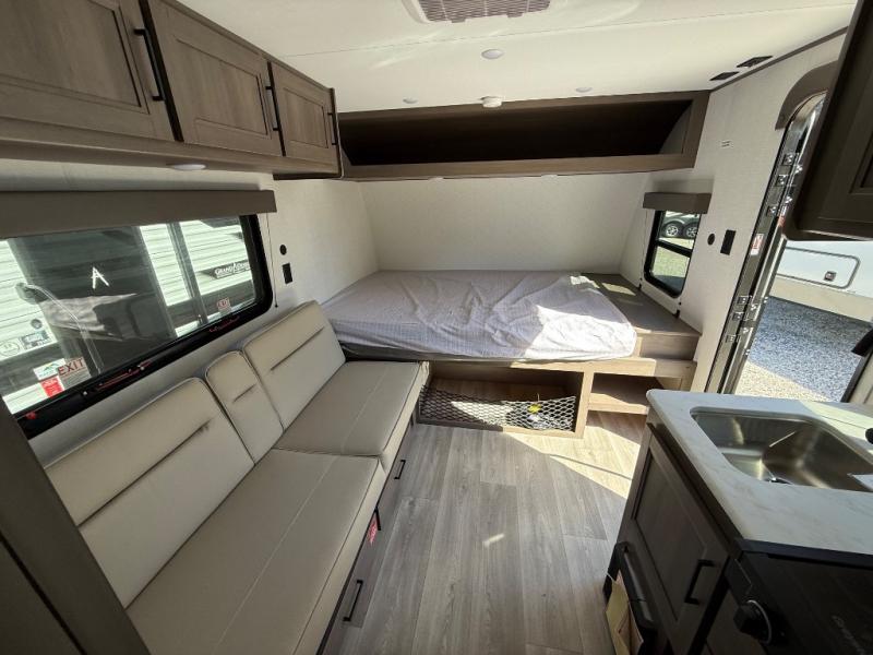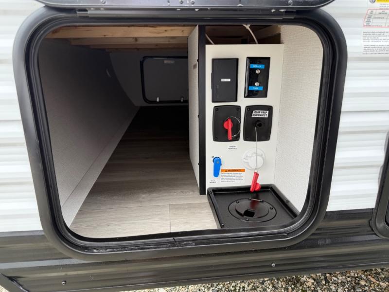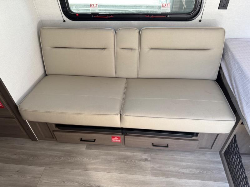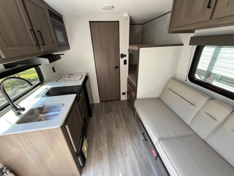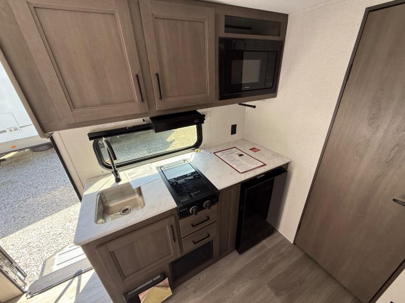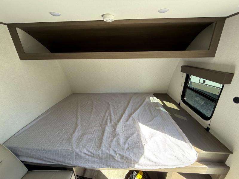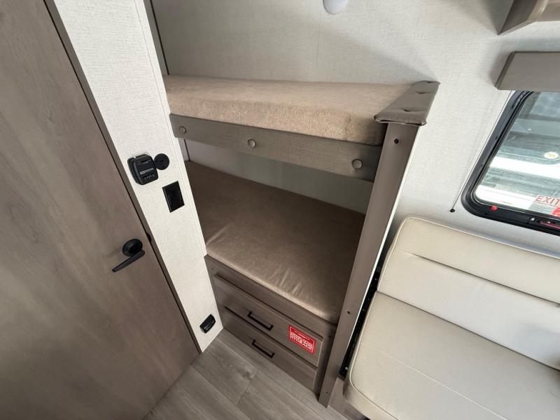 Camping trips to the lake have never been easier than with this travel trailer! The 28" x 67" bunks are right next to the private bath for easy nighttime use, and the front queen bed includes hidden storage for your things. There is also a 66" Jack knife sofa that provides a little more sleeping space for guests. A full kitchen lets you cook meals each day and there is an exterior LP quick connect if you want to fire up your own propane grill.