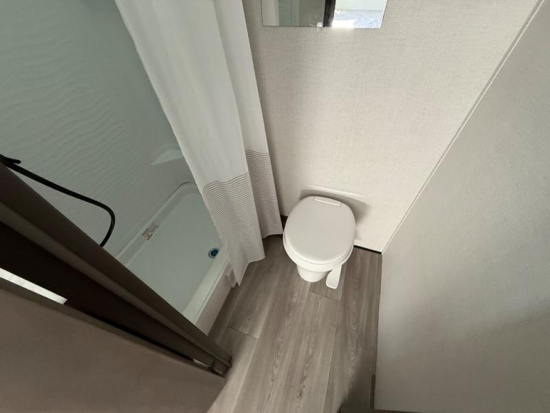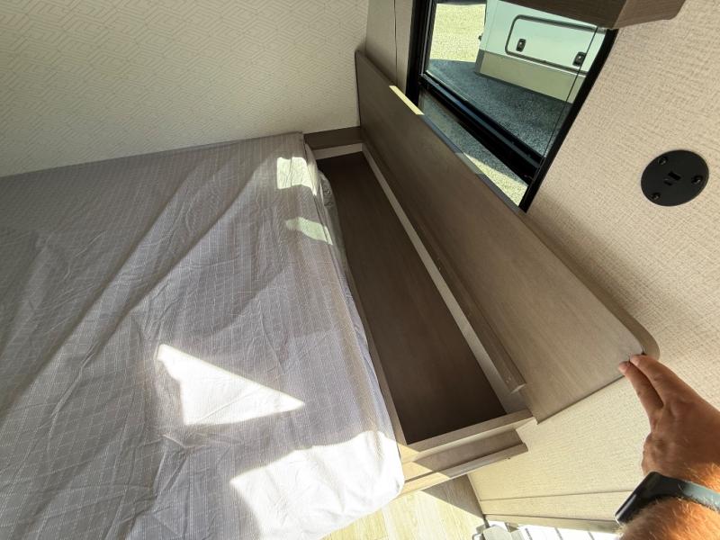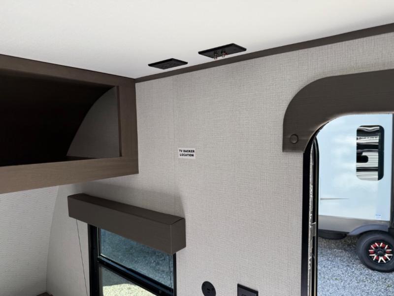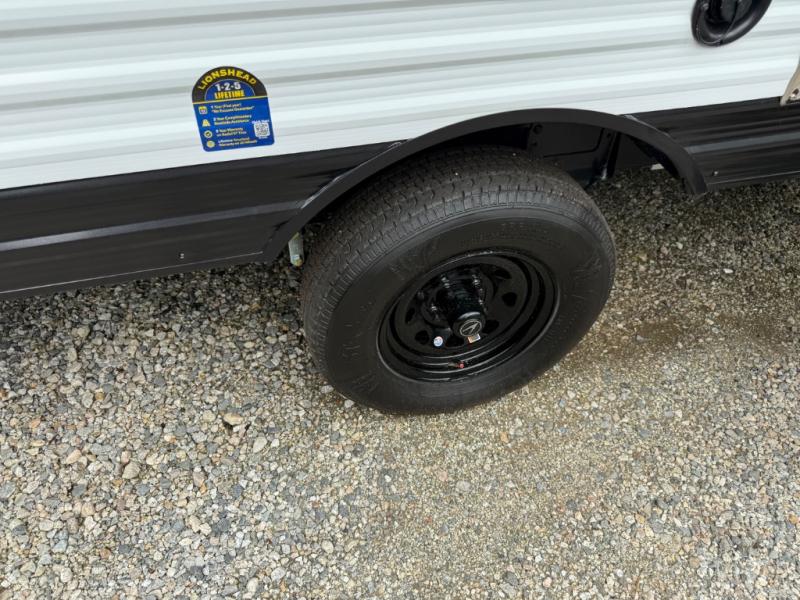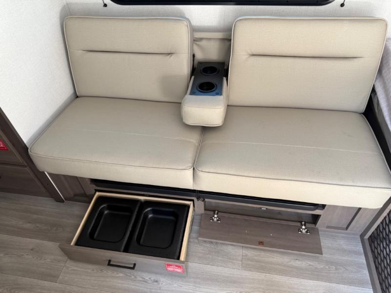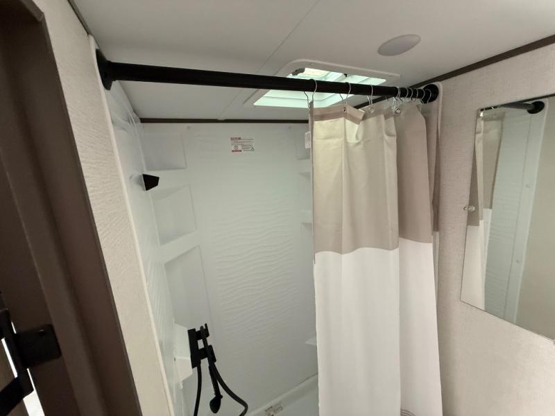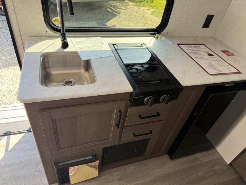 Camping trips to the lake have never been easier than with this travel trailer! The 28" x 67" bunks are right next to the private bath for easy nighttime use, and the front queen bed includes hidden storage for your things. There is also a 66" Jack knife sofa that provides a little more sleeping space for guests. A full kitchen lets you cook meals each day and there is an exterior LP quick connect if you want to fire up your own propane grill.