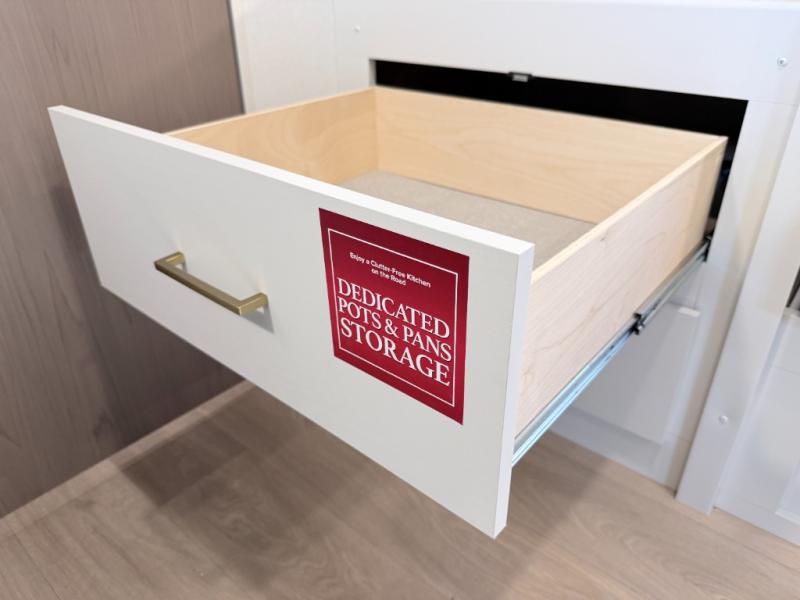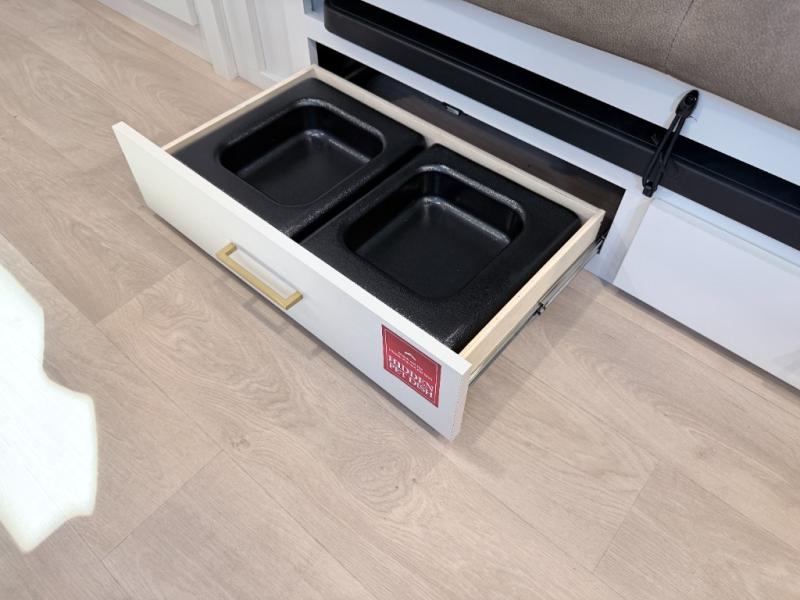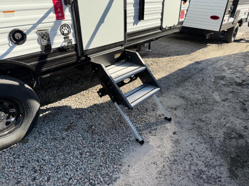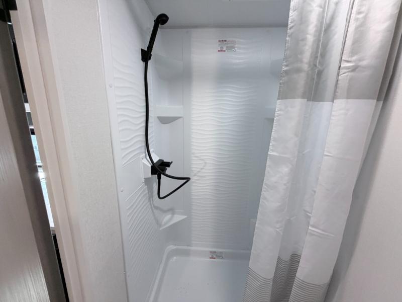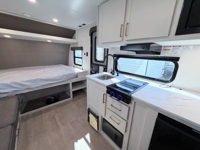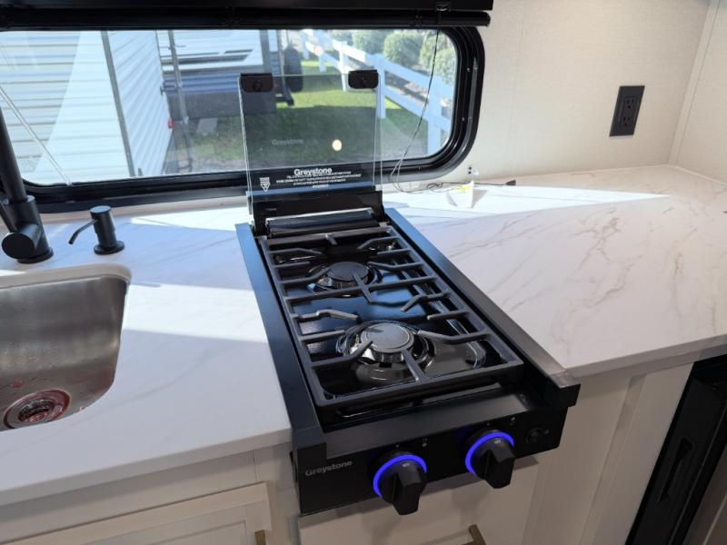 Prepare meals with ease using the travel trailer’s full kitchen, complete with a two-burner cooktop, microwave, and 12V refrigerator. When you want to enjoy the outdoors, take advantage of the exterior LP quick connect and hook up your favorite propane grill for fresh-air cooking.