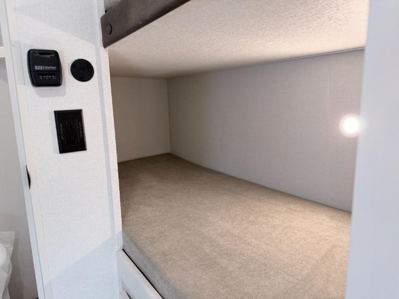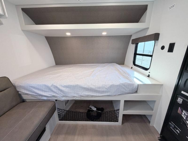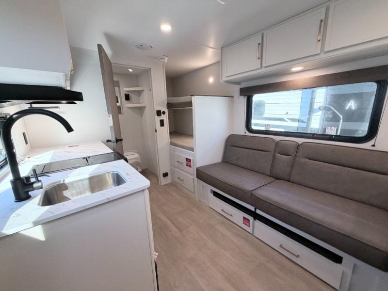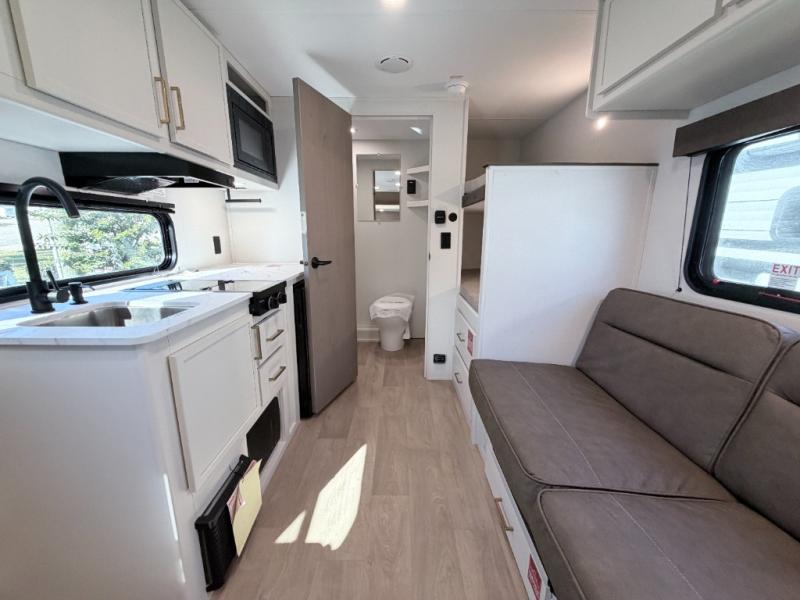 Camping trips to the lake or weekend adventures have never been easier than with the Transcend One 151BH! The 28" x 67" bunks sit right next to the private bath for convenient nighttime access, and the front queen bed includes hidden storage for extra blankets, gear, or clothing. A 66" jackknife sofa adds additional seating and sleeping space for guests.