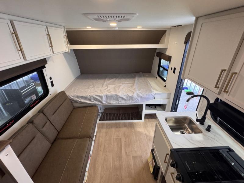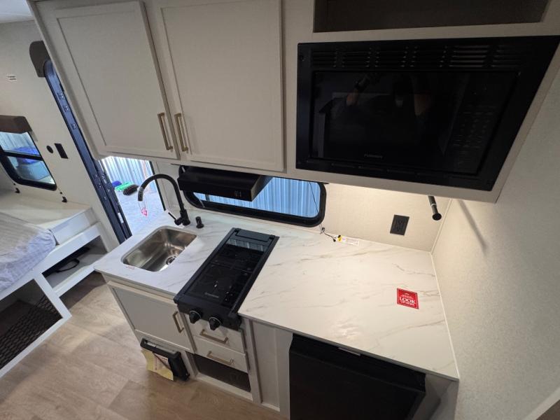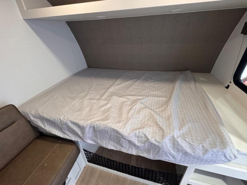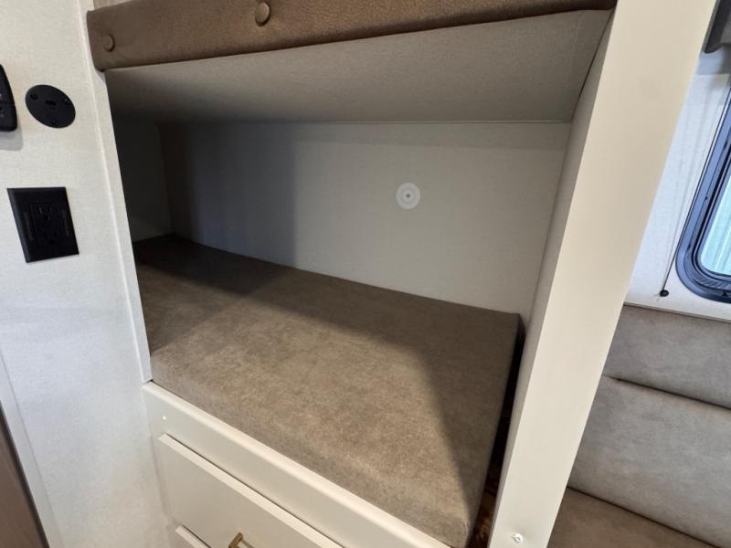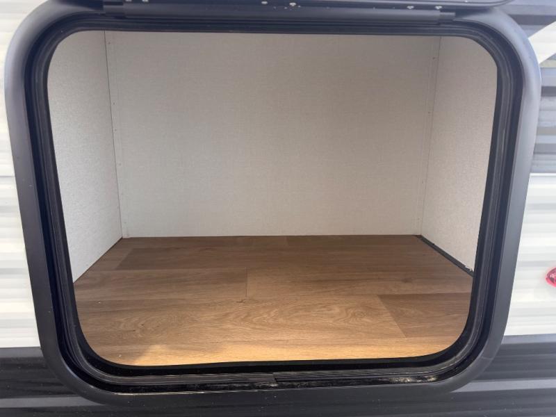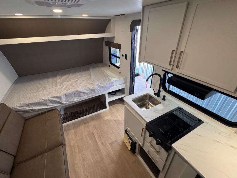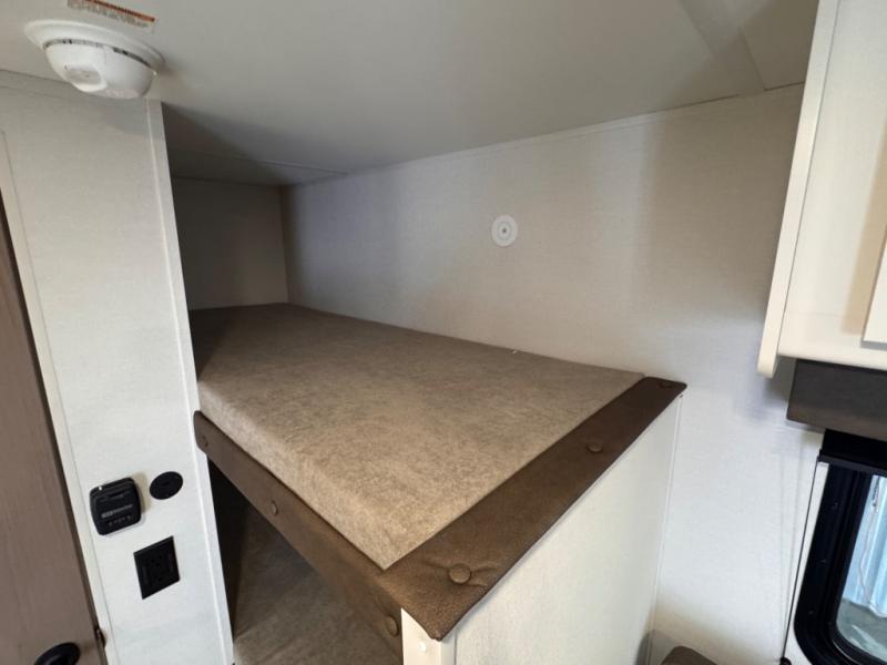 Camping trips to the lake have never been easier than with this travel trailer! The 28" x 67" bunks are right next to the private bath for easy nighttime use, and the front queen bed includes hidden storage for your things. There is also a 66" Jack knife sofa that provides a little more sleeping space for guests. A full kitchen lets you cook meals each day and there is an exterior LP quick connect if you want to fire up your own propane grill.