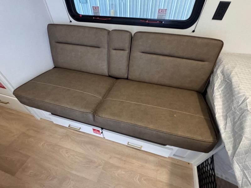Camping trips to the lake have never been easier than with this travel trailer! The 28" x 67" bunks are right next to the private bath for easy nighttime use, and the front queen bed includes hidden storage for your things. There is also a 66" Jack knife sofa that provides a little more sleeping space for guests. A full kitchen lets you cook meals each day and there is an exterior LP quick connect if you want to fire up your own propane grill.