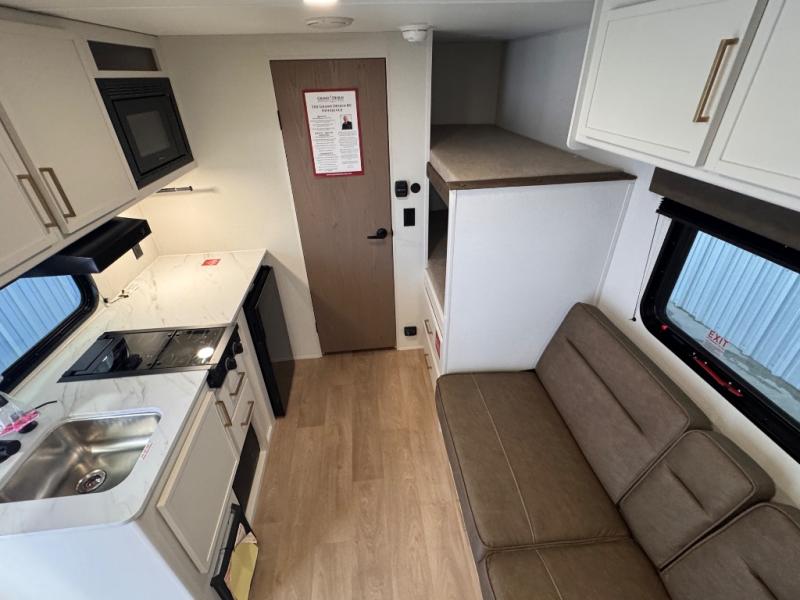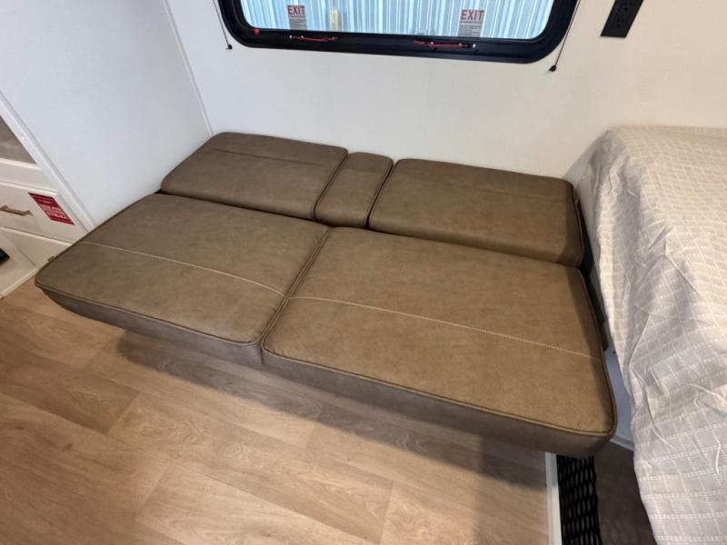 Camping trips to the lake have never been easier than with this travel trailer! The 28" x 67" bunks are right next to the private bath for easy nighttime use, and the front queen bed includes hidden storage for your things. There is also a 66" Jack knife sofa that provides a little more sleeping space for guests. A full kitchen lets you cook meals each day and there is an exterior LP quick connect if you want to fire up your own propane grill.