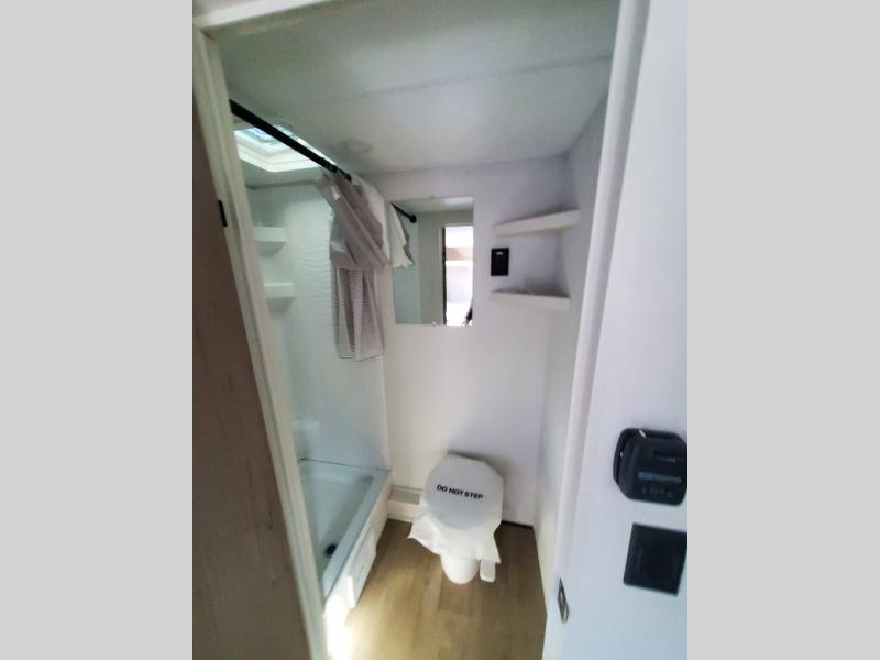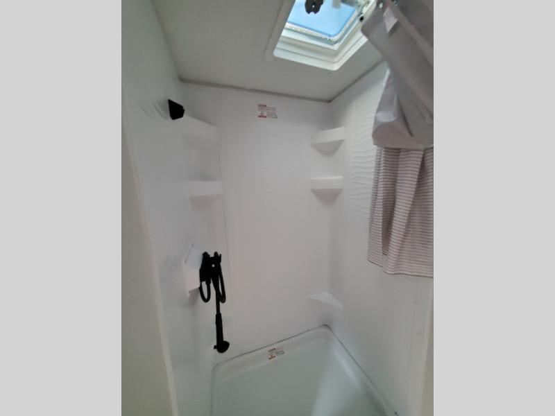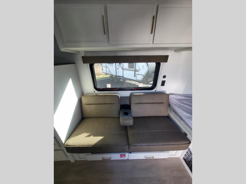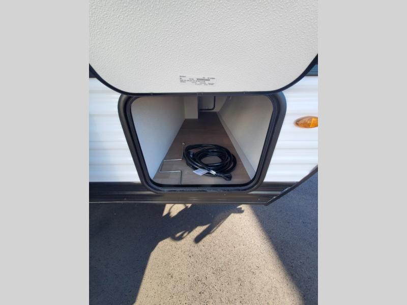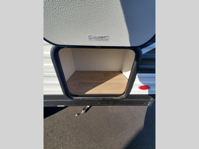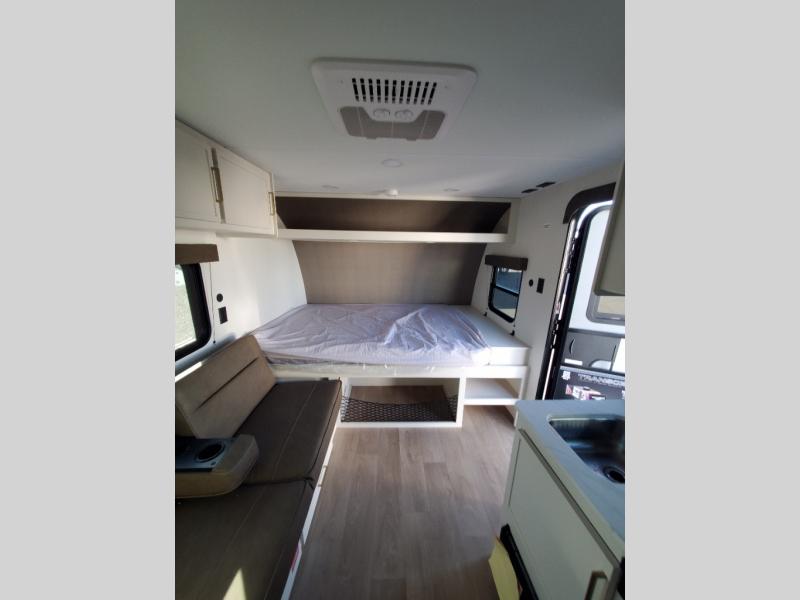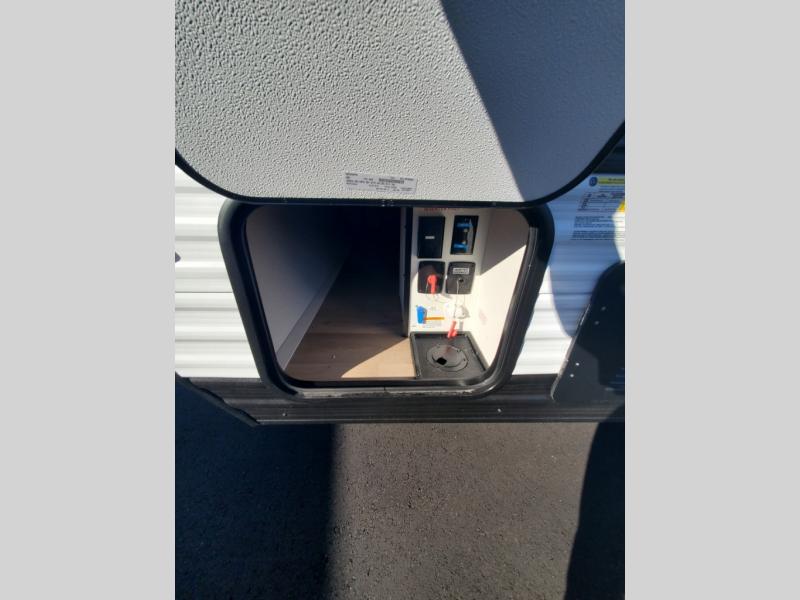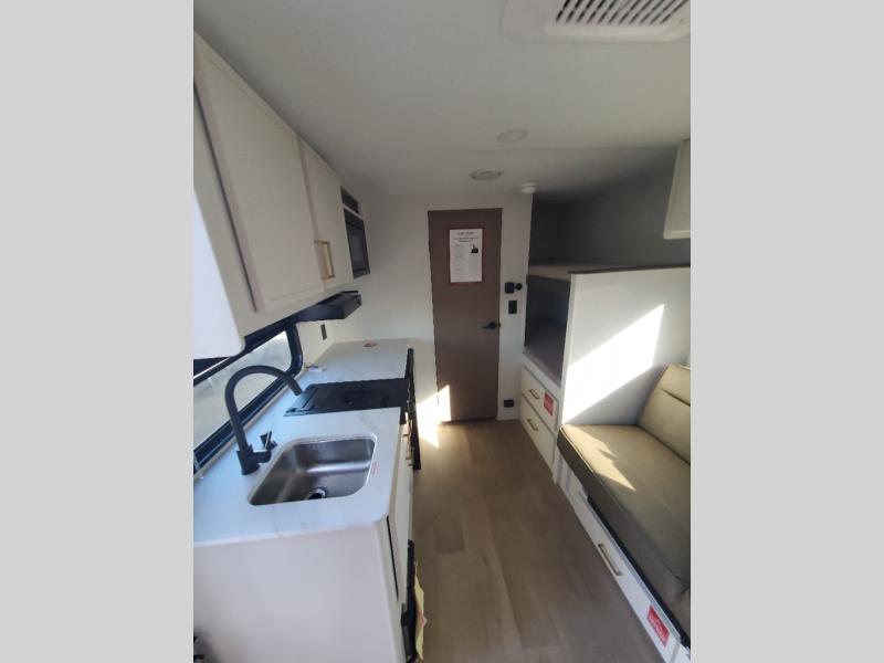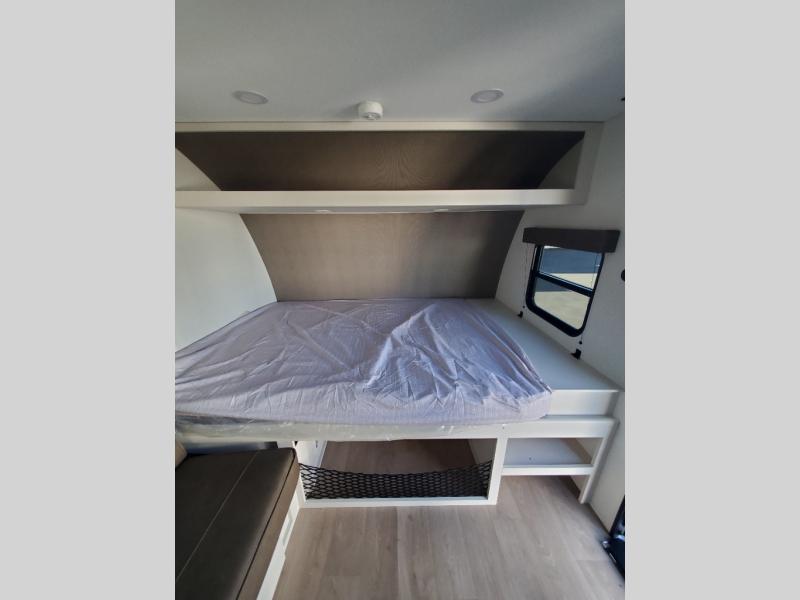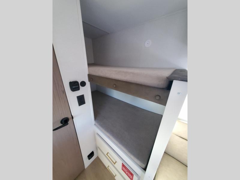 Camping trips to the lake have never been easier than with this travel trailer! The 28" x 67" bunks are right next to the private bath for easy nighttime use, and the front queen bed includes hidden storage for your things. There is also a 66" Jack knife sofa that provides a little more sleeping space for guests. A kitchen lets you cook meals each day and there is an exterior LP quick connect if you want to fire up your own propane grill.
