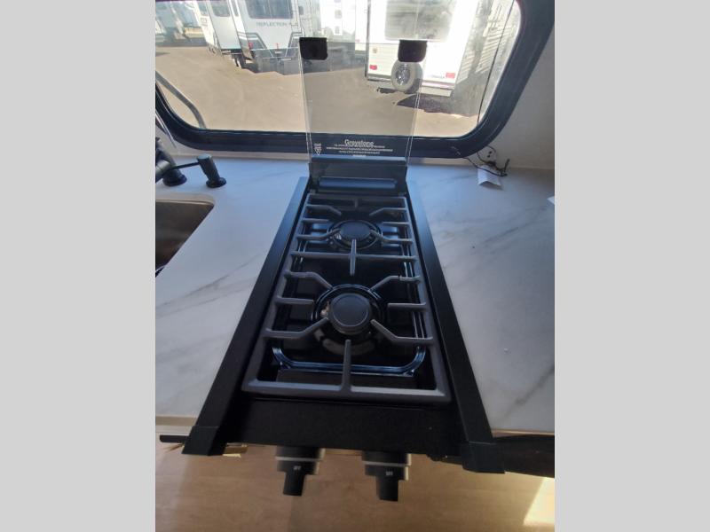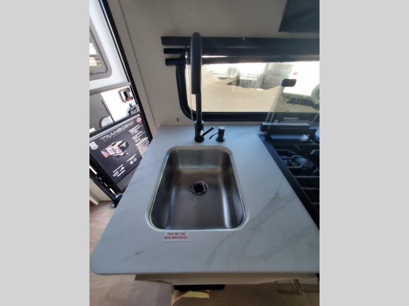 With any Transcend One travel trailer by Grand Design, you will enjoy lightweight towing thanks to their single-axle. There are many interior comforts to make camping easier than ever, such as recessed lighting, residential countertops, and a 6' 6" interior height. Each model is constructed with a heated and enclosed underbelly with suspended tanks, a moisture barrier floor enclosure, and Thermofoil over the roof and front cap for added protection. And a JBL sound system will let you listen to tunes as you visit under the power awning with a Fusion light!