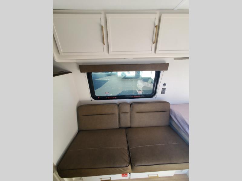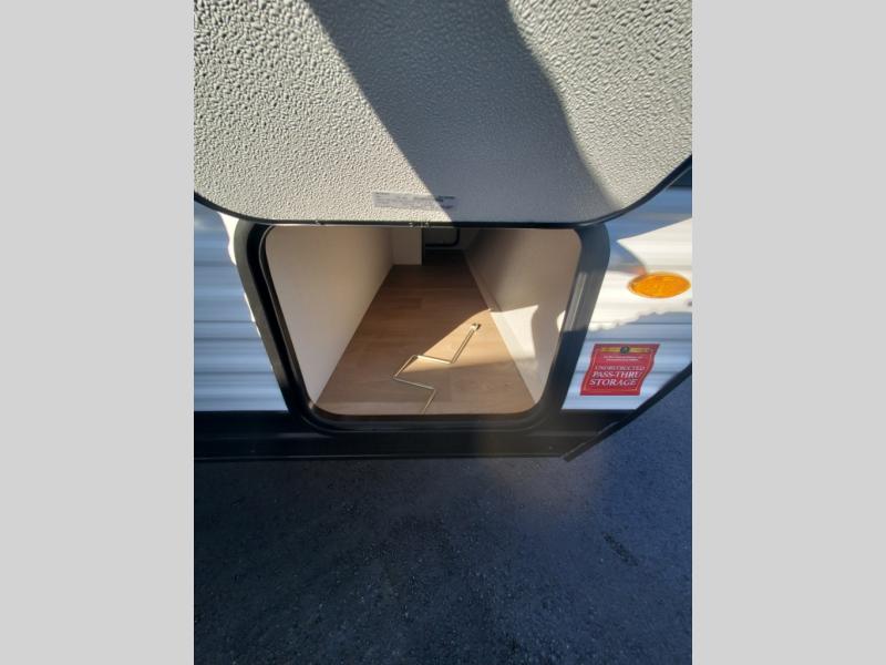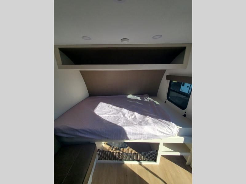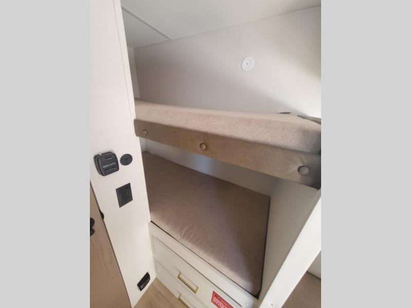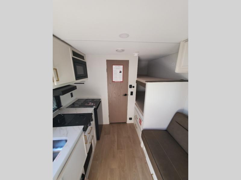Camping trips to the lake have never been easier than with this travel trailer! The 28" x 67" bunks are right next to the private bath for easy nighttime use, and the front queen bed includes hidden storage for your things. There is also a 66" Jack knife sofa that provides a little more sleeping space for guests. A kitchen lets you cook meals each day and there is an exterior LP quick connect if you want to fire up your own propane grill.