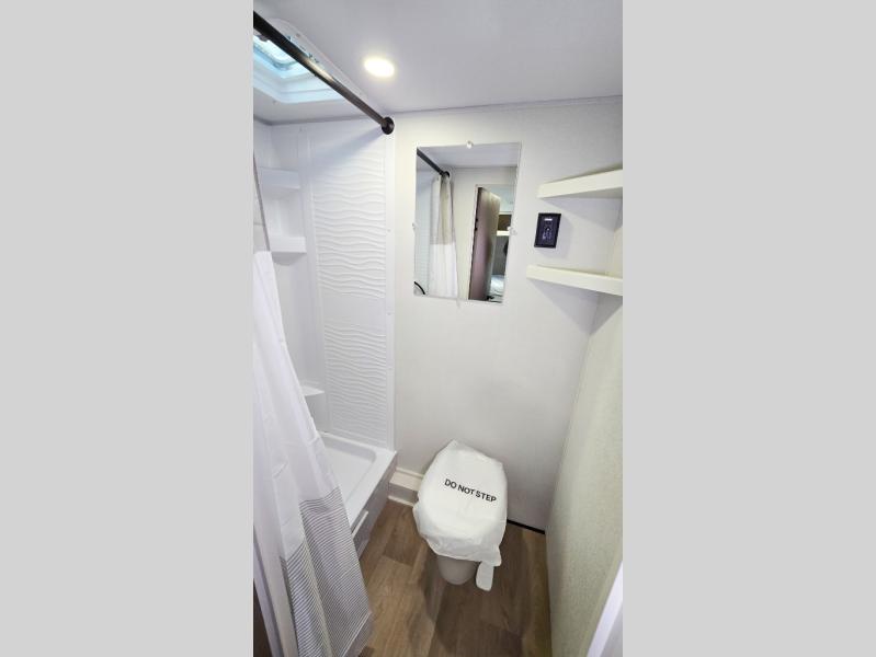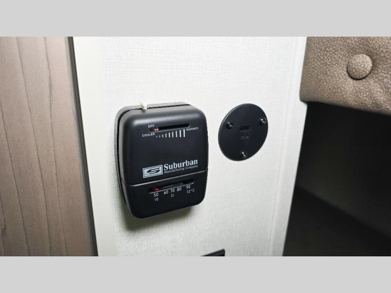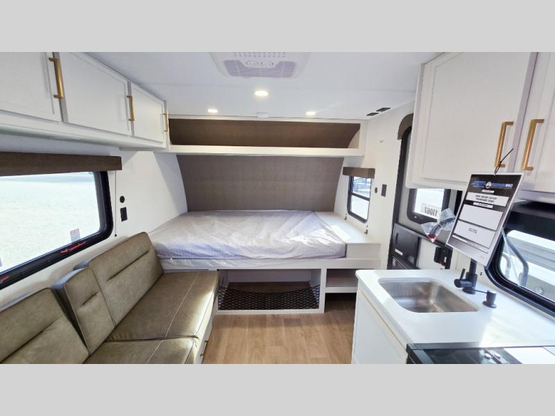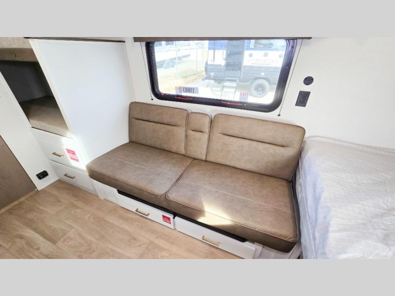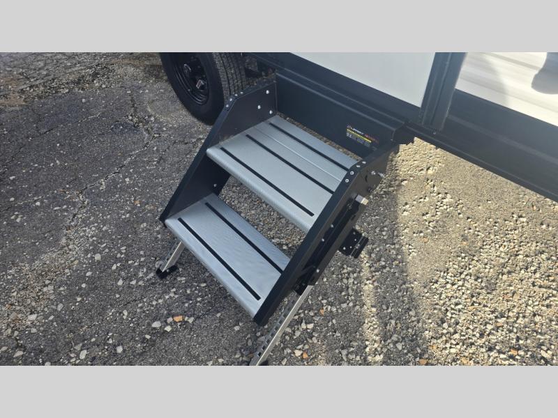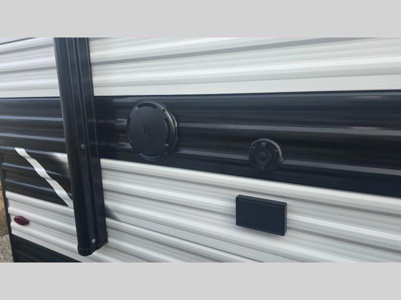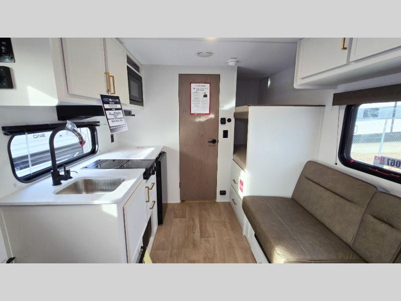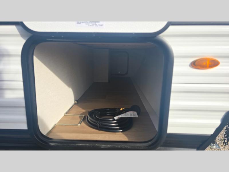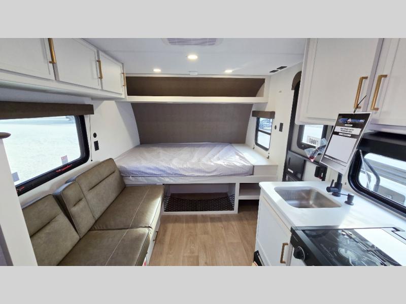 Camping trips to the lake have never been easier than with this travel trailer! The 28" x 67" bunks are right next to the private bath for easy nighttime use, and the front queen bed includes hidden storage for your things. There is also a 66" Jack knife sofa that provides a little more sleeping space for guests. A kitchen lets you cook meals each day and there is an exterior LP quick connect if you want to fire up your own propane grill.