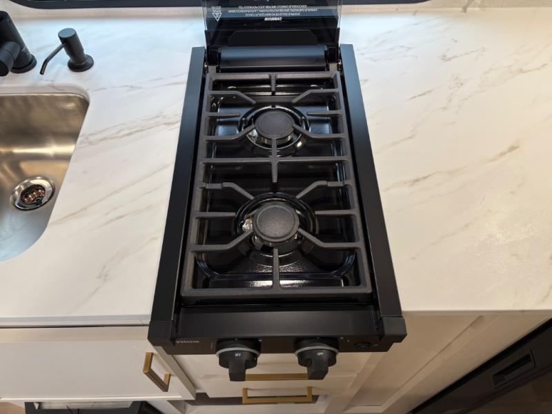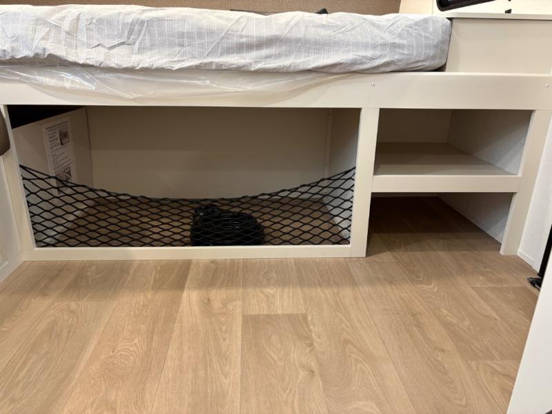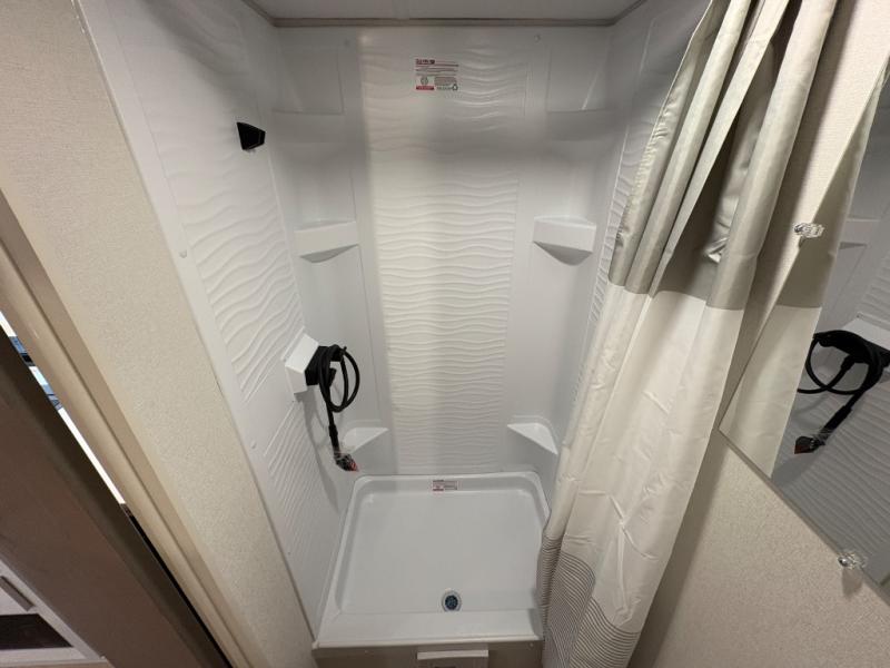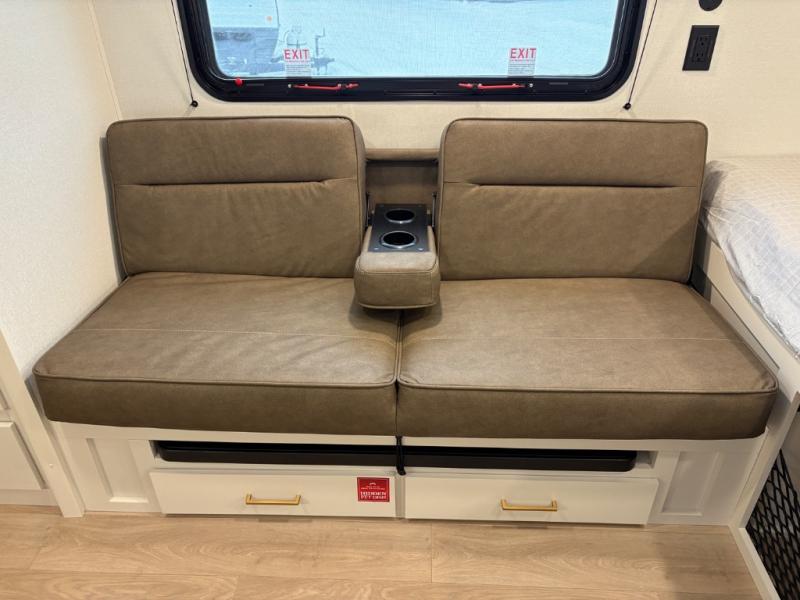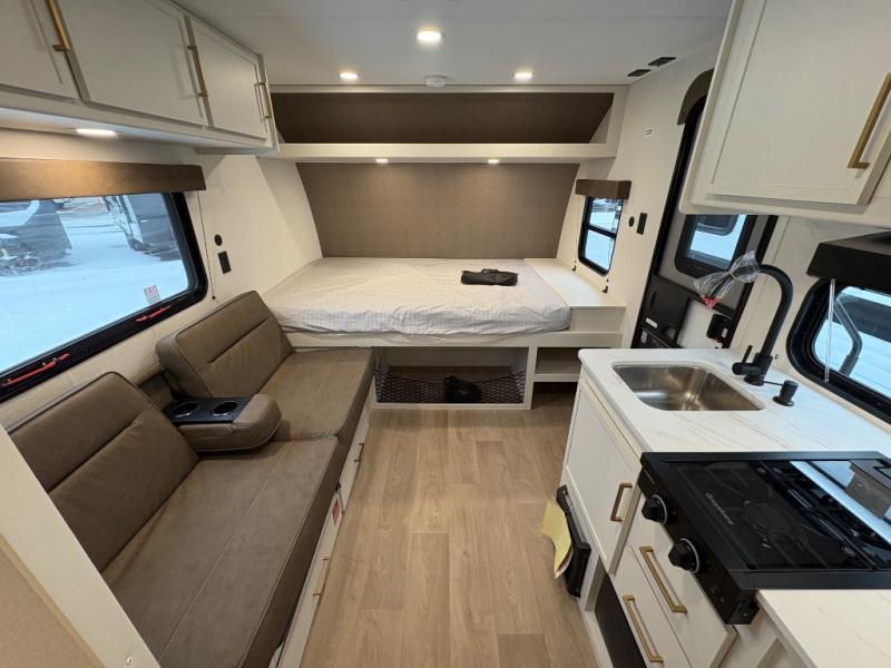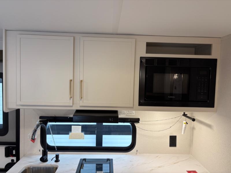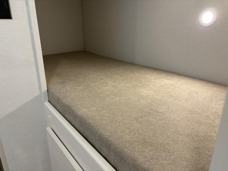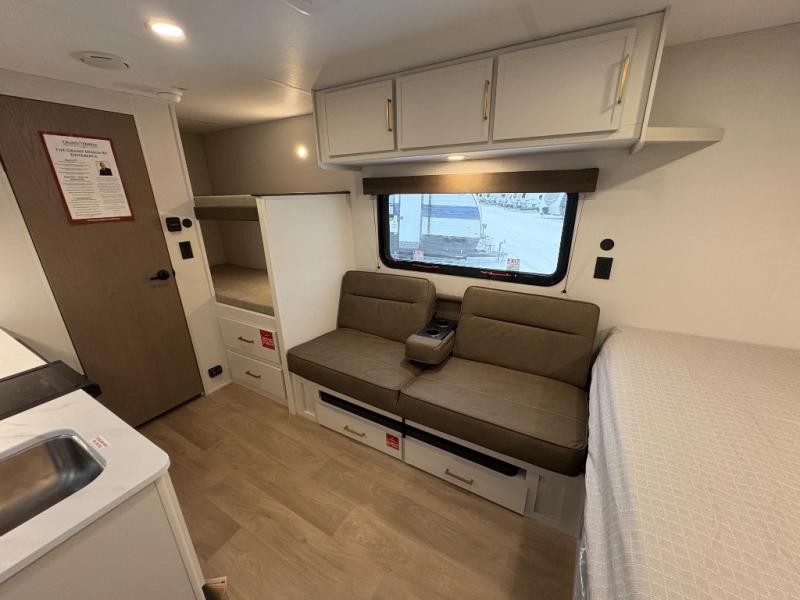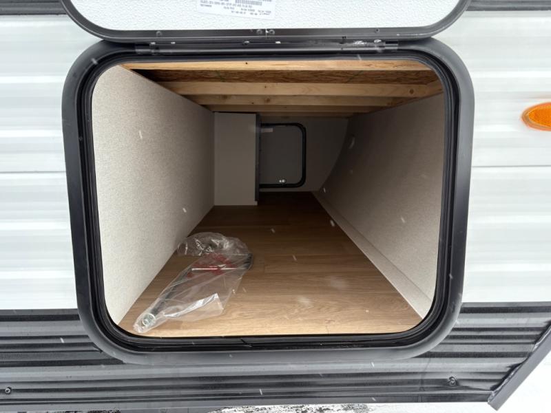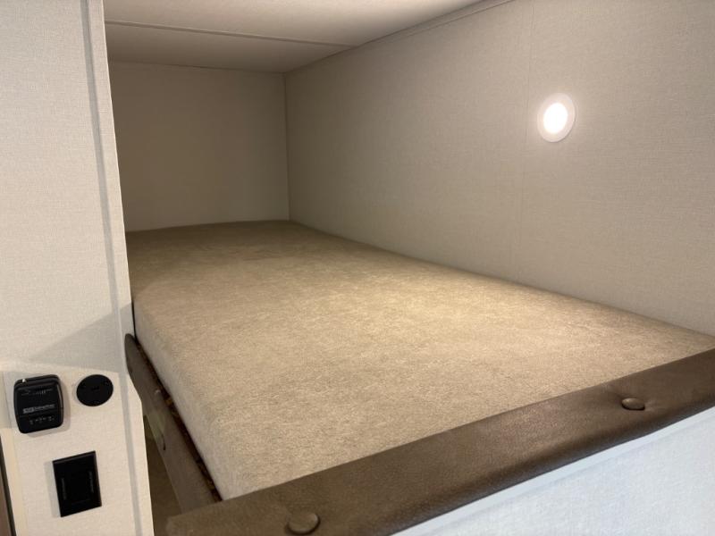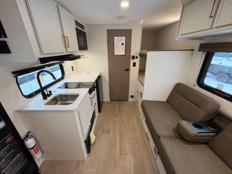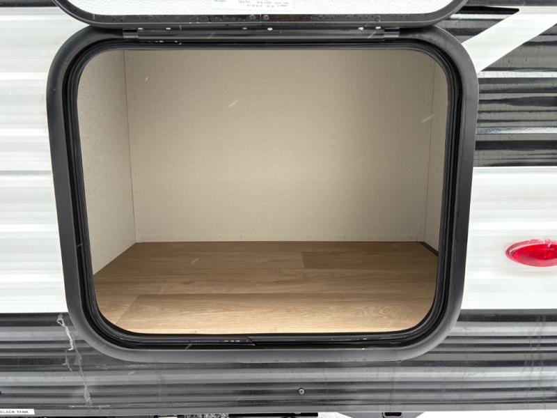 Camping trips to the lake have never been easier than with this travel trailer! The 28" x 67" bunks are right next to the private bath for easy nighttime use, and the front queen bed includes hidden storage for your things. There is also a 66" Jack knife sofa that provides a little more sleeping space for guests. A kitchen lets you cook meals each day and there is an exterior LP quick connect if you want to fire up your own propane grill.