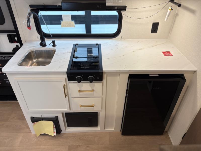 With any Transcend One travel trailer by Grand Design, you will enjoy lightweight towing thanks to their single-axle. There are many interior comforts to make camping easier than ever, such as recessed lighting, residential countertops, and a 6' 6" interior height. Each model is constructed with a heated and enclosed underbelly with suspended tanks, a moisture barrier floor enclosure, and Thermofoil over the roof and front cap for added protection. And a JBL sound system will let you listen to tunes as you visit under the power awning with a Fusion light!
