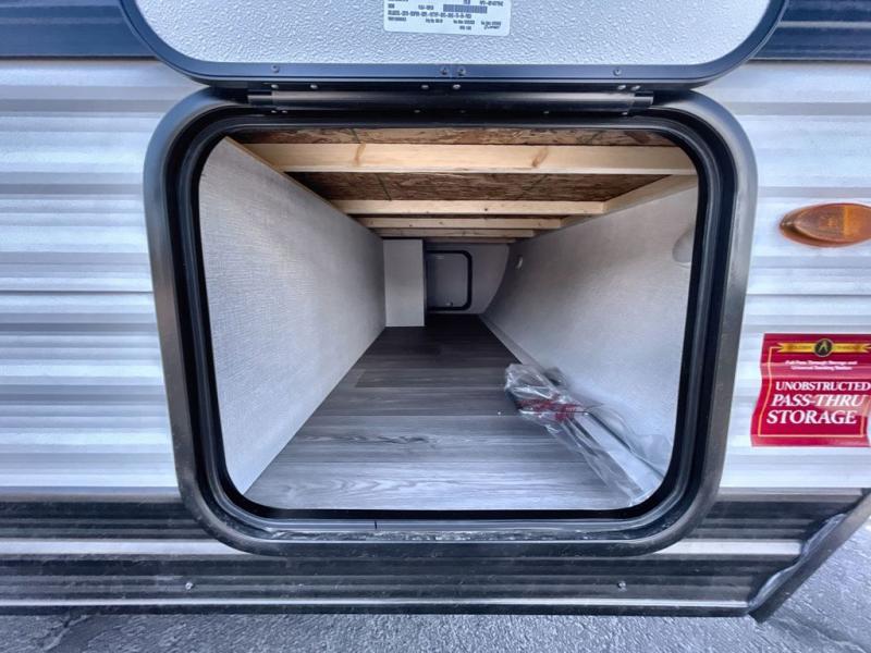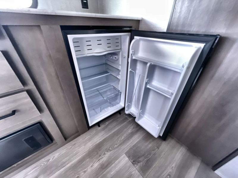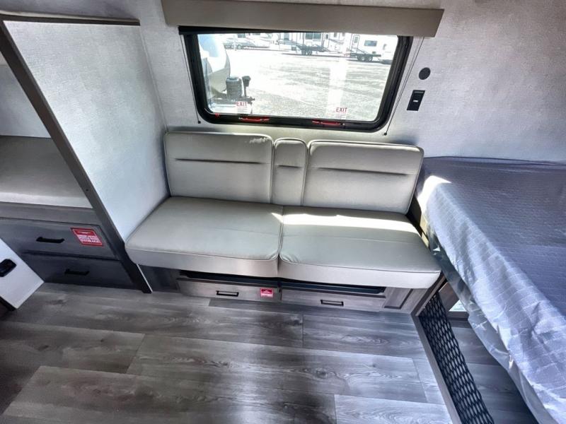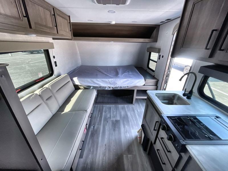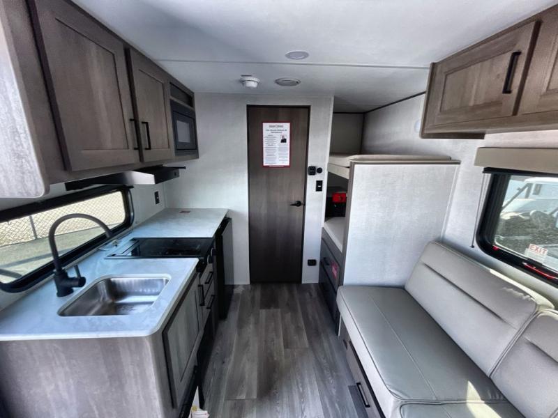 Camping trips to the lake have never been easier than with this travel trailer! The 28" x 67" bunks are right next to the private bath for easy nighttime use, and the front queen bed includes hidden storage for your things. There is also a 66" Jack knife sofa that provides a little more sleeping space for guests. A kitchen lets you cook meals each day and there is an exterior LP quick connect if you want to fire up your own propane grill.