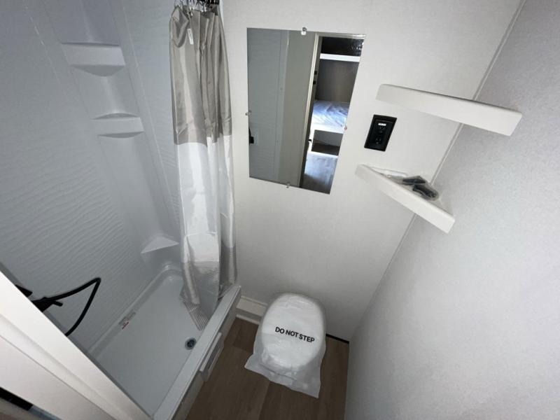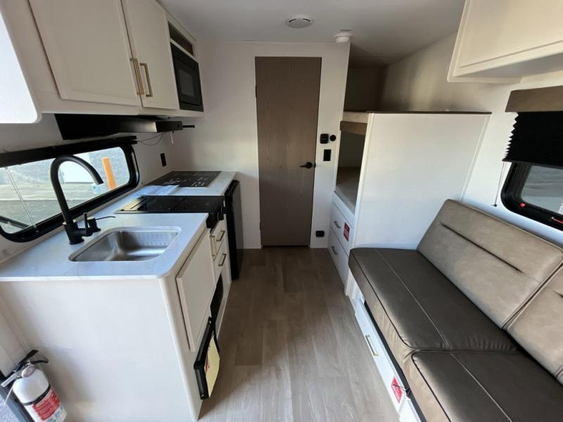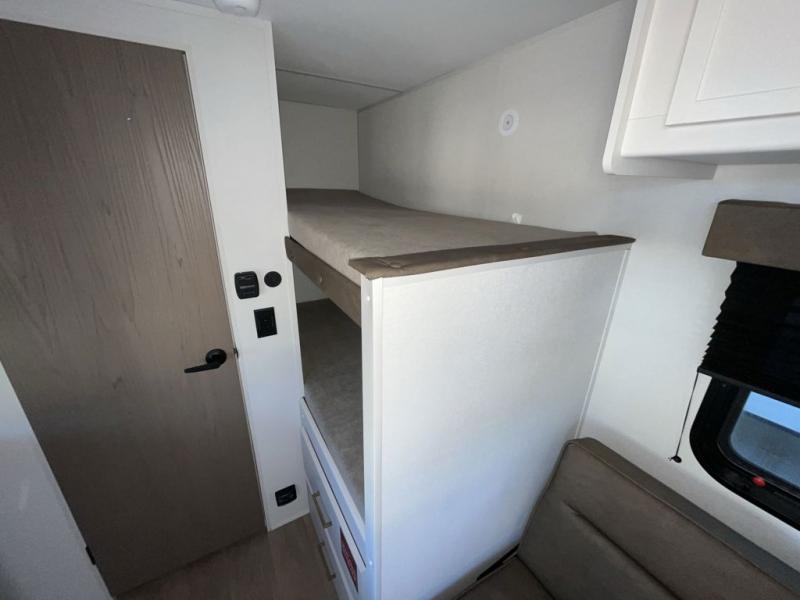 Camping trips to the lake have never been easier than with this travel trailer! The 28" x 67" bunks are right next to the private bath for easy nighttime use, and the front queen bed includes hidden storage for your things. There is also a 66" Jack knife sofa that provides a little more sleeping space for guests. A kitchen lets you cook meals each day and there is an exterior LP quick connect if you want to fire up your own propane grill.
