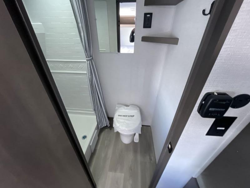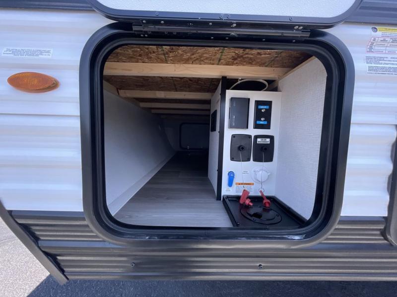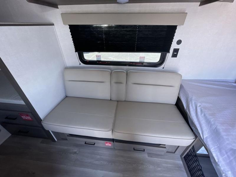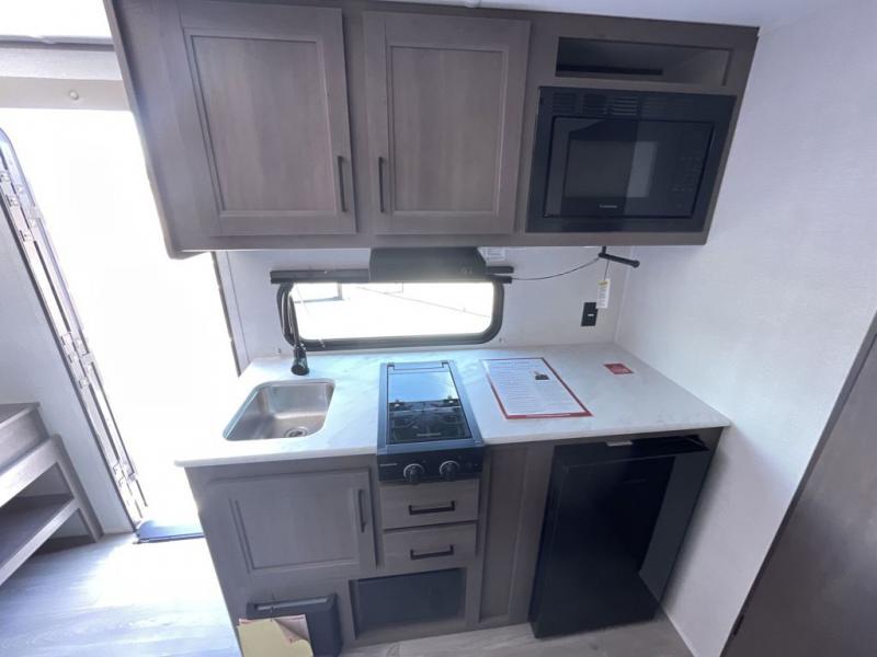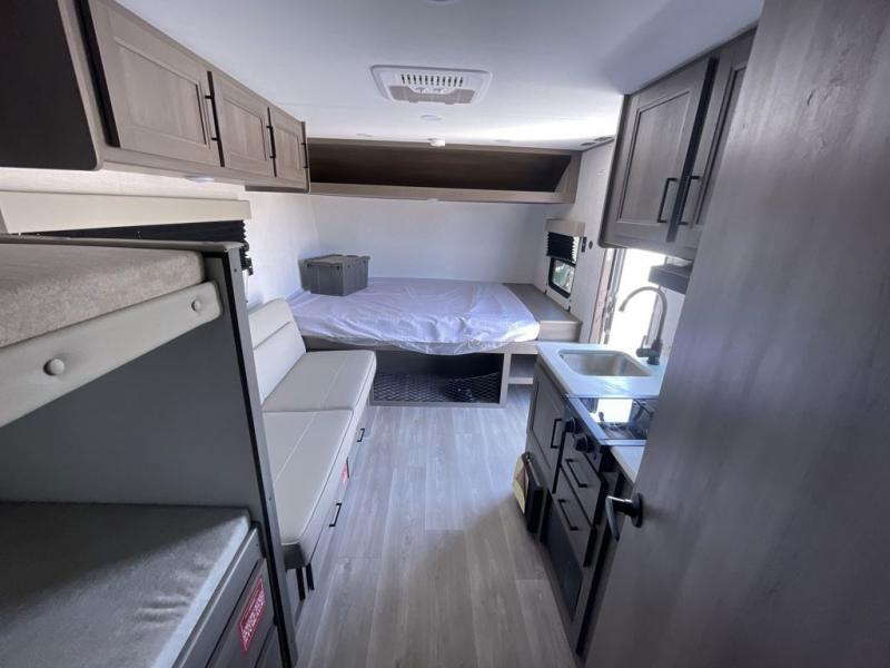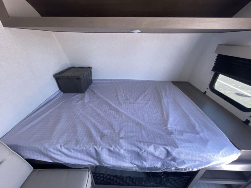 Camping trips to the lake have never been easier than with this travel trailer! The 28" x 67" bunks are right next to the private bath for easy nighttime use, and the front queen bed includes hidden storage for your things. There is also a 66" Jack knife sofa that provides a little more sleeping space for guests. A kitchen lets you cook meals each day and there is an exterior LP quick connect if you want to fire up your own propane grill.
