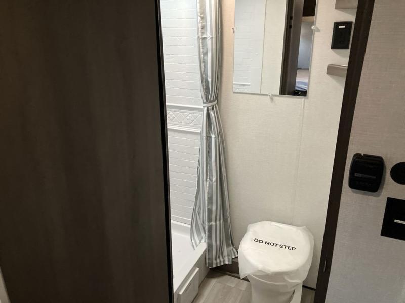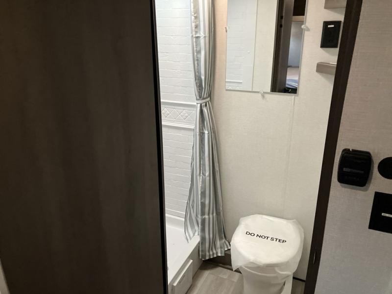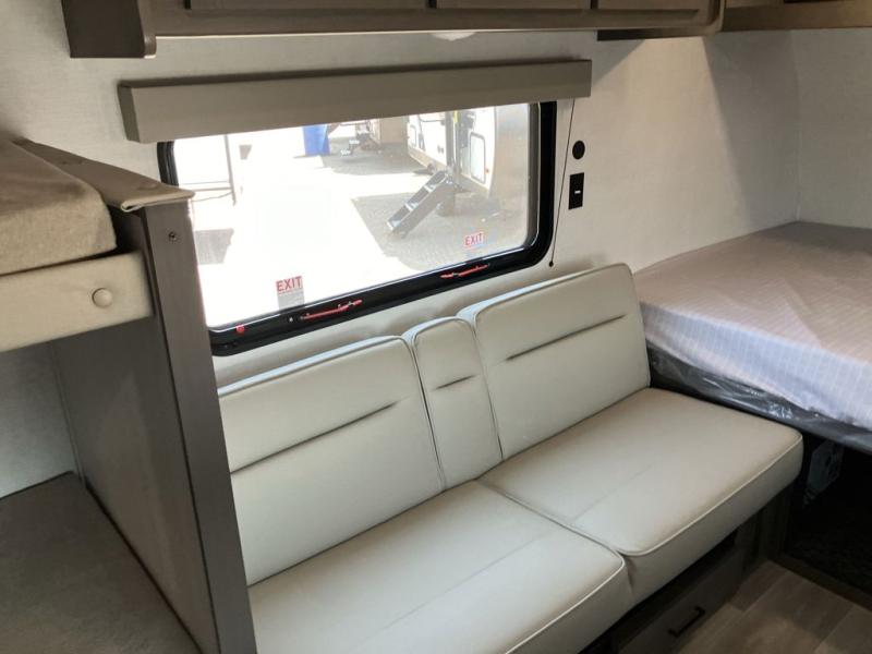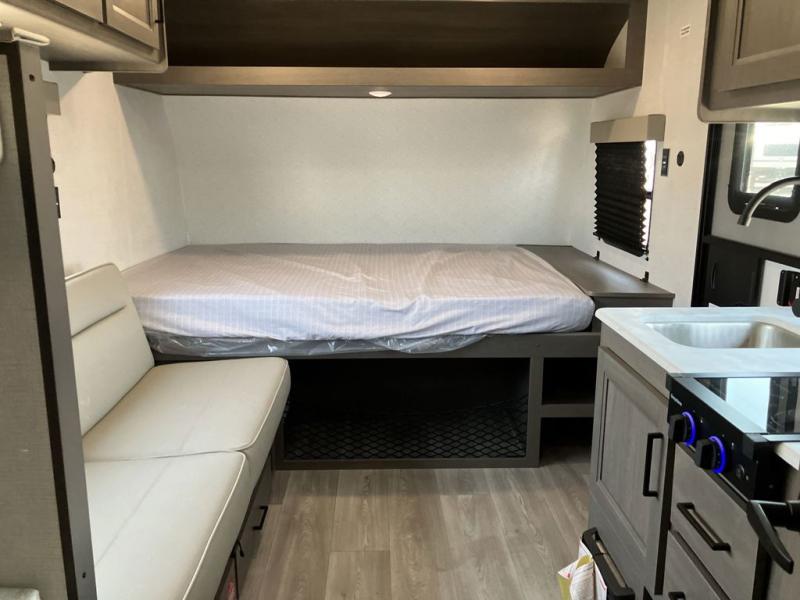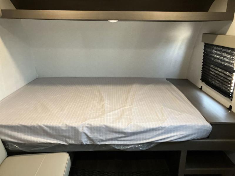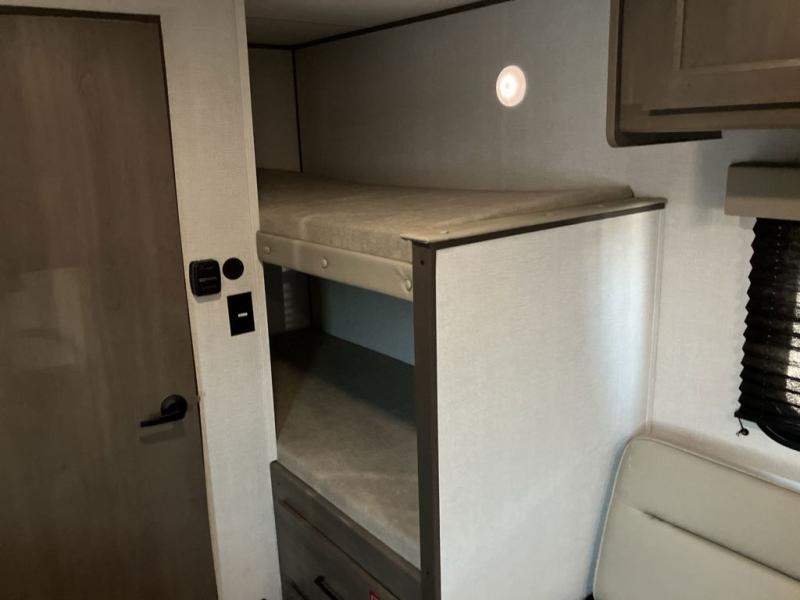 Camping trips to the lake have never been easier than with this travel trailer! The 28" x 67" bunks are right next to the private bath for easy nighttime use, and the front queen bed includes hidden storage for your things. There is also a 66" Jack knife sofa that provides a little more sleeping space for guests. A kitchen lets you cook meals each day and there is an exterior LP quick connect if you want to fire up your own propane grill.