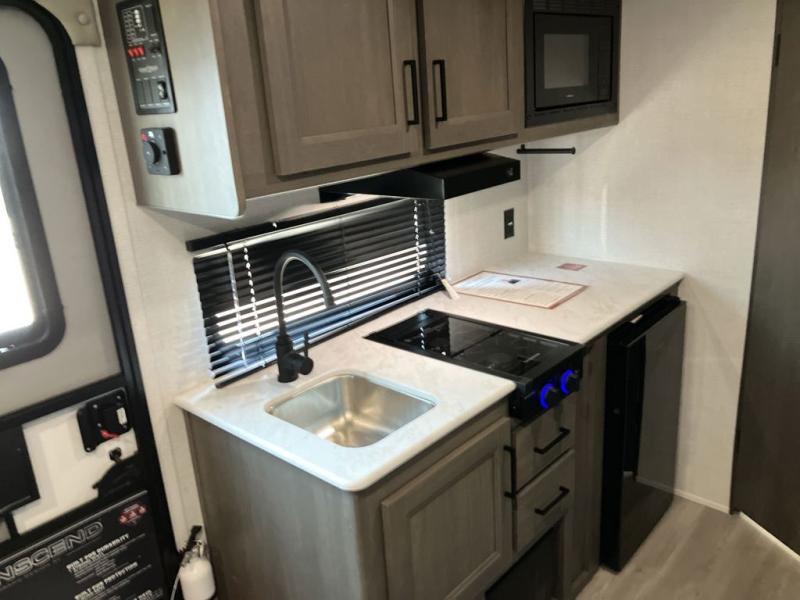 With any Transcend One travel trailer by Grand Design, you will enjoy lightweight towing thanks to their single-axle. There are many interior comforts to make camping easier than ever, such as recessed lighting, residential countertops, and a 6' 6" interior height. Each model is constructed with a heated and enclosed underbelly with suspended tanks, a moisture barrier floor enclosure, and Thermofoil over the roof and front cap for added protection. And a JBL sound system will let you listen to tunes as you visit under the power awning with a Fusion light!