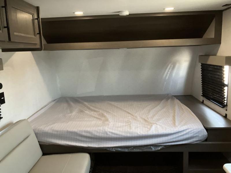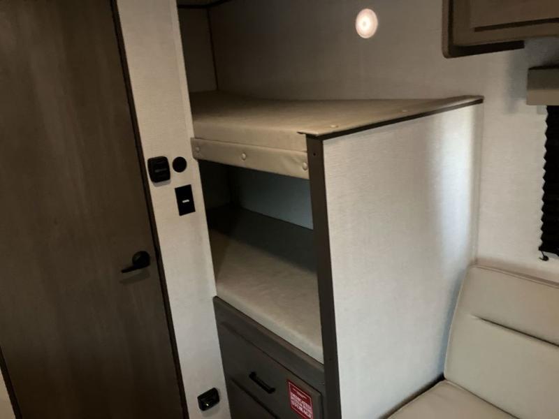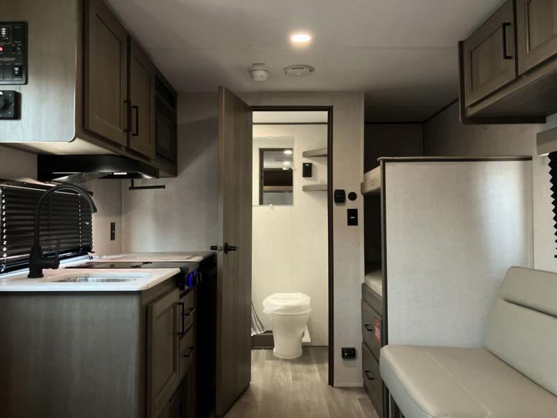 Camping trips to the lake have never been easier than with this travel trailer! The 28" x 67" bunks are right next to the private bath for easy nighttime use, and the front queen bed includes hidden storage for your things. There is also a 66" Jack knife sofa that provides a little more sleeping space for guests. A kitchen lets you cook meals each day and there is an exterior LP quick connect if you want to fire up your own propane grill.