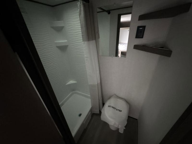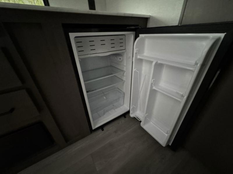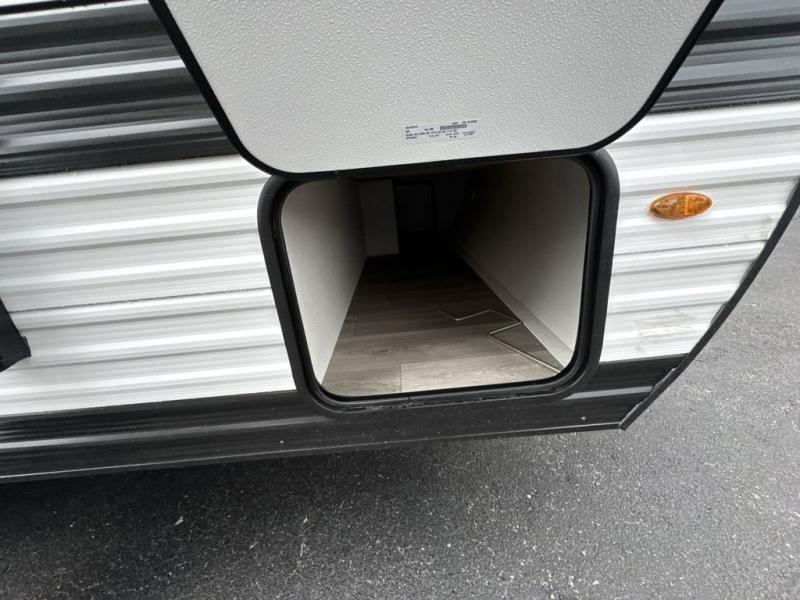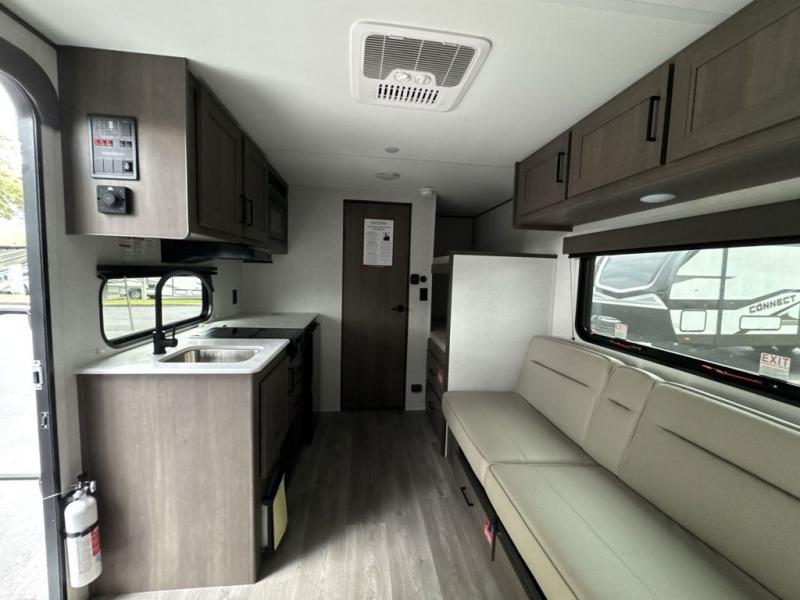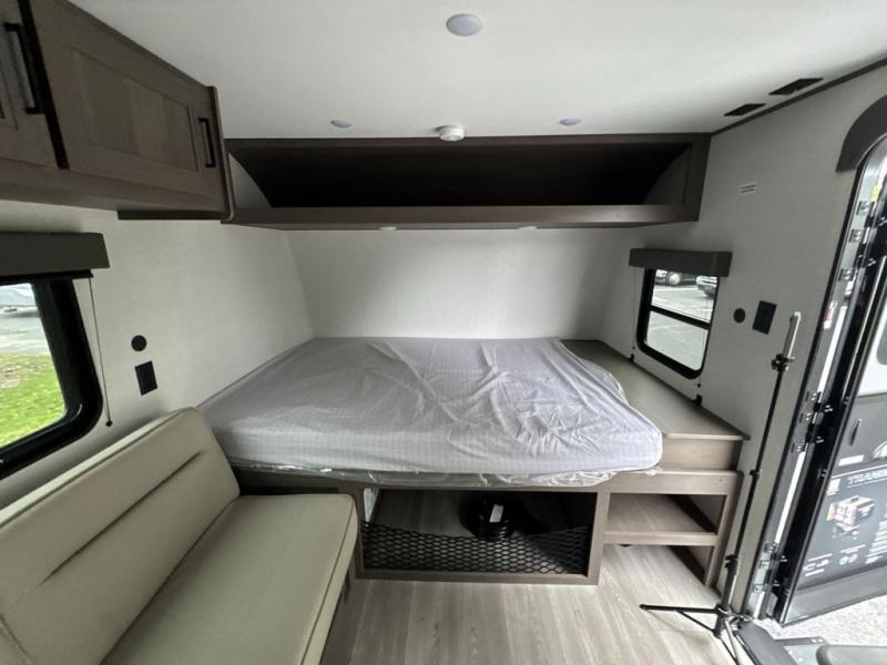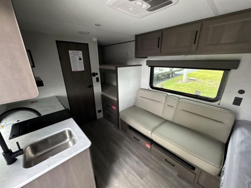 Camping trips to the lake have never been easier than with this travel trailer! The 28" x 67" bunks are right next to the private bath for easy nighttime use, and the front queen bed includes hidden storage for your things. There is also a 66" Jack knife sofa that provides a little more sleeping space for guests. A kitchen lets you cook meals each day and there is an exterior LP quick connect if you want to fire up your own propane grill.