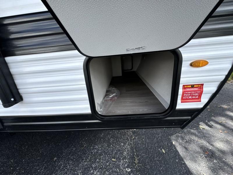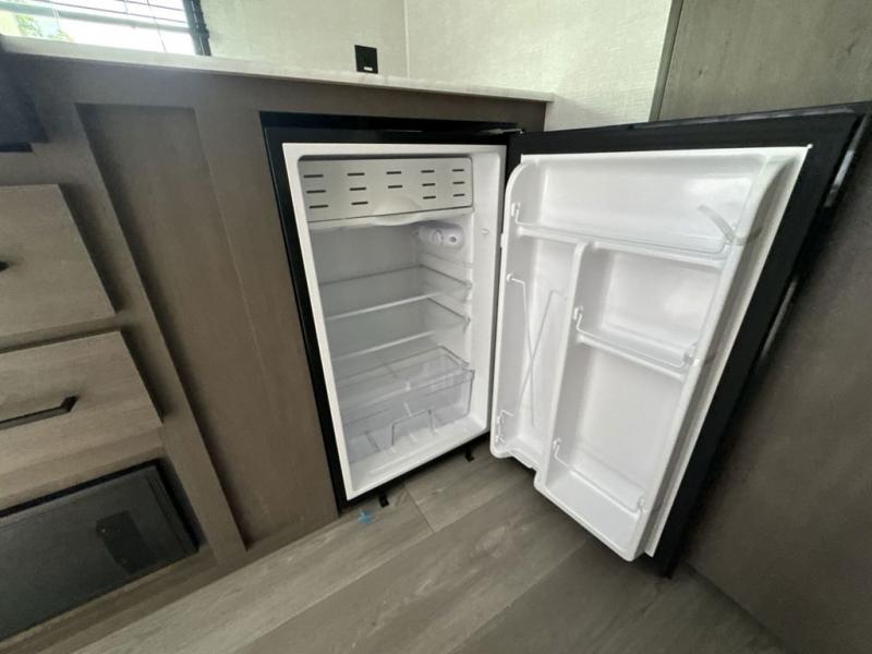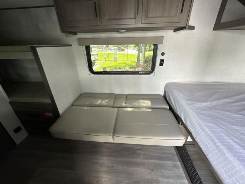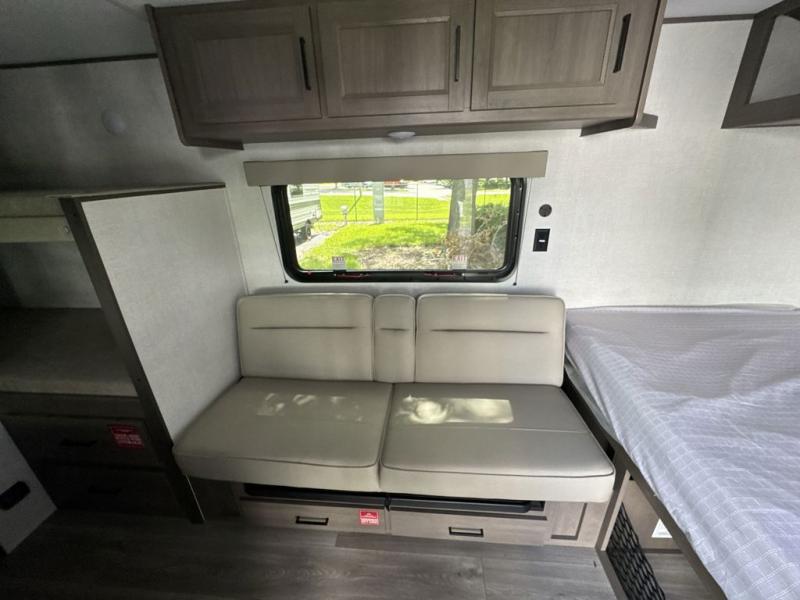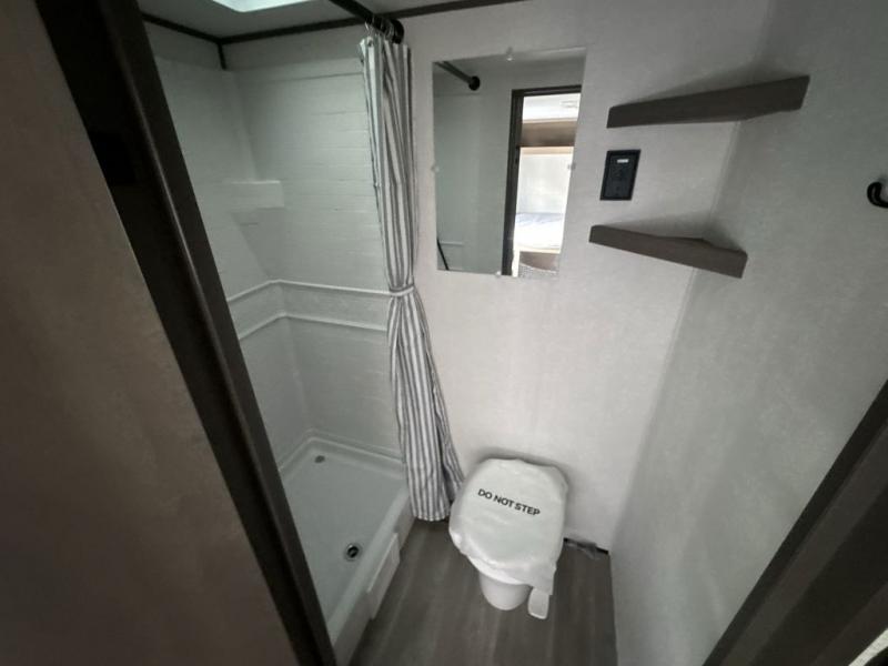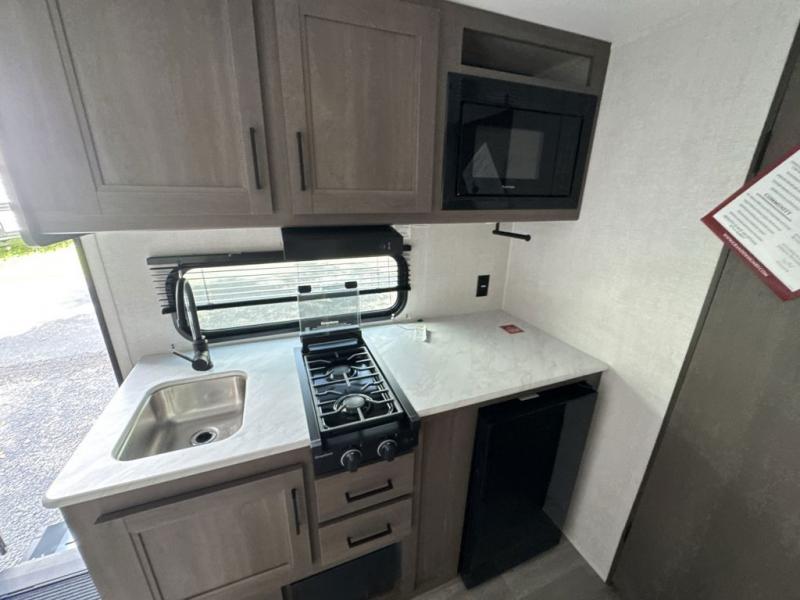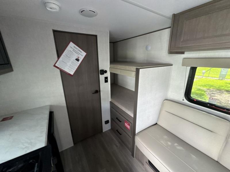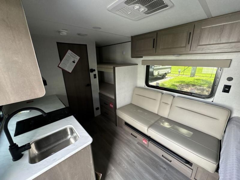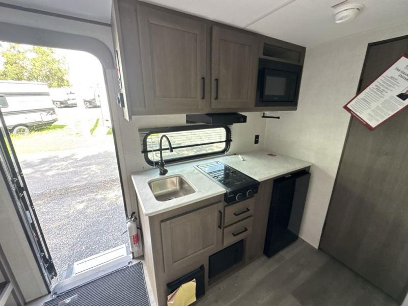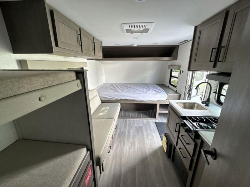 Camping trips to the lake have never been easier than with this travel trailer! The 28" x 67" bunks are right next to the private bath for easy nighttime use, and the front queen bed includes hidden storage for your things. There is also a 66" Jack knife sofa that provides a little more sleeping space for guests. A kitchen lets you cook meals each day and there is an exterior LP quick connect if you want to fire up your own propane grill.