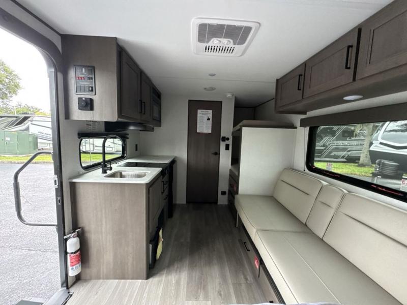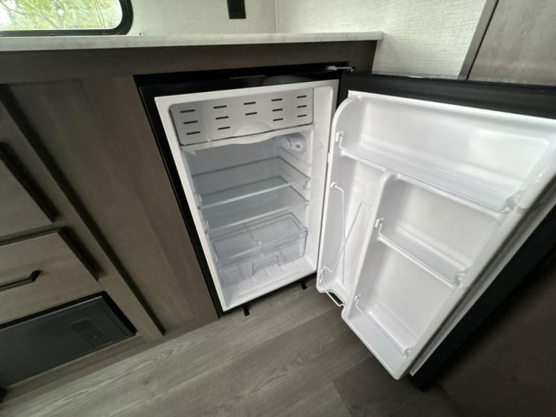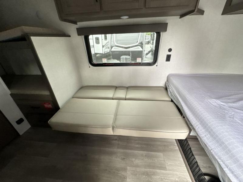 Camping trips to the lake have never been easier than with this travel trailer! The 28" x 67" bunks are right next to the private bath for easy nighttime use, and the front queen bed includes hidden storage for your things. There is also a 66" Jack knife sofa that provides a little more sleeping space for guests. A kitchen lets you cook meals each day and there is an exterior LP quick connect if you want to fire up your own propane grill.